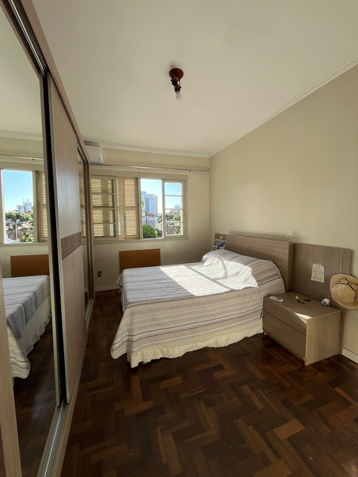 Quarto principal arejado e ensolarado em piso parque com janelas amplas e sol da manhã.