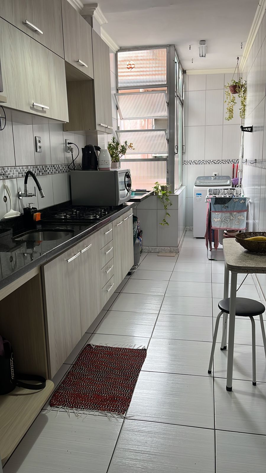Área de serviço separada arejada e iluminada totalmente revestida em cerâmica.