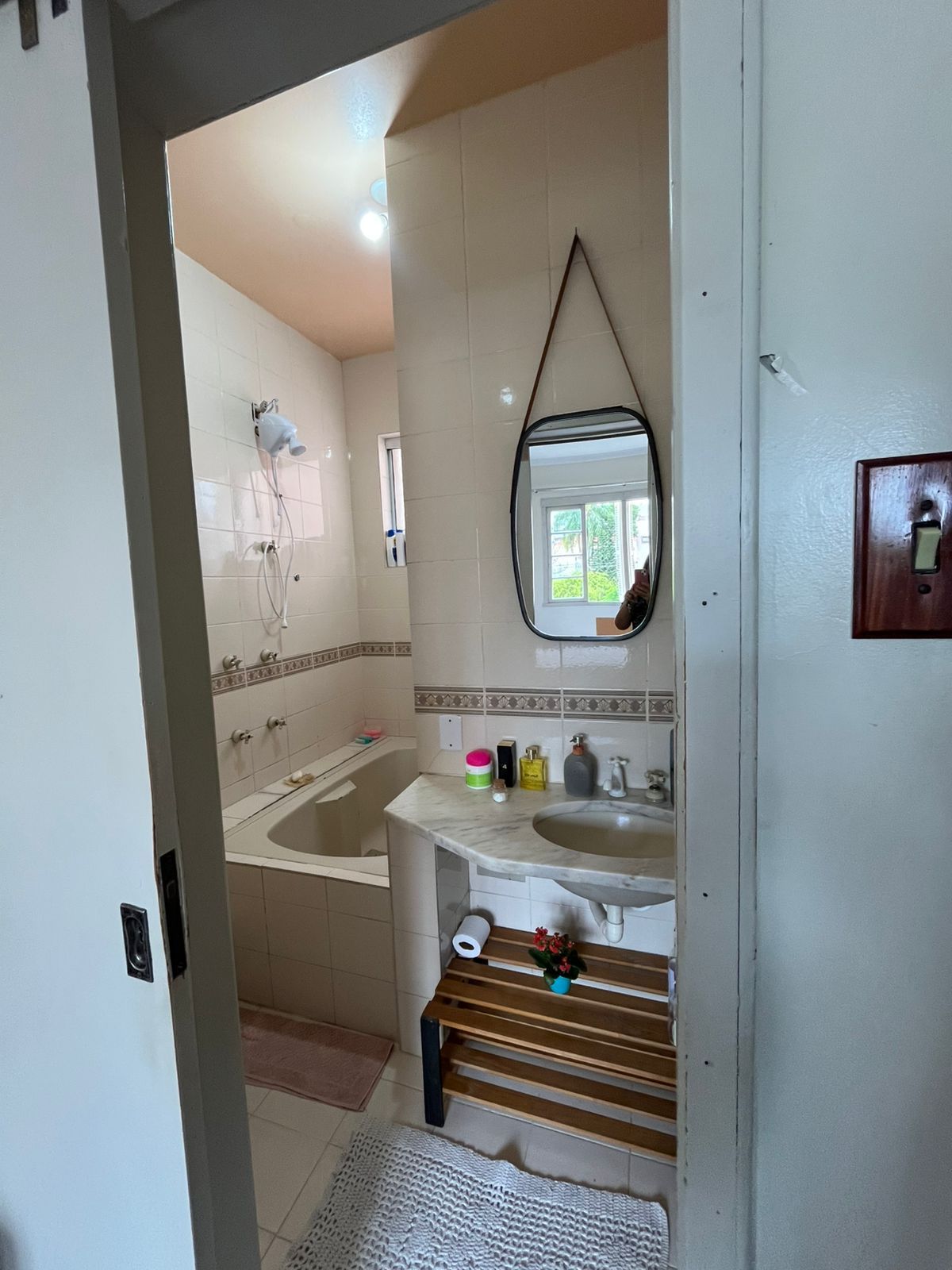 Banheiro com banheira arejado e iluminado com janela com abertura para o exterior.