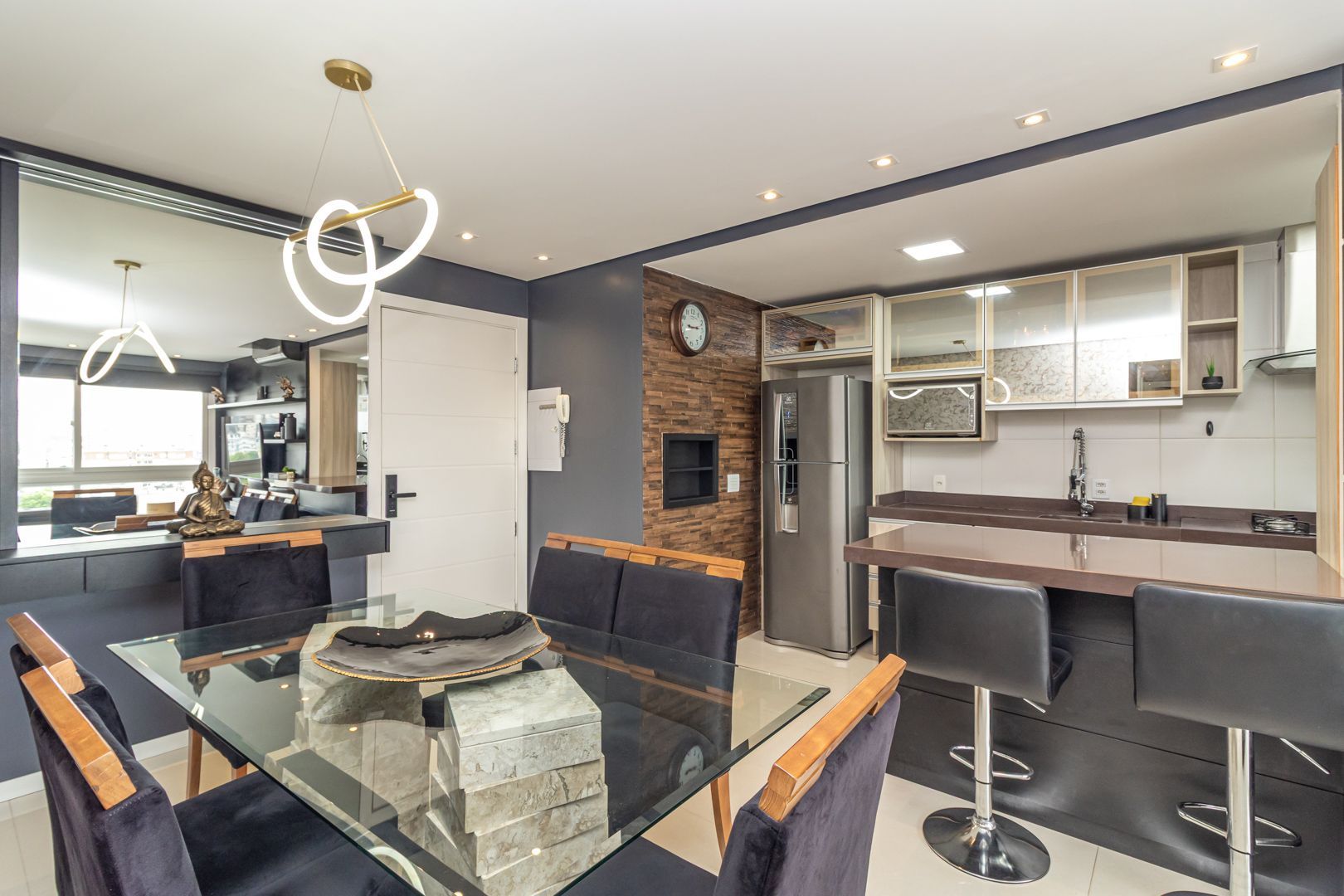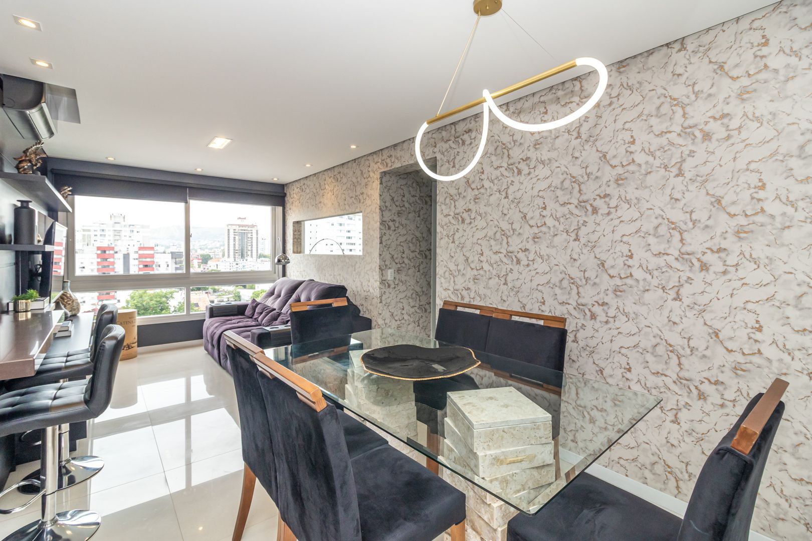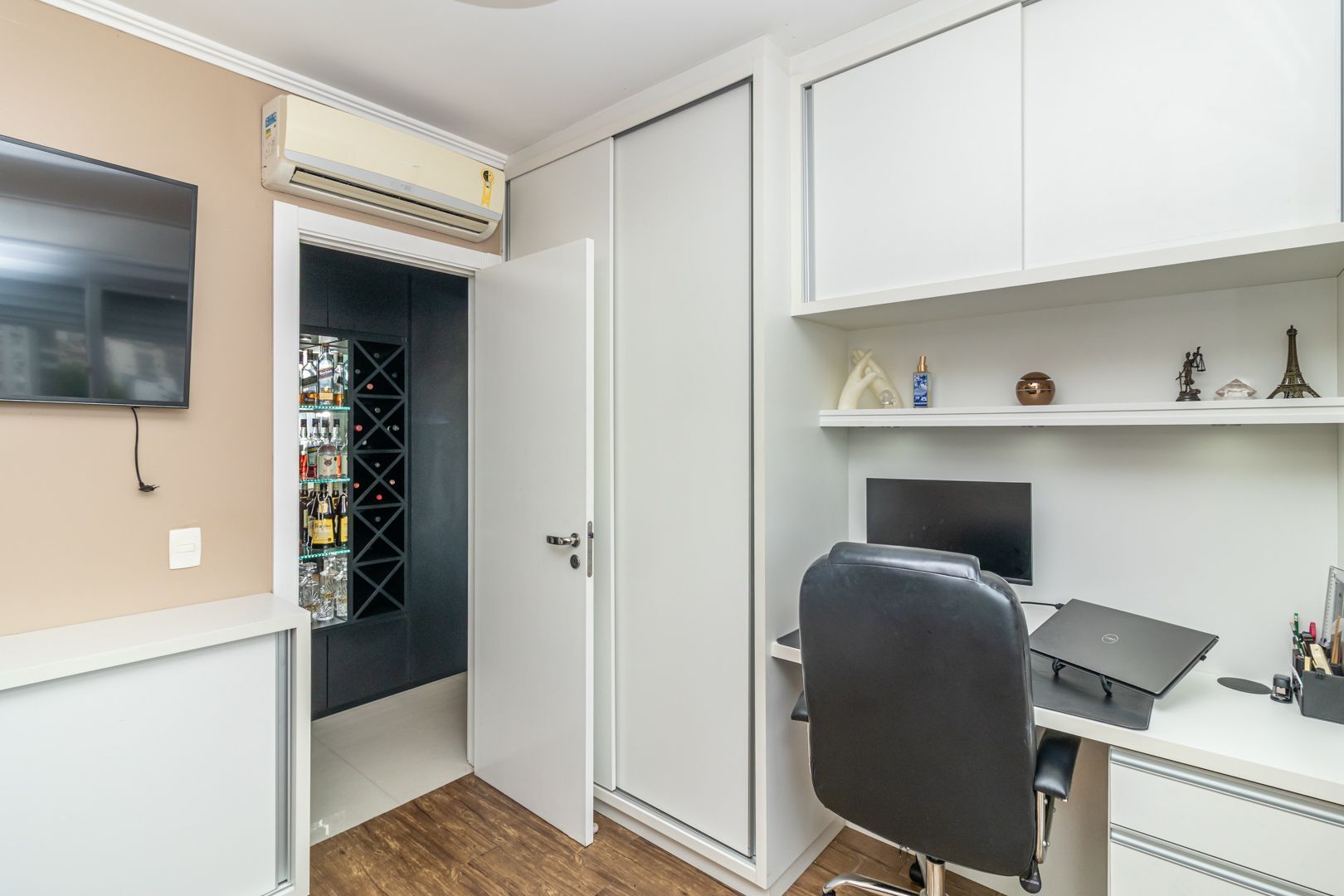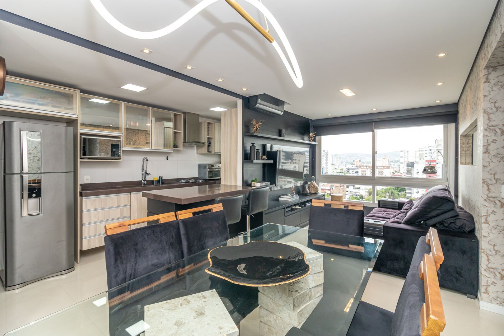 Belíssimo apartamento totalmente decorado com móveis sob medida de alta qualidade. Cozinha integrada com lavanderia, sala de estar e jantar para 6 pessoas. Bar e adega sob medida na circulação. Home office/rouparia e dormitório de hóspedes. 01 suíte com muito espaço e armários sob medida. Pedras das bancadas em quartzo marrom. 2 banheiros, sendo o social com cuba esculpida. Muito bem iluminado e ventilado, vista livre. Permanecem no imóvel todos os splits, todos os móveis sob medida, todas as luminárias, e a maioria dos eletrodomésticos.