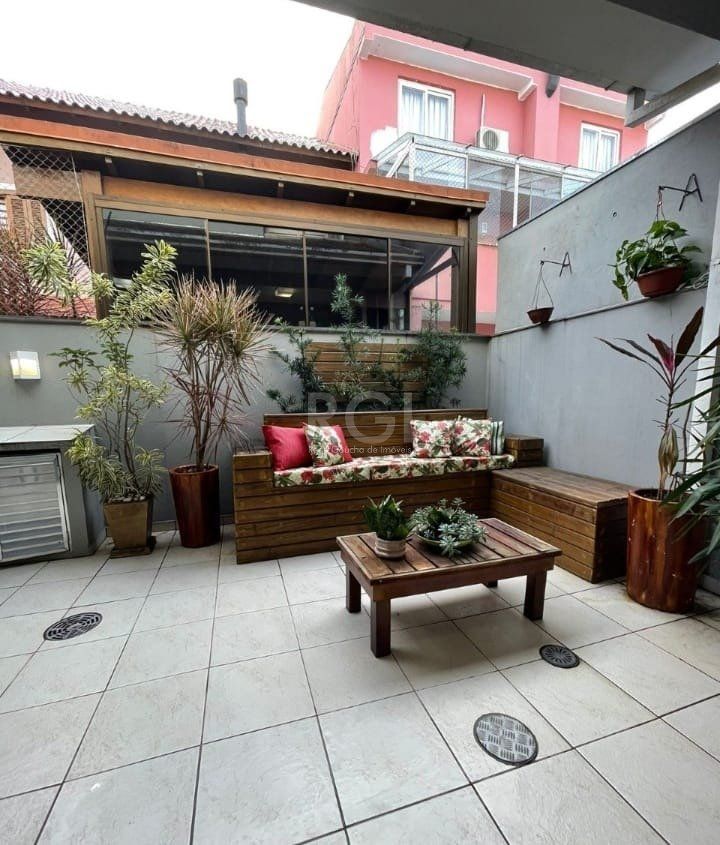 Pátio com churrasqueira, living para dois ambientes, todo em porcelanato com lareira.