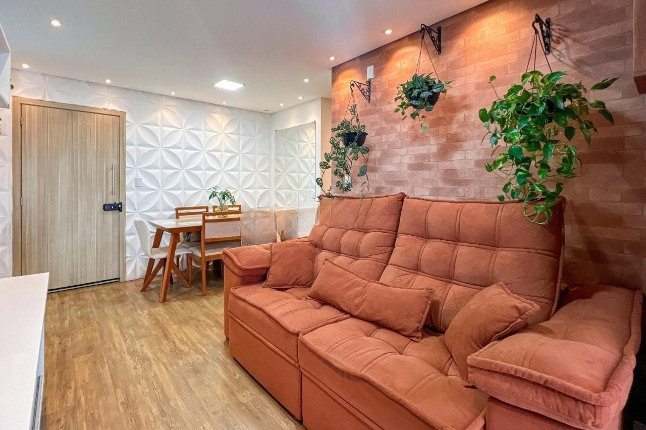 Sala com ambiente iluminado, cozinha americana planejada, com área de serviço com 2 quartos e 2 banheiros com ventilação natural.