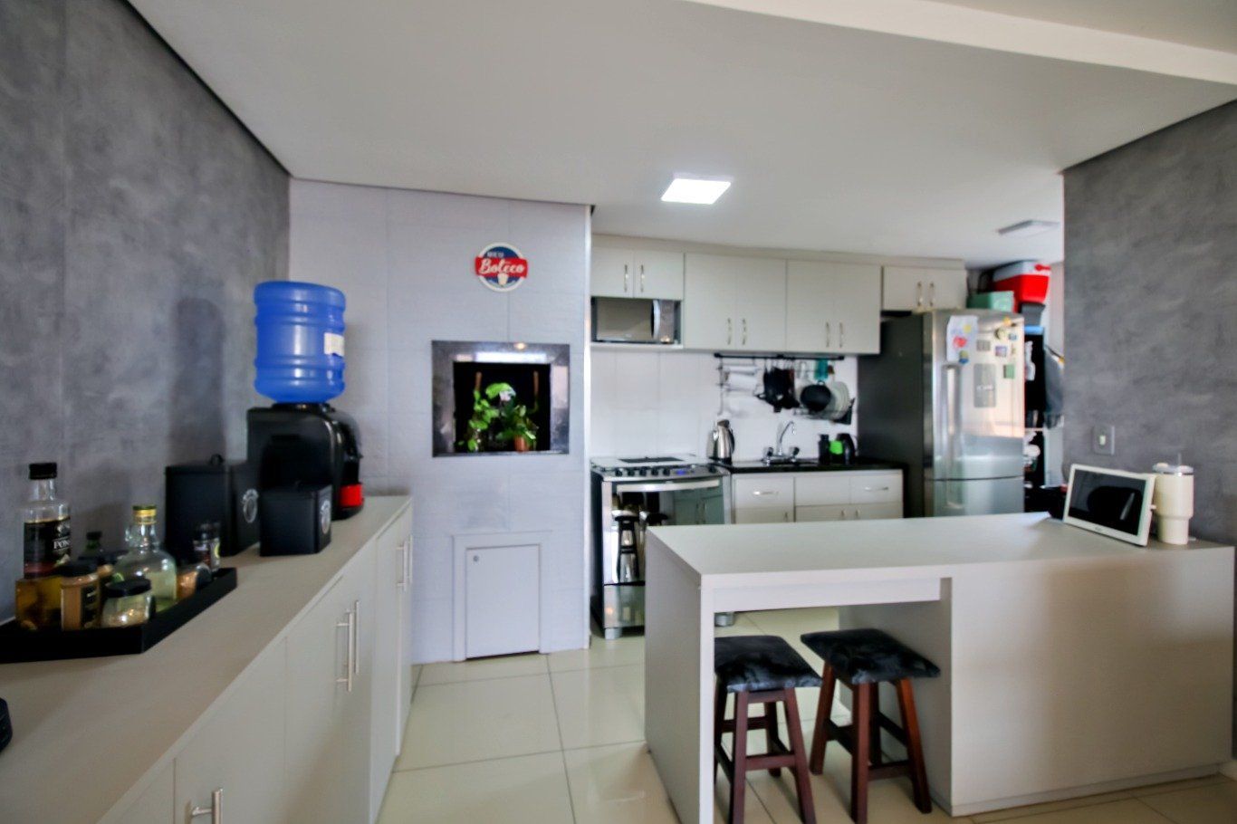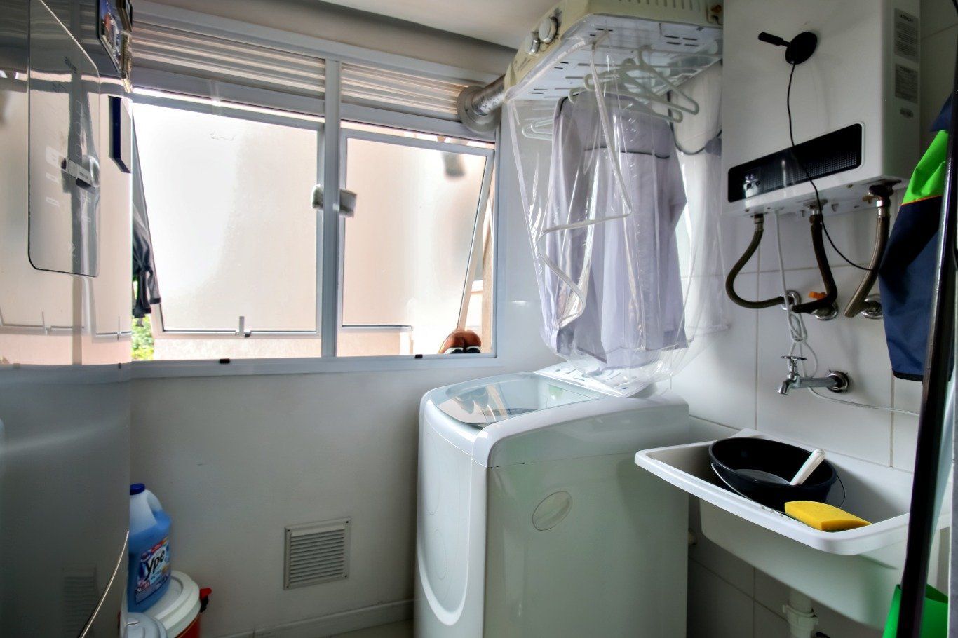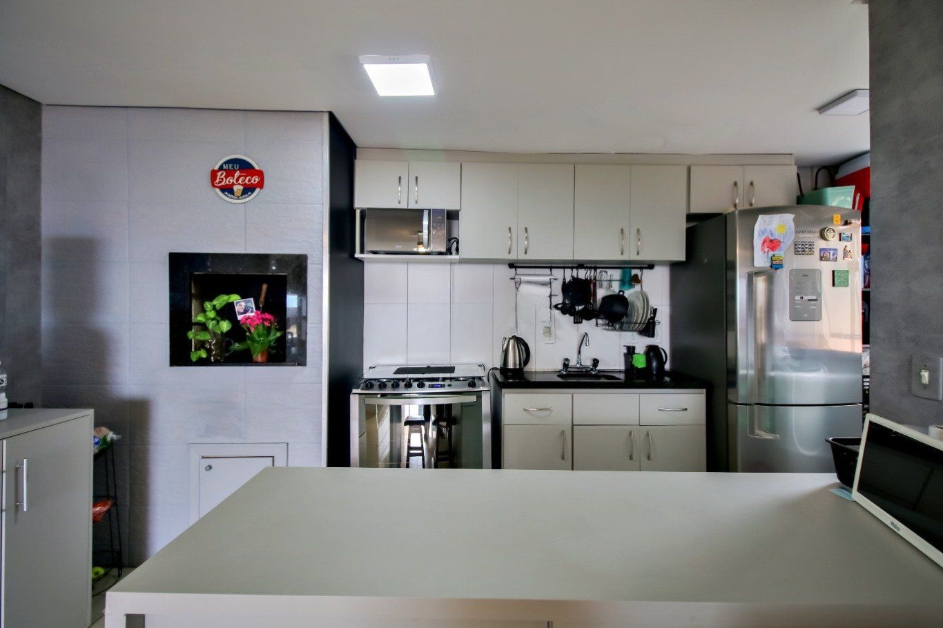 Cozinha americana com churrasqueira, móveis planejados e integração com a lavanderia. Ambientes com janelas que garantem boa ventilação e luminosidade.