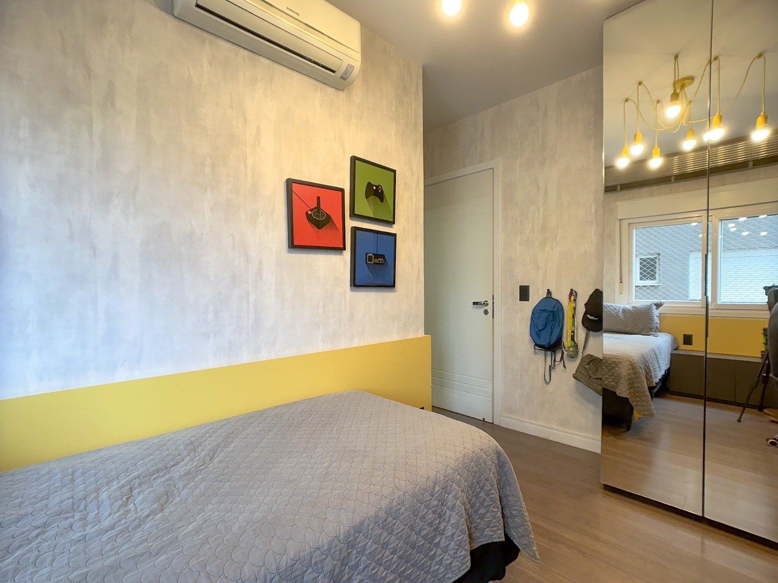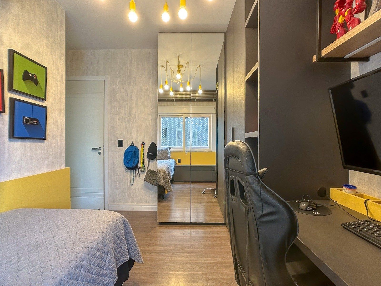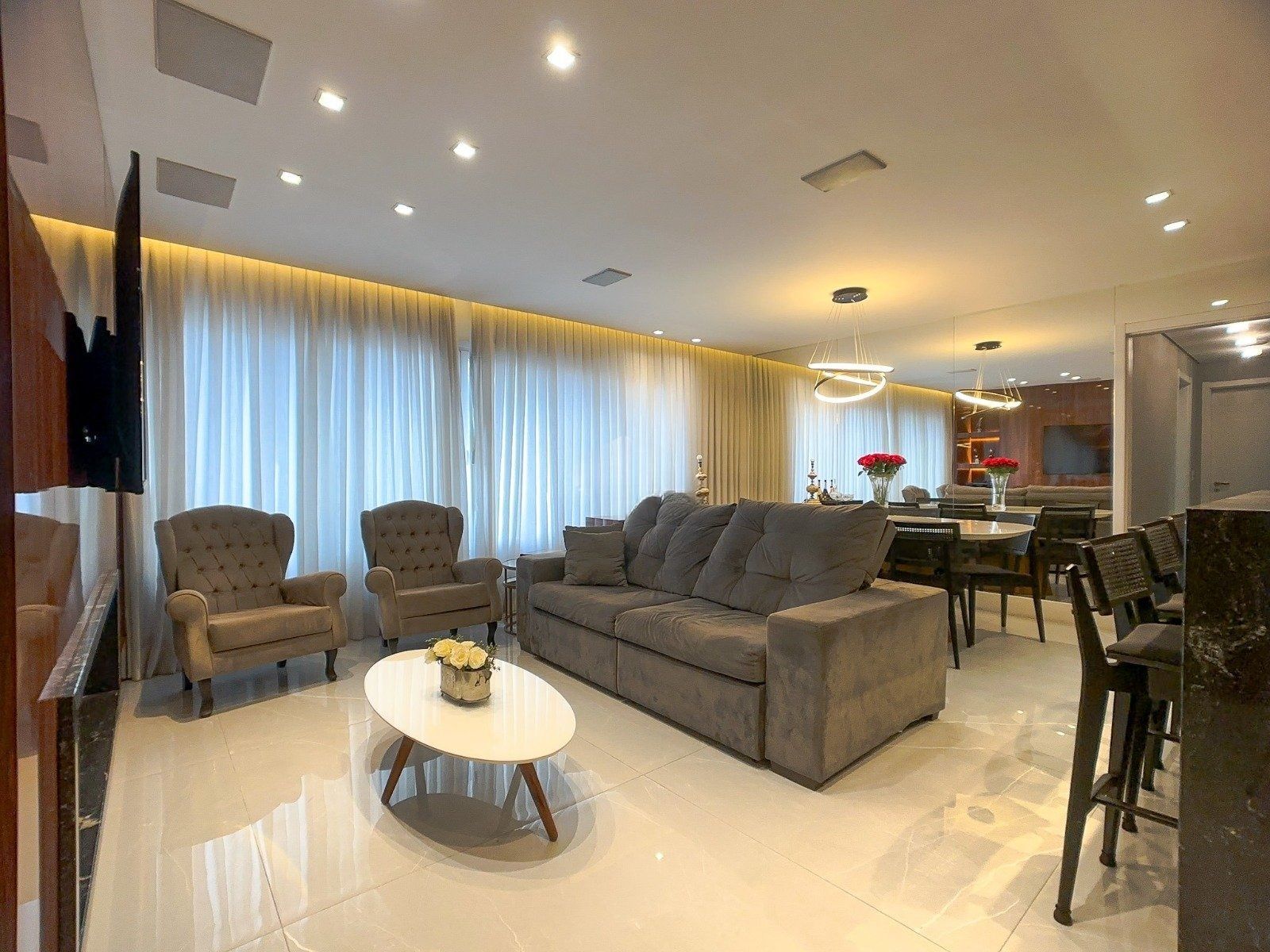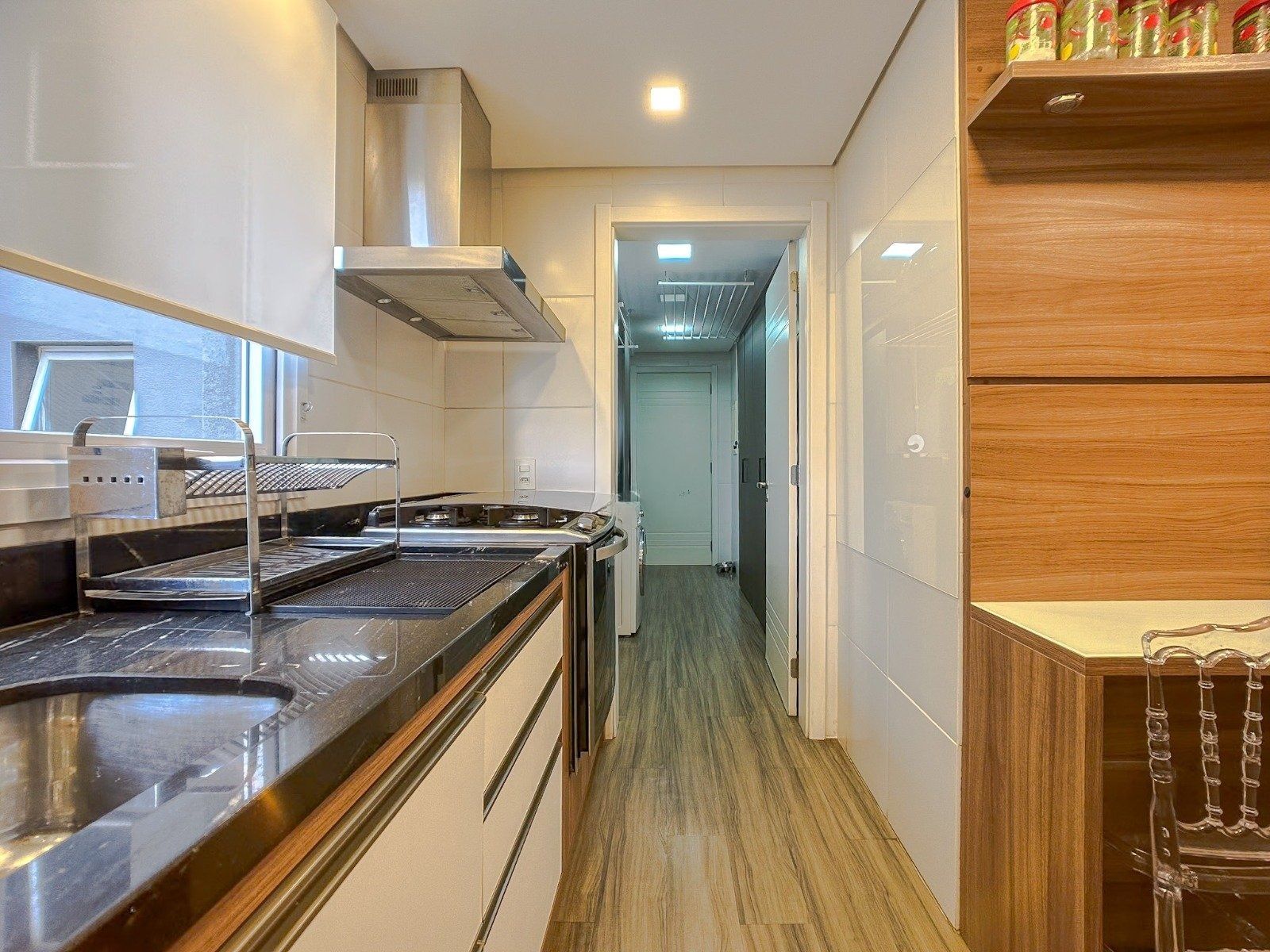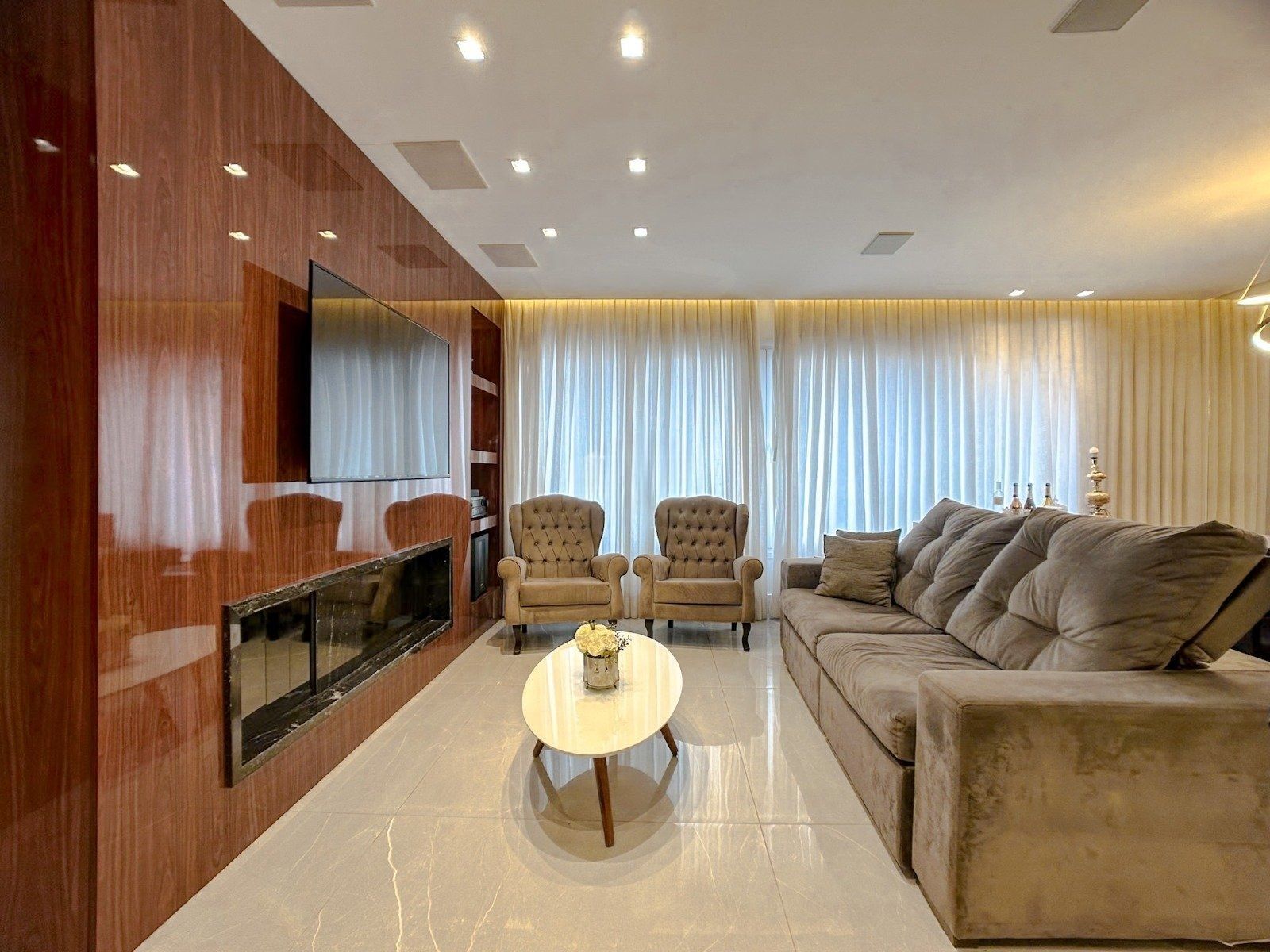 Este apartamento de 128m² privativos é semi mobiliado e conta com 3 suítes, lavabo, amplo living com lareira, espaço gourmet com churrasqueira, cozinha planejada, área de serviço e banheiro auxiliar. A unidade dispõe ainda de vaga dupla, coberta e escriturada.