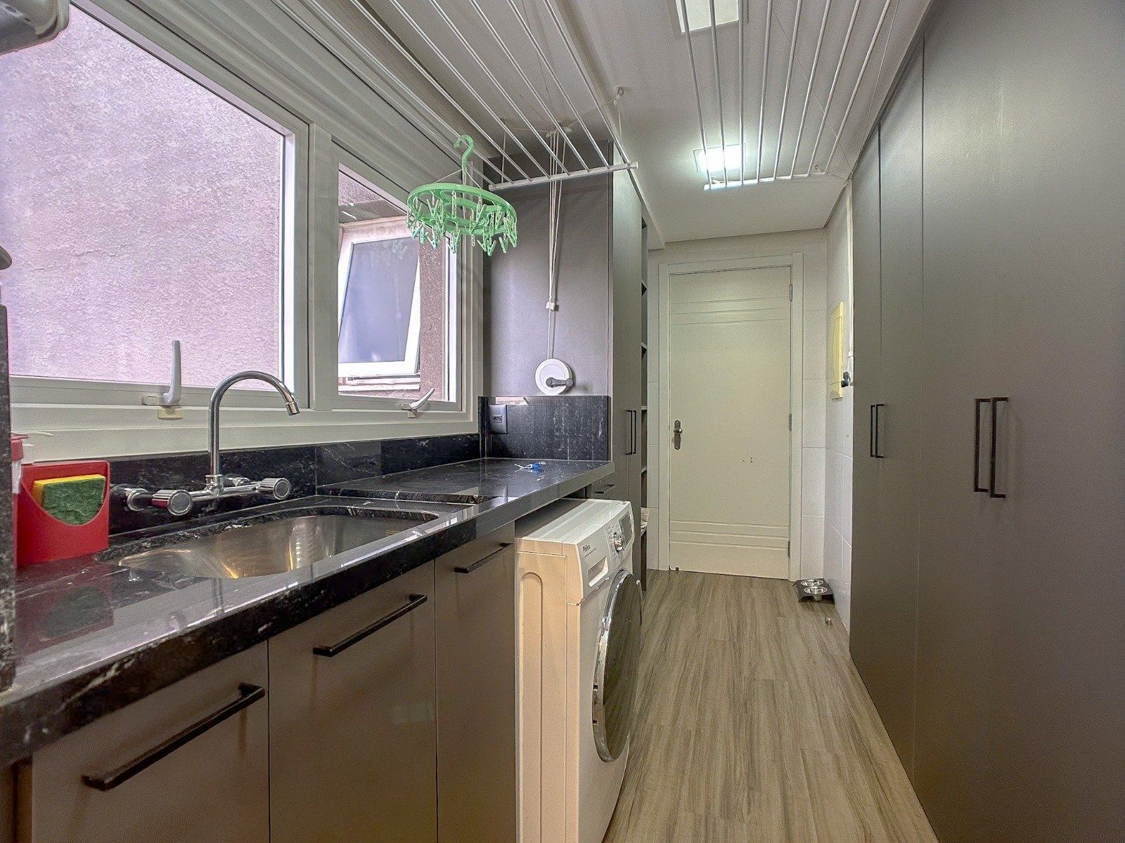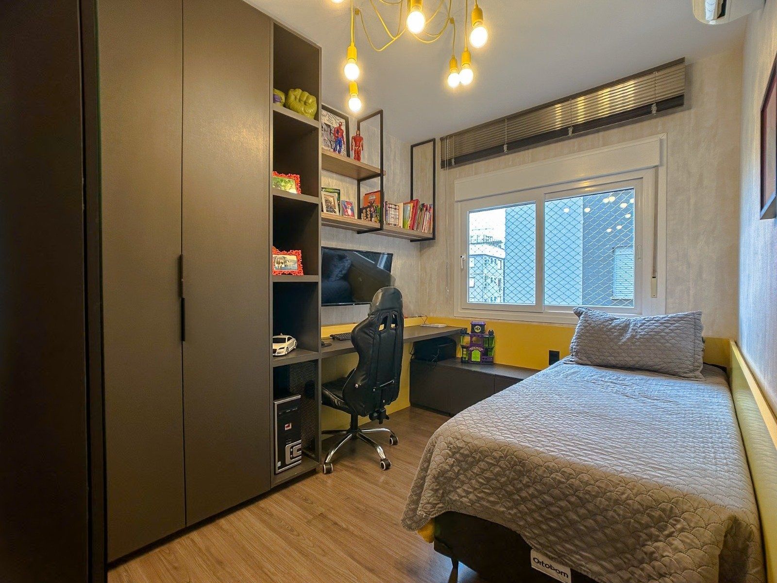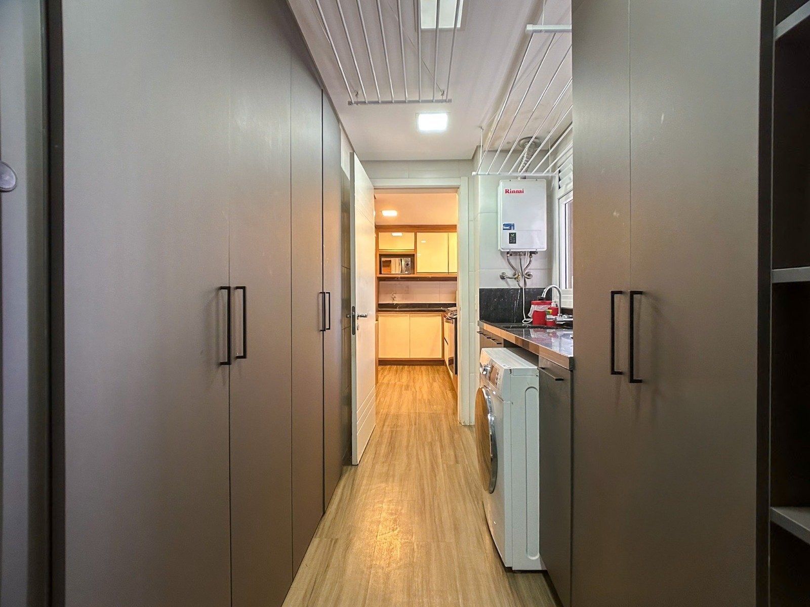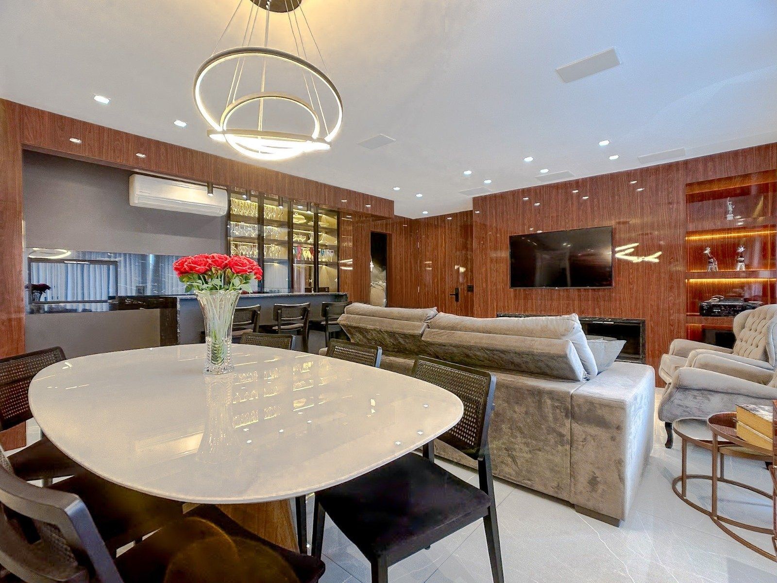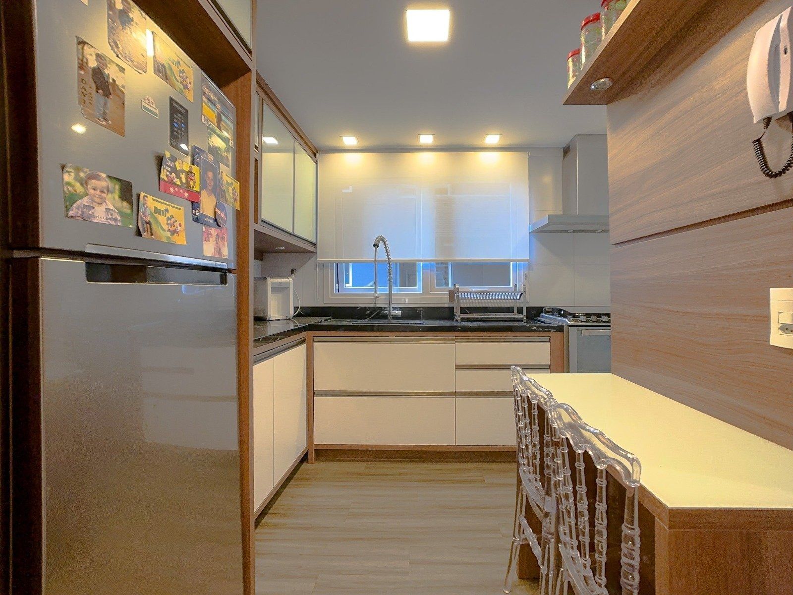 Este apartamento de 128m² privativos é semi mobiliado e conta com 3 suítes, lavabo, amplo living com lareira, espaço gourmet com churrasqueira, cozinha planejada, área de serviço e banheiro auxiliar. A unidade dispõe ainda de vaga dupla, coberta e escriturada.