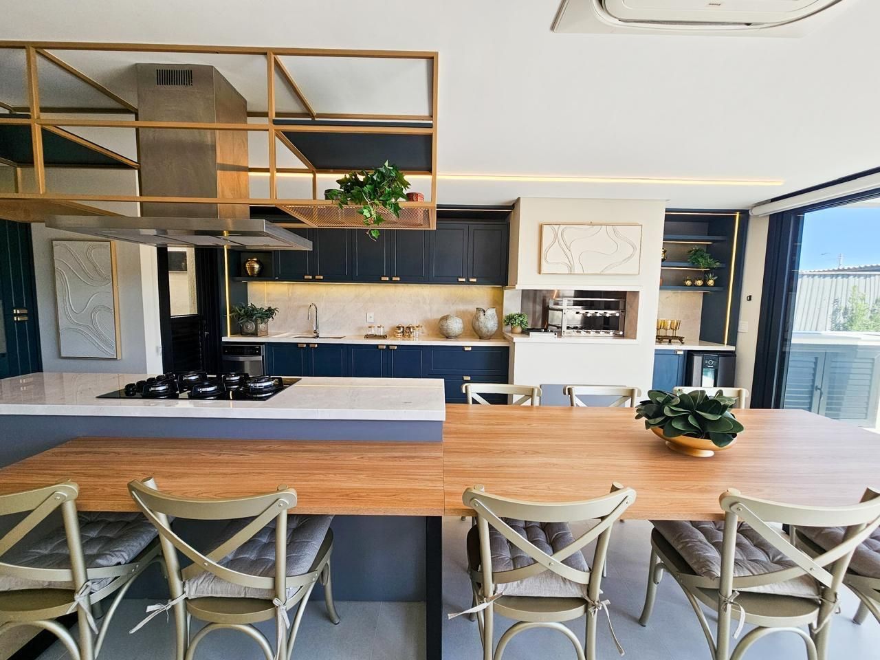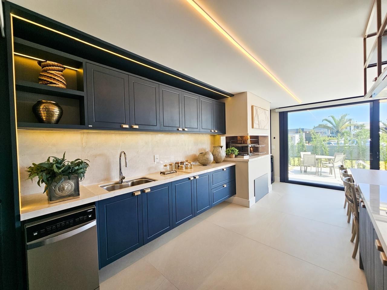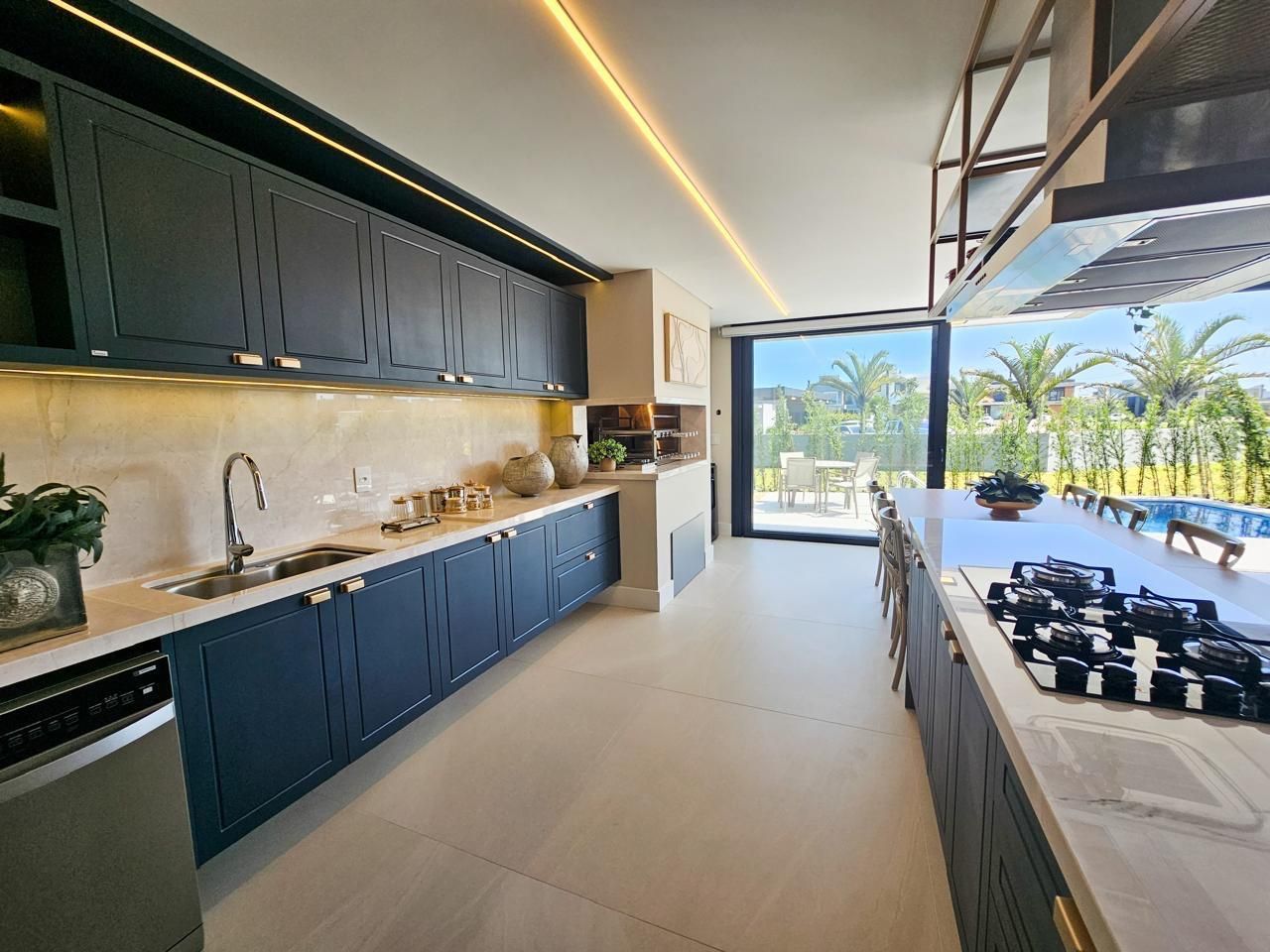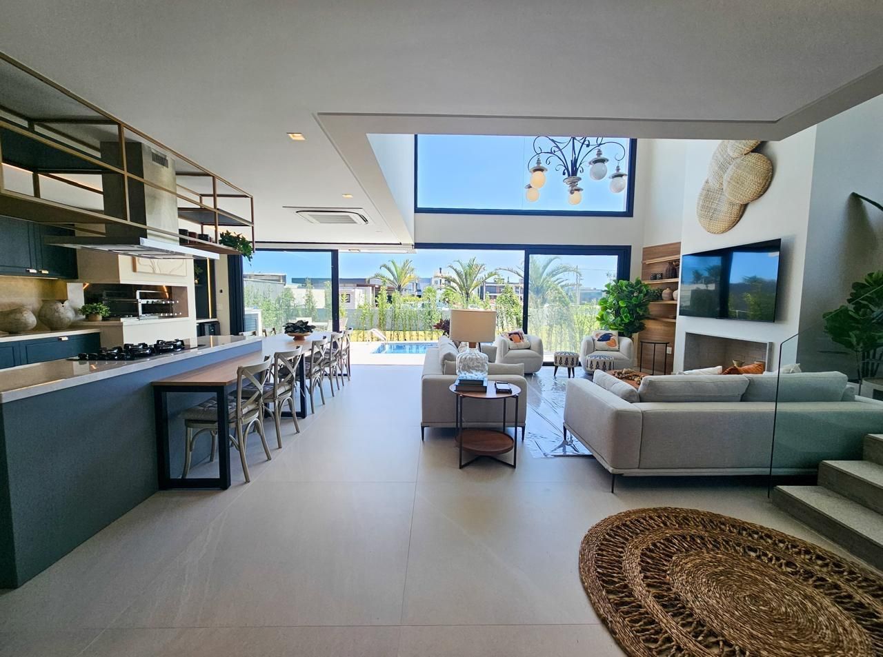 Área social com pé-direito duplo, amplas esquadrias em vidro proporcionando elevada entrada de luz natural e integração total entre estar, jantar e espaço gourmet. Cozinha em conceito aberto com bancada e conexão direta com a área externa.