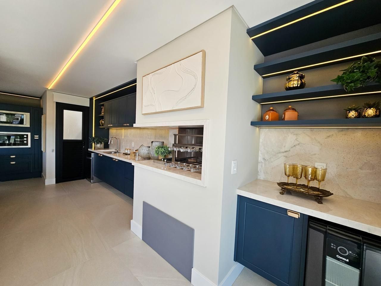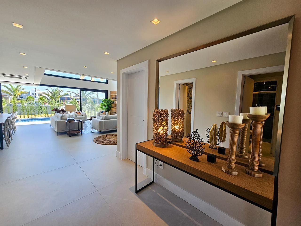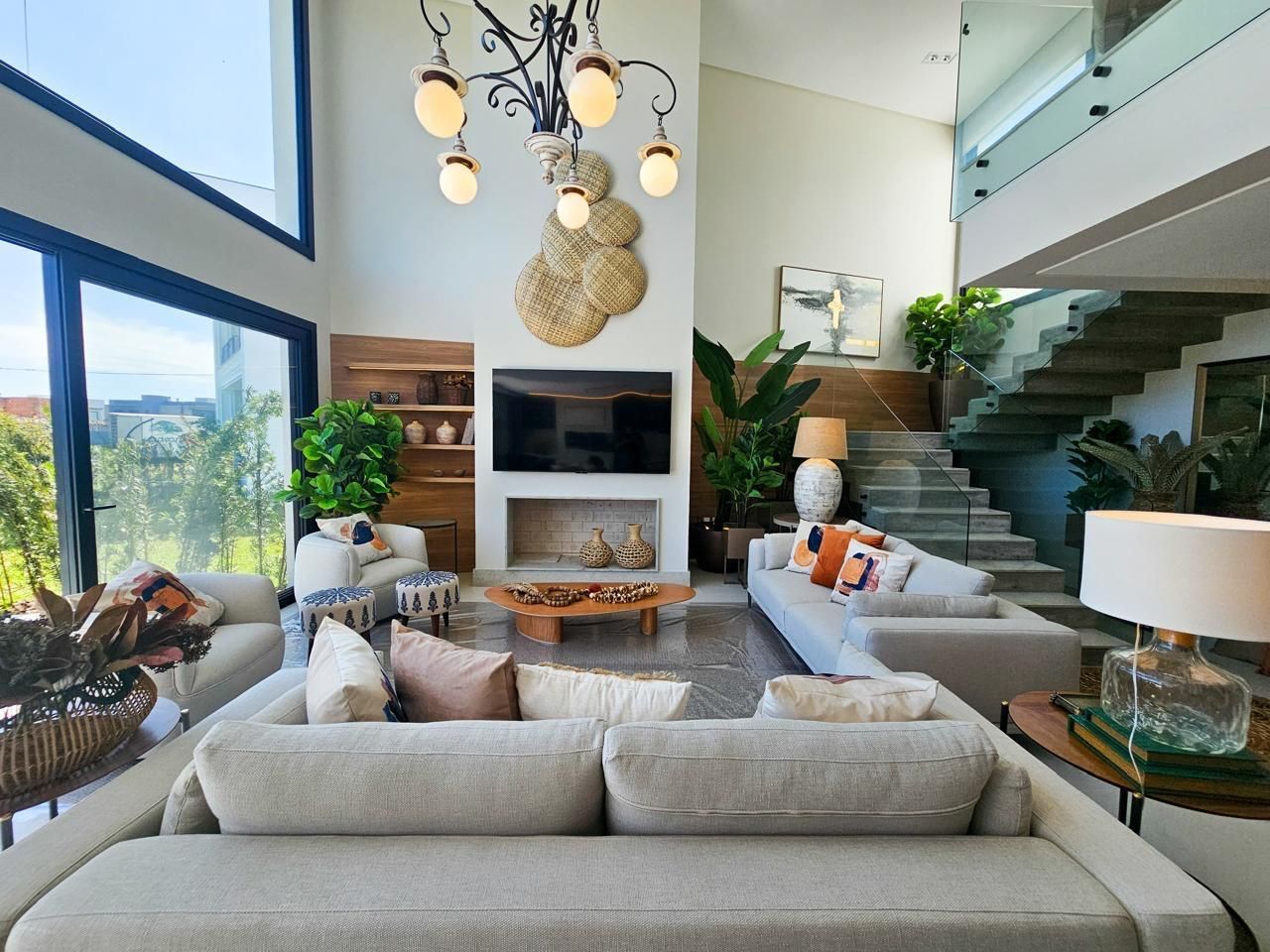 Área social com pé-direito duplo, amplas esquadrias em vidro proporcionando elevada entrada de luz natural e integração total entre estar, jantar e espaço gourmet. Cozinha em conceito aberto com bancada e conexão direta com a área externa.