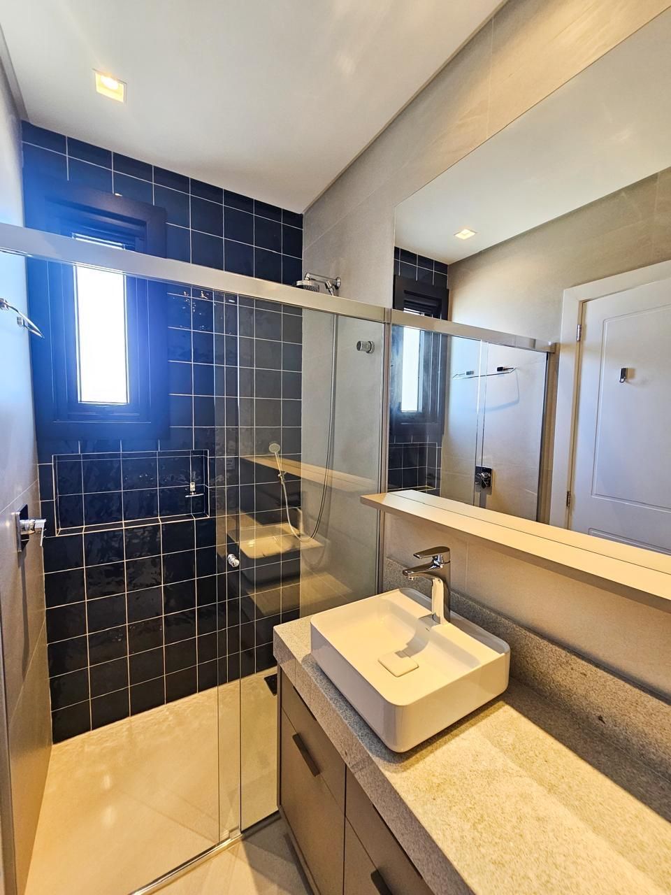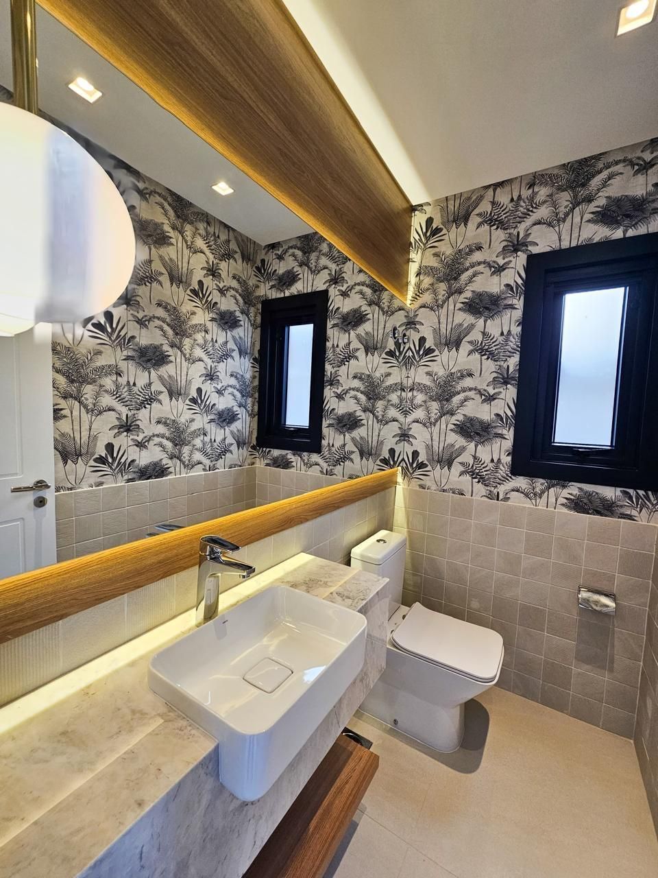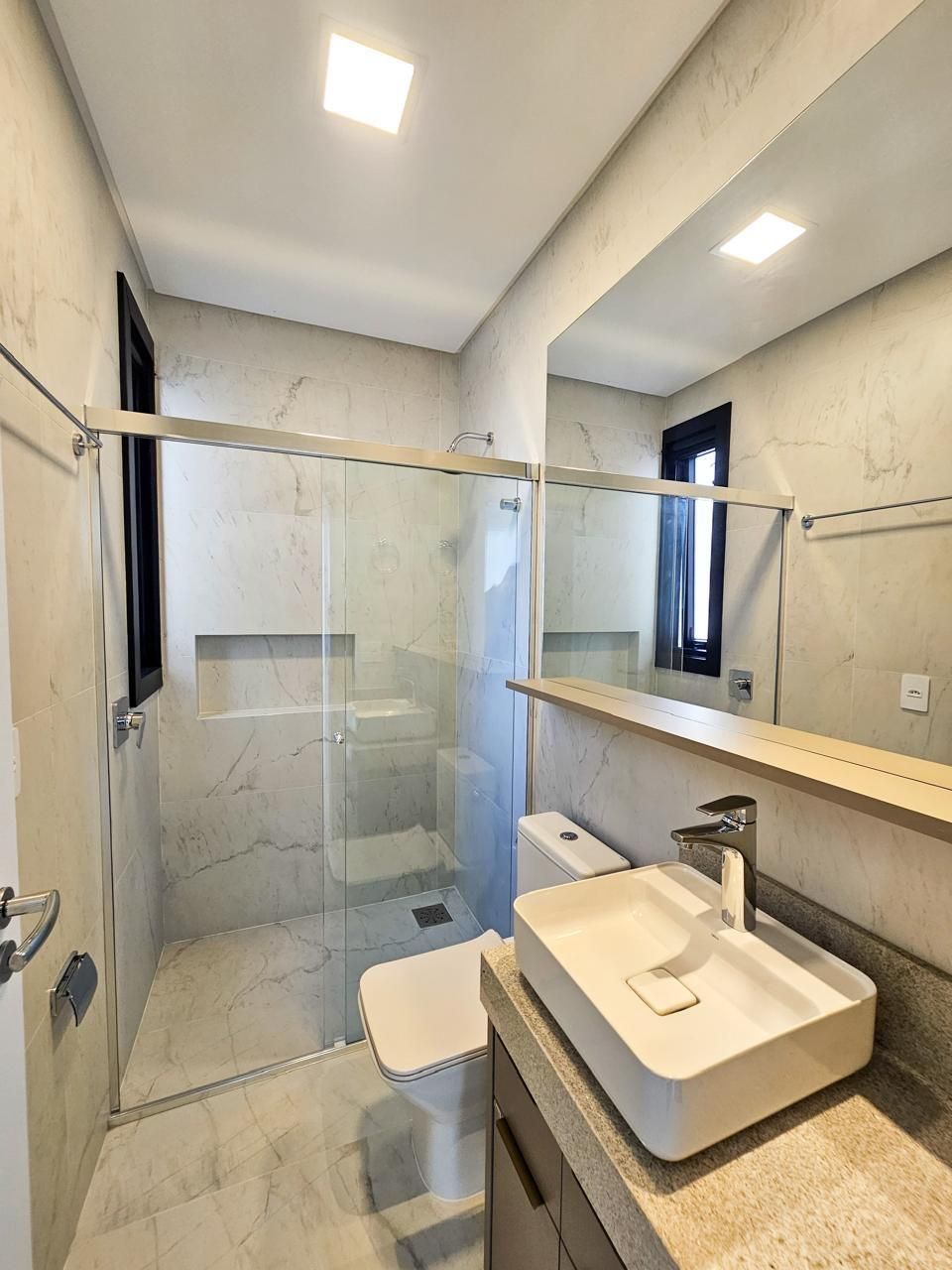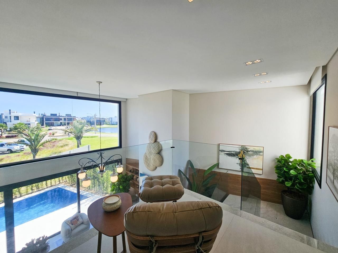 Área social com pé-direito duplo, amplas esquadrias em vidro proporcionando elevada entrada de luz natural e integração total entre estar, jantar e espaço gourmet. Cozinha em conceito aberto com bancada e conexão direta com a área externa.