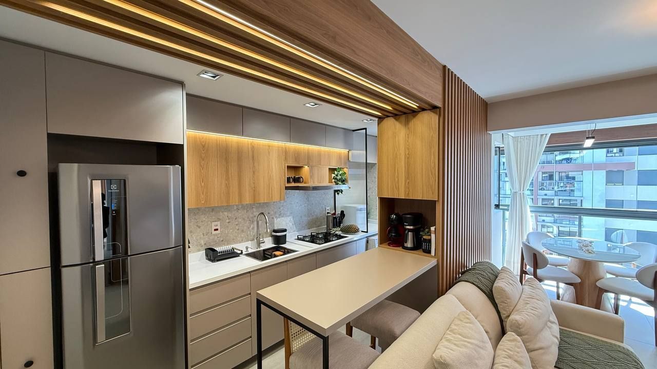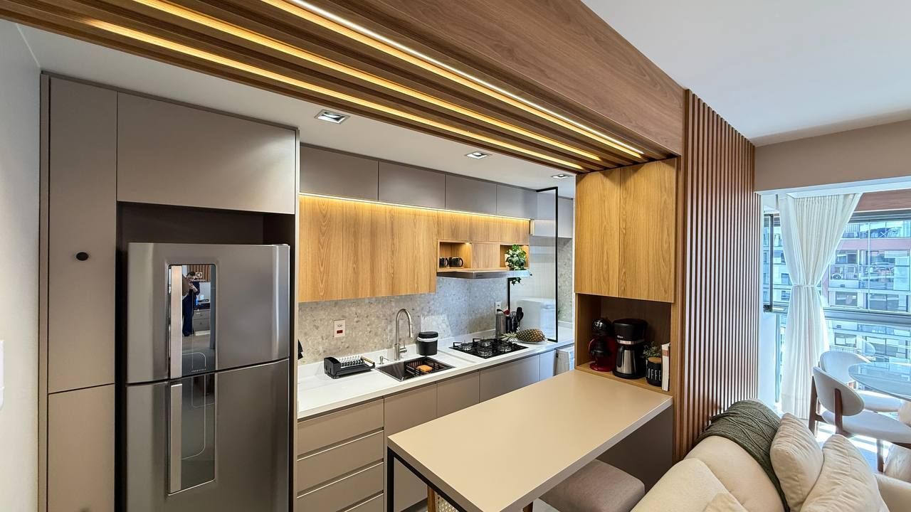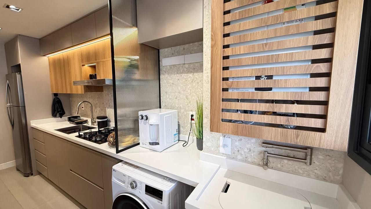 Todos os ambientes contam com acabamentos contemporâneos, iluminação e automação inteligente que possibilita controle de luzes, iluminação LED, persianas e climatização. A integração da sacada amplia o living, oferecendo um espaço perfeito para receber ou relaxar. Além disso, o imóvel ainda dispõe de um espaço home office, atendendo à nova demanda de quem trabalha em casa com conforto e privacidade.