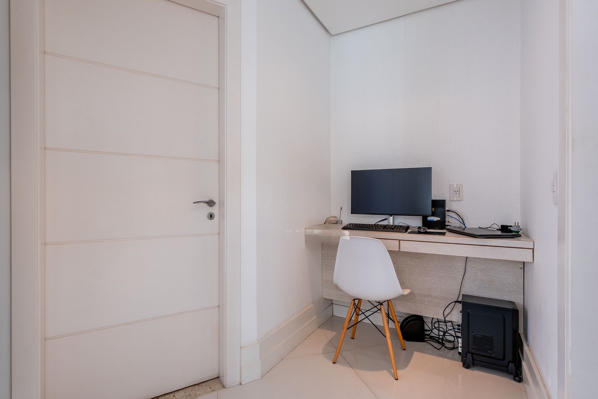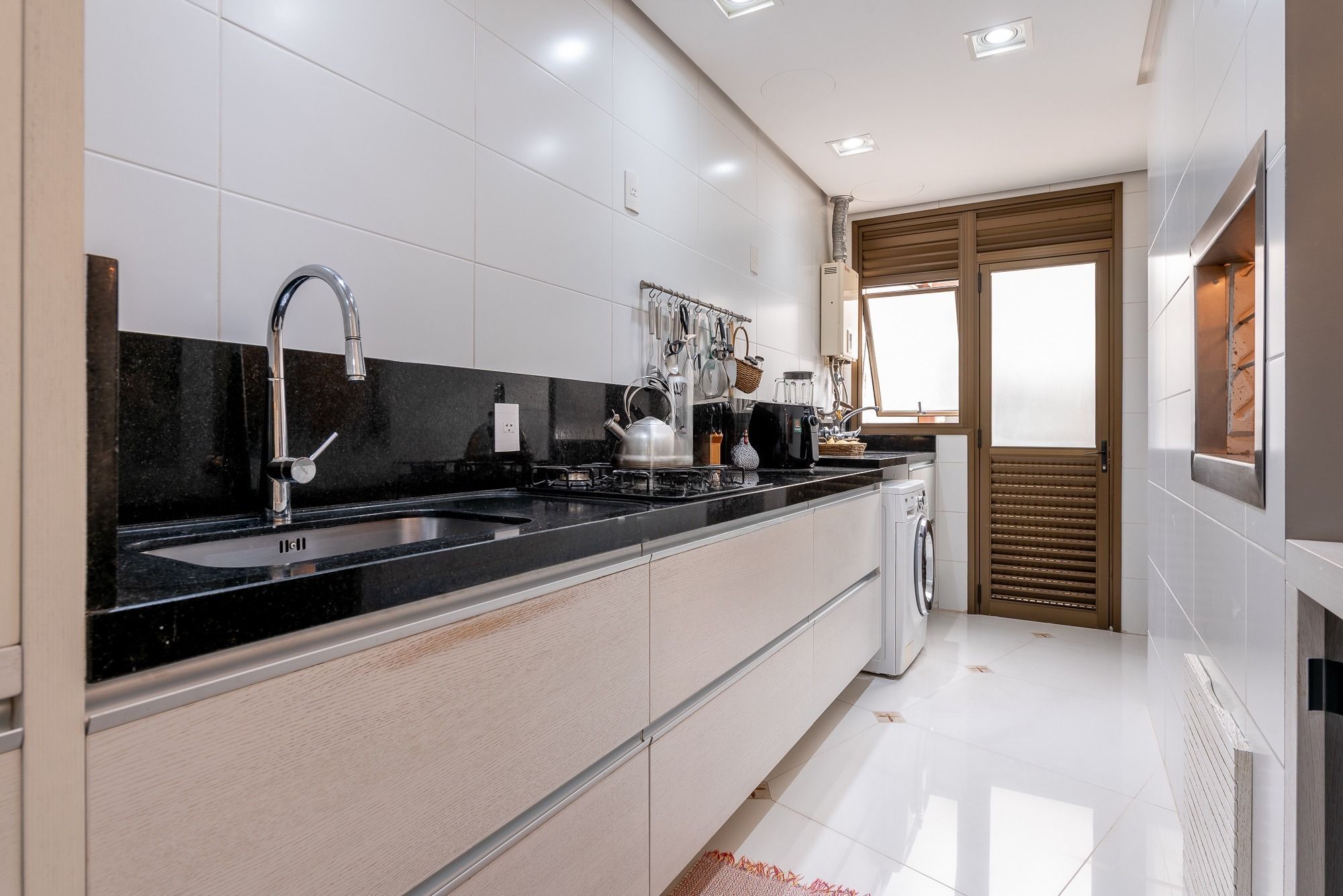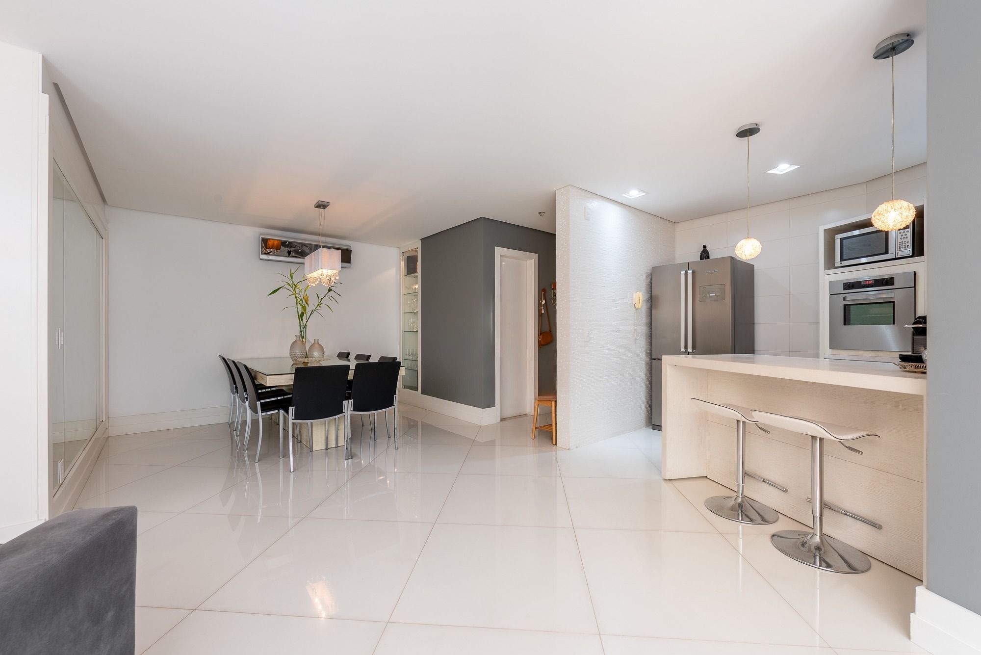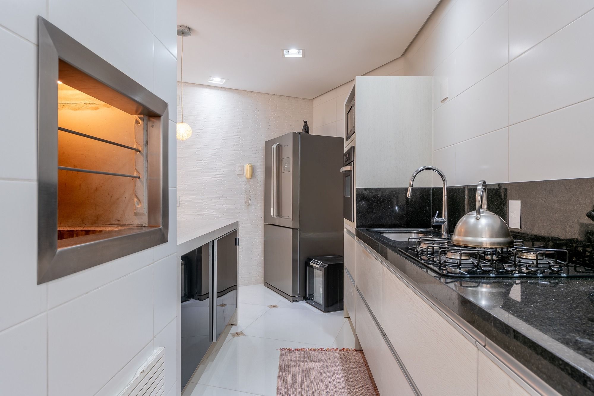 A planta original de três dormitórios foi transformada em dois, criando ambientes ainda mais espaçosos, com fácil reversão. A suíte é confortável, e há também um banheiro social. O living para três ambientes tem lareira, lavabo e espaço para home office, enquanto a cozinha americana com churrasqueira se integra à área de serviço.