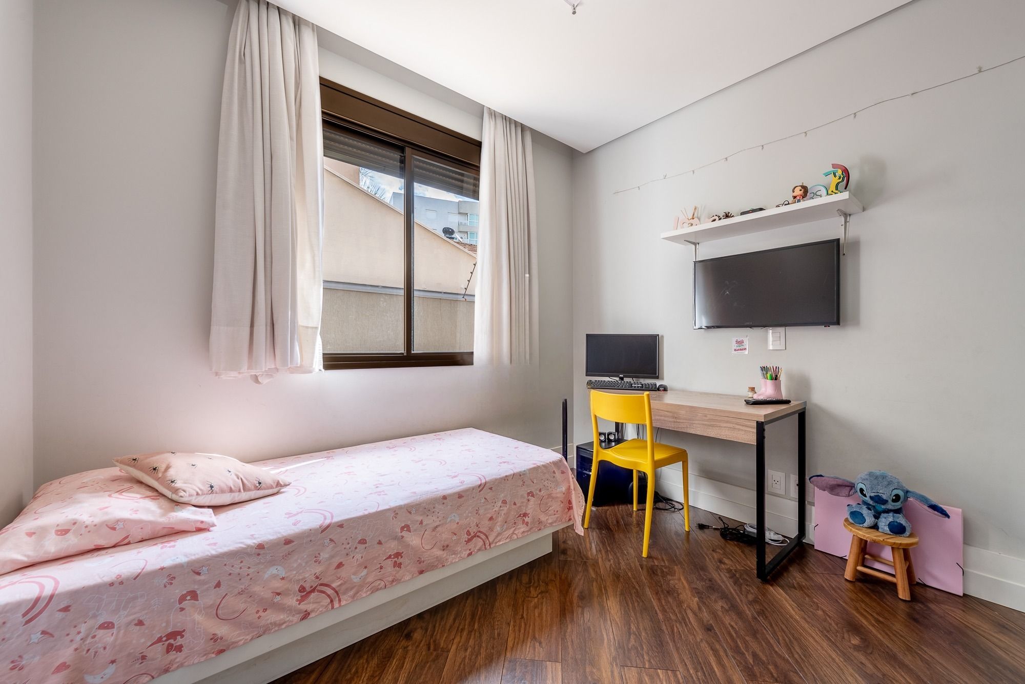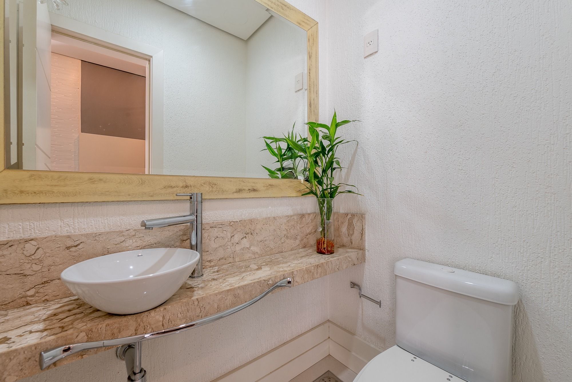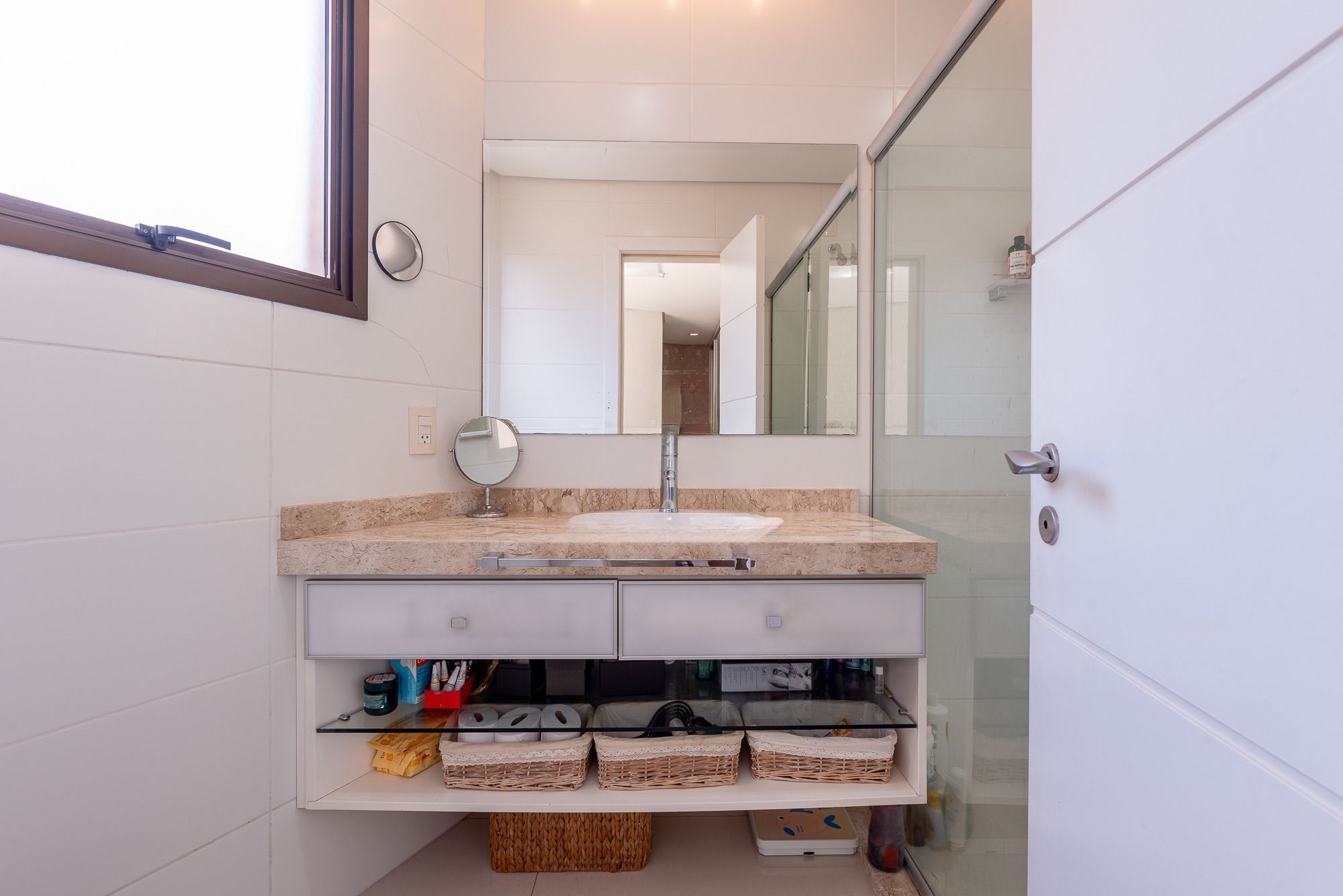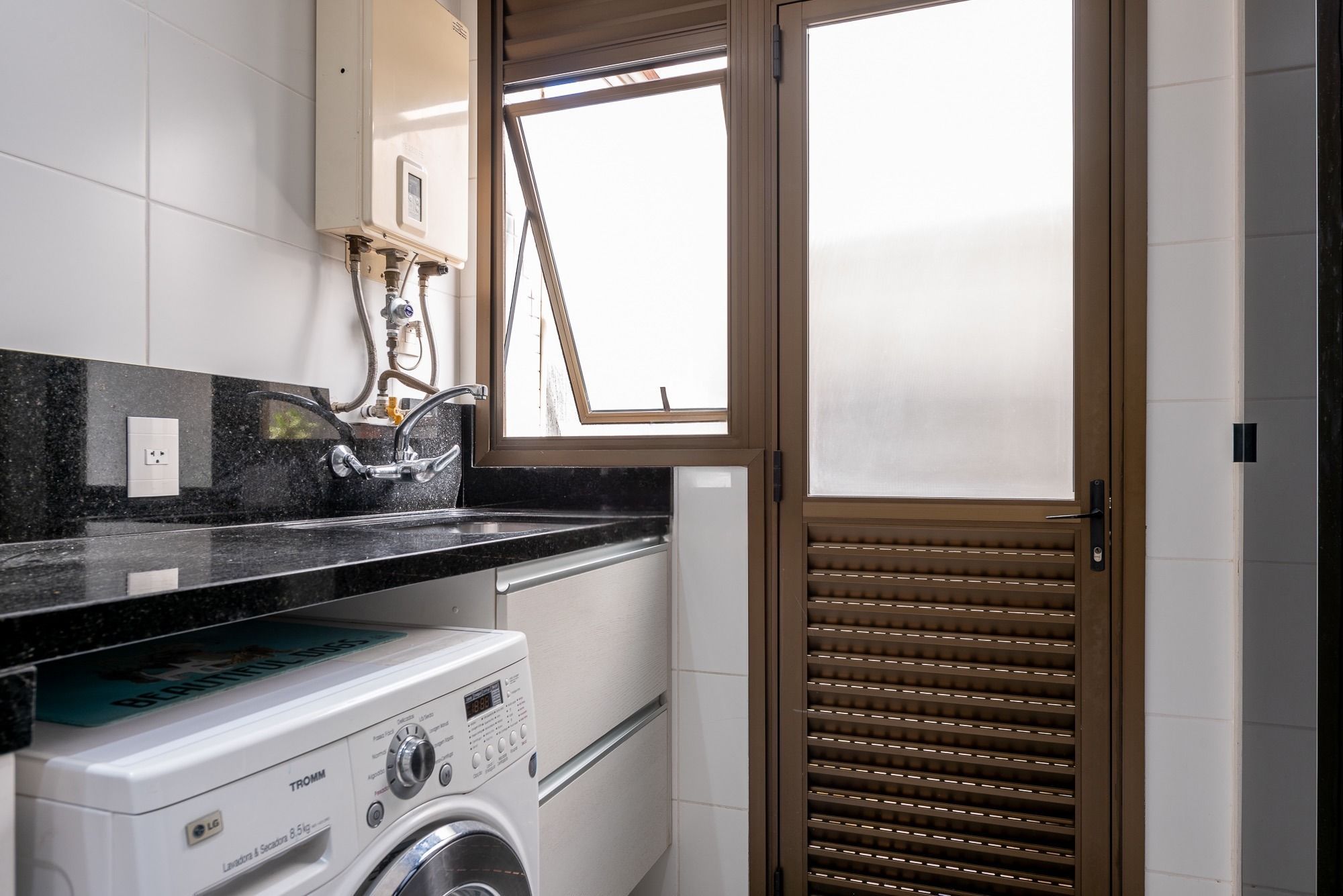 A planta original de três dormitórios foi transformada em dois, criando ambientes ainda mais espaçosos, com fácil reversão. A suíte é confortável, e há também um banheiro social. O living para três ambientes tem lareira, lavabo e espaço para home office, enquanto a cozinha americana com churrasqueira se integra à área de serviço.
