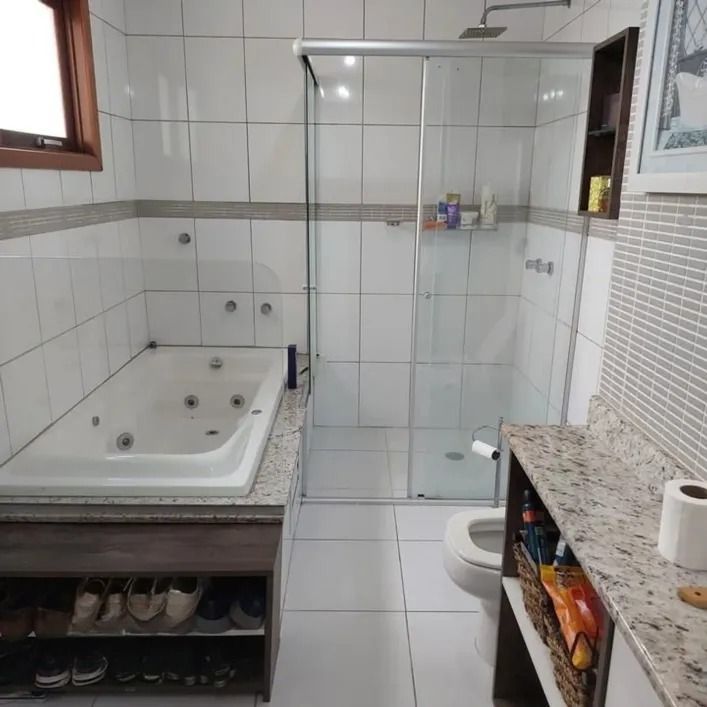 O terceiro pavimento abriga os três dormitórios, sendo uma suíte ampla com banheira de hidromassagem, chuveiro separado e excelente espaço interno, além de banheiro social bem distribuído.