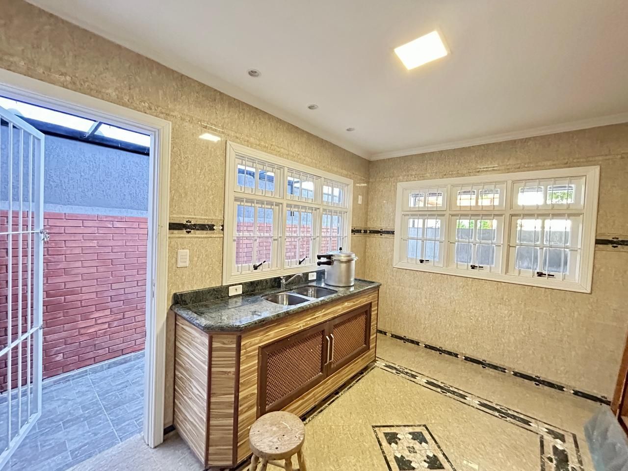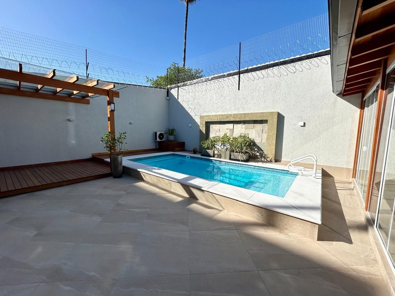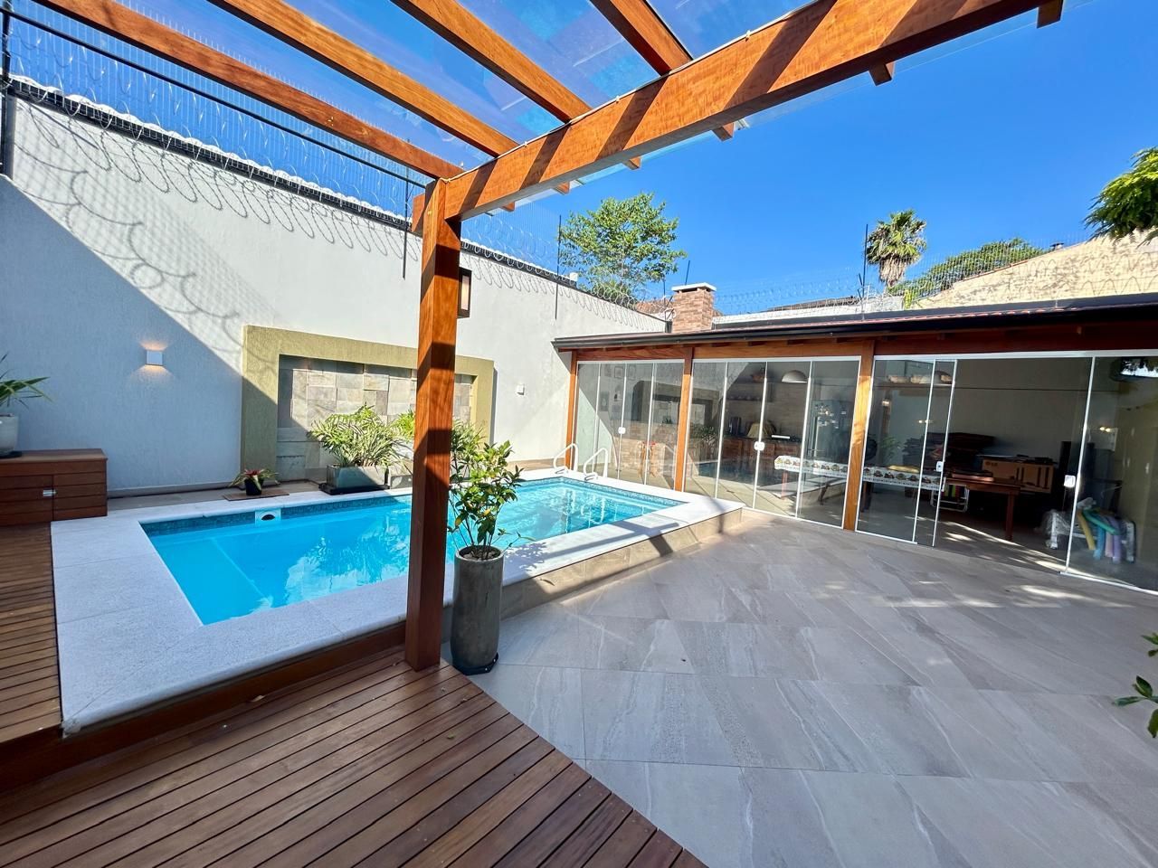 O terreno ainda oferece um salão de festas com churrasqueira, piscina, jardim de inverno, orta e garagem coberta para 2 carros, com espaço adicional para mais 4 veículos. Tudo isso em uma casa totalmente reformada, com elétrica e hidráulica novas, cerca elétrica e sistema de segurança com câmeras.