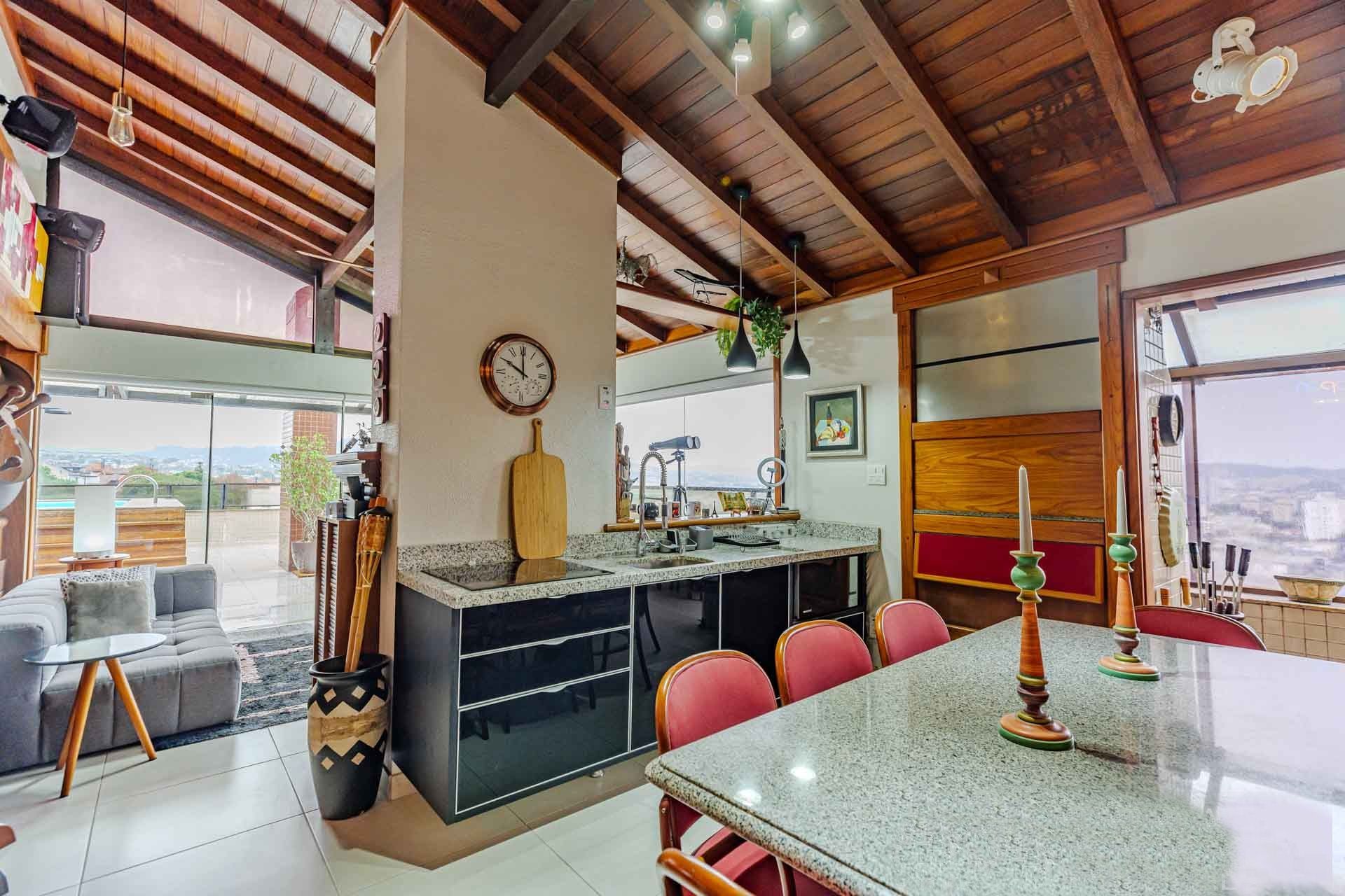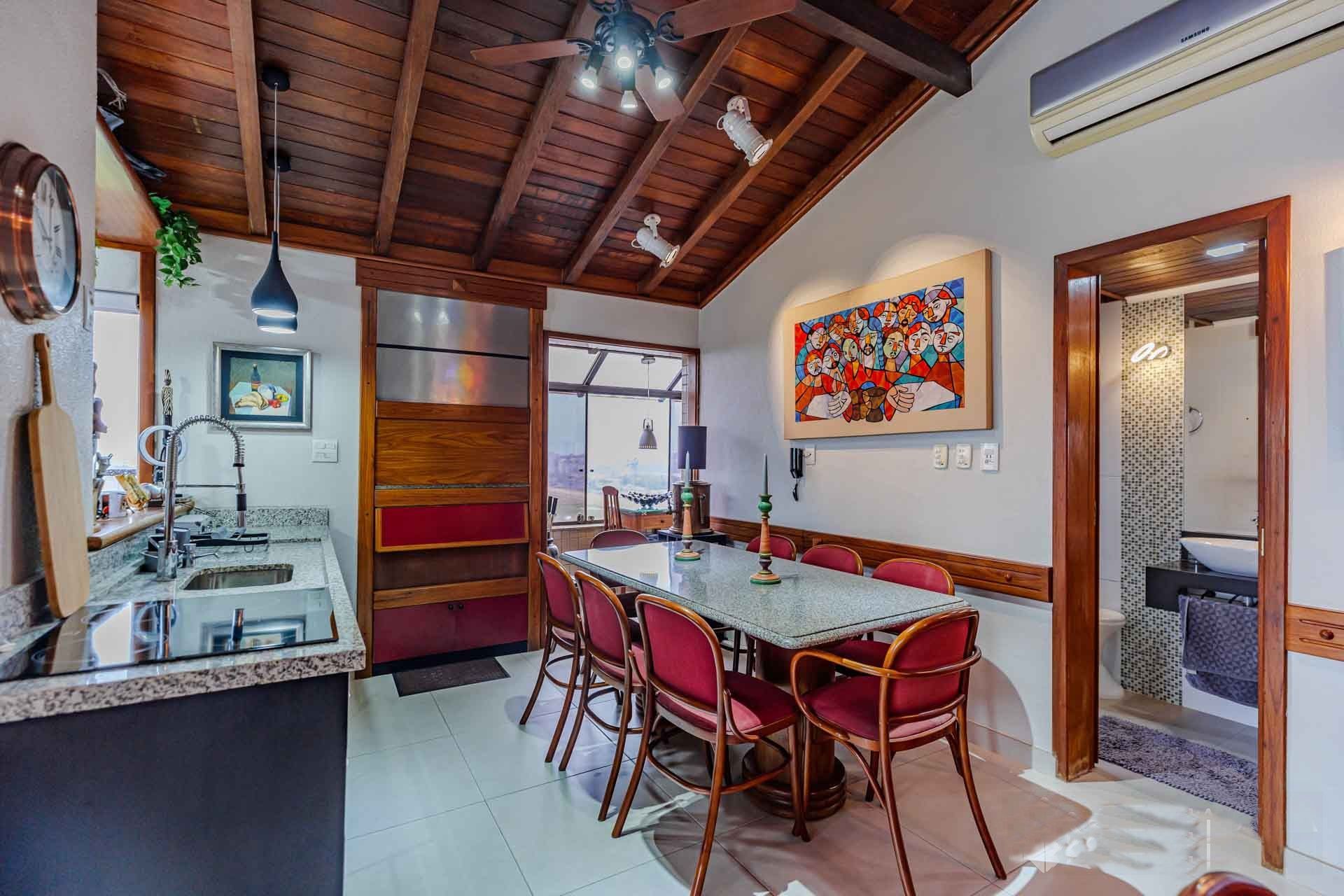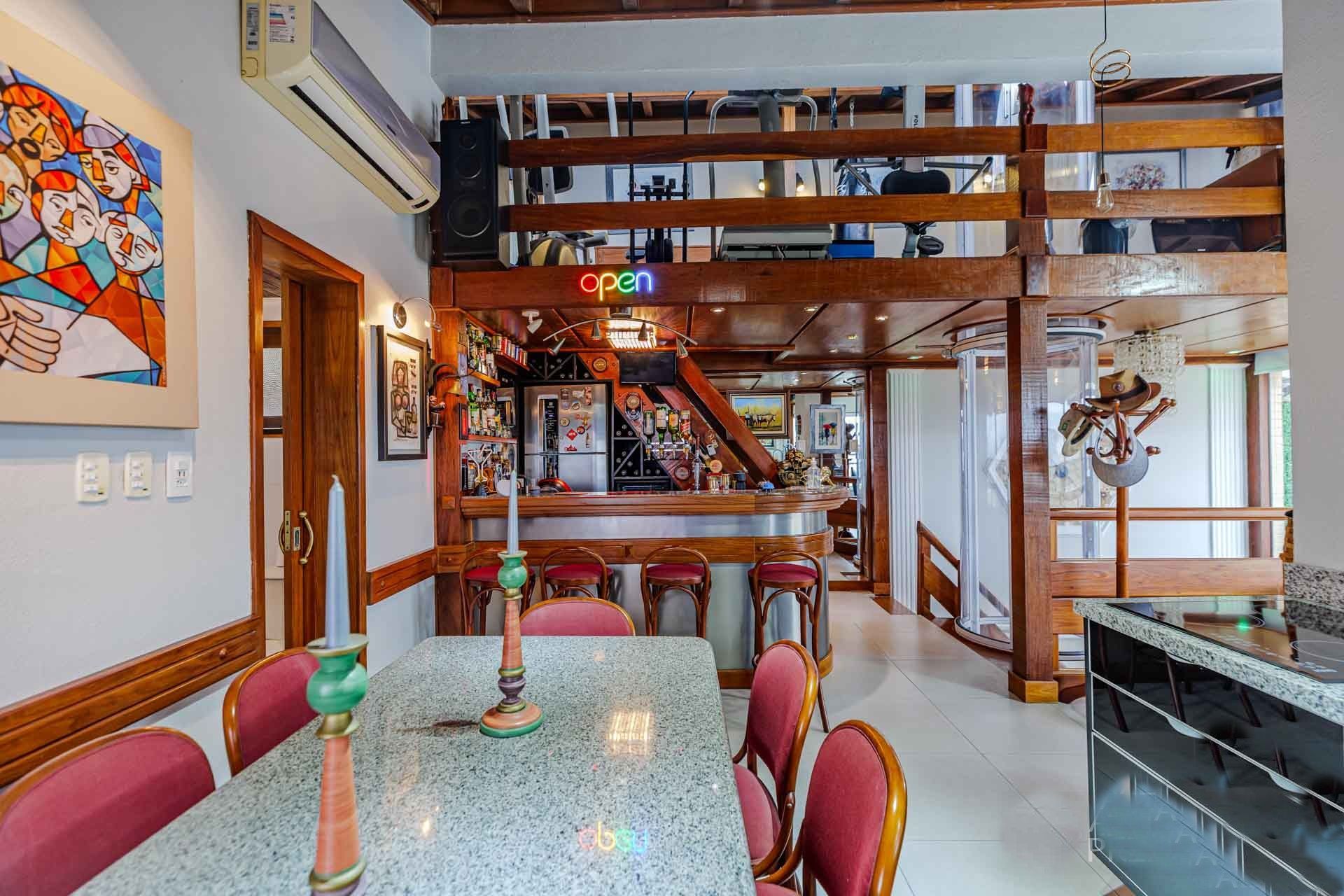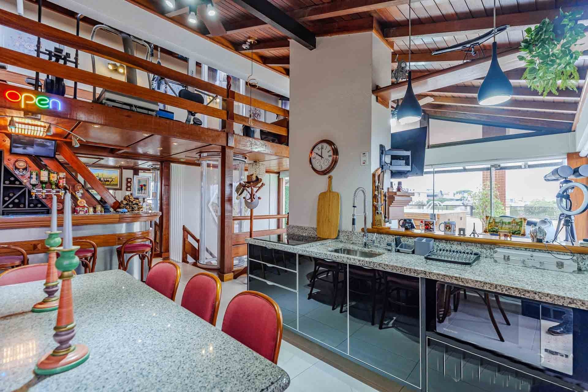 No segundo pavimento bar completo, churrasqueira, cozinha completa com fogão por indução, micro-ondas, sala de jantar, lareira a lenha, TV giratória, piano, sonorização, poltronas, tela para reprodução do retroprojetor, telescópio e banheiro social, O terraço com um minijardim de inverno, deck com piscina, muito sol e aquela vista livre permanente para dentro do bairro assim como o Lago Guaíba e demais locais acima descritos.