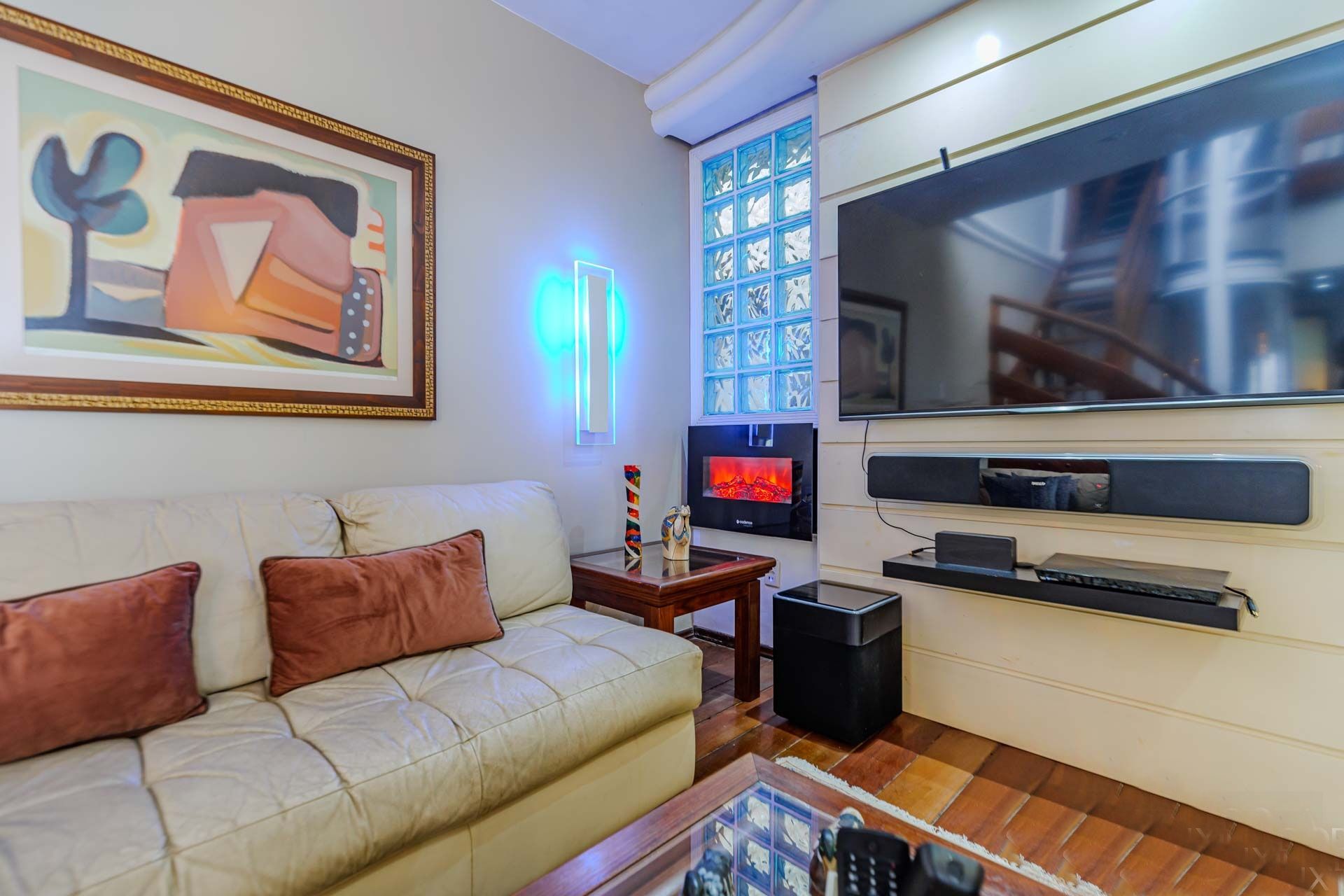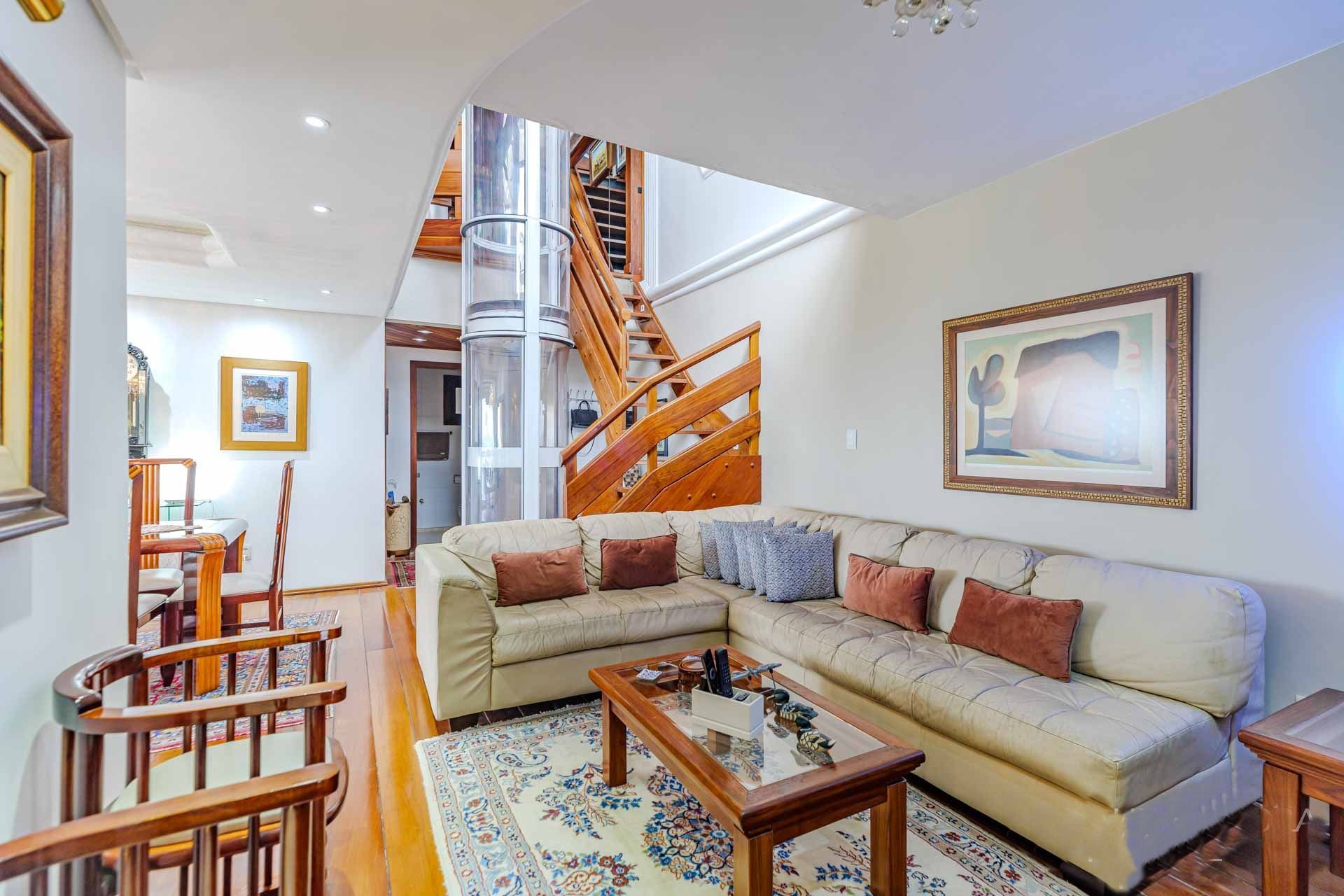 Primeiro pavimento o living com janelas do chão ao teto, 1 suíte masr, 1 dormitório, elevador, janela de tijolo de vidro do poço de luz, lareira ecológica, escadas de madeira com luz de LED, cozinha completa e split, área de serviço com porta auxiliar para o living, mais 1 suíte onde seria a dependência.