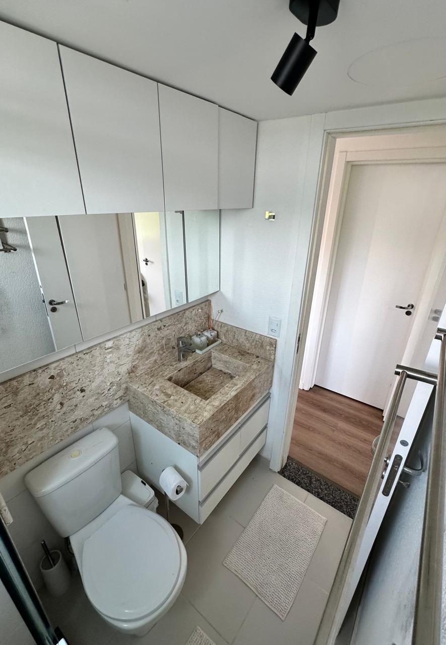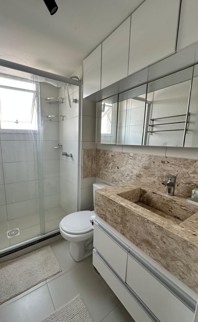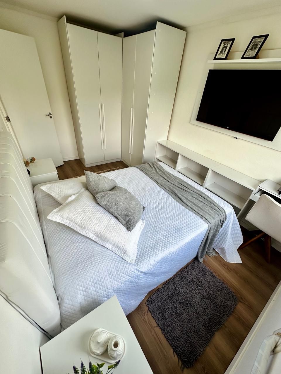 Sala com sofá, painel de TV com armários, mesa com cadeiras e armários planejados, Cozinha com bancada em pedra, armários aéreos e inferiores, cooktop e máquina lava e seca. Banheiro com box de vidro, bancada em pedra com armário e espelho. Quarto principal com guarda-roupa em L espaçoso, cama de casal com baú, cabeceira com criados-mudos, escrivaninha, painel para TV e ar-condicionado. Segundo quarto versátil, ideal como escritório ou home office, com mesa de trabalho, armários e guarda-roupa.