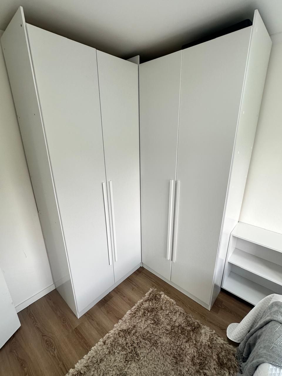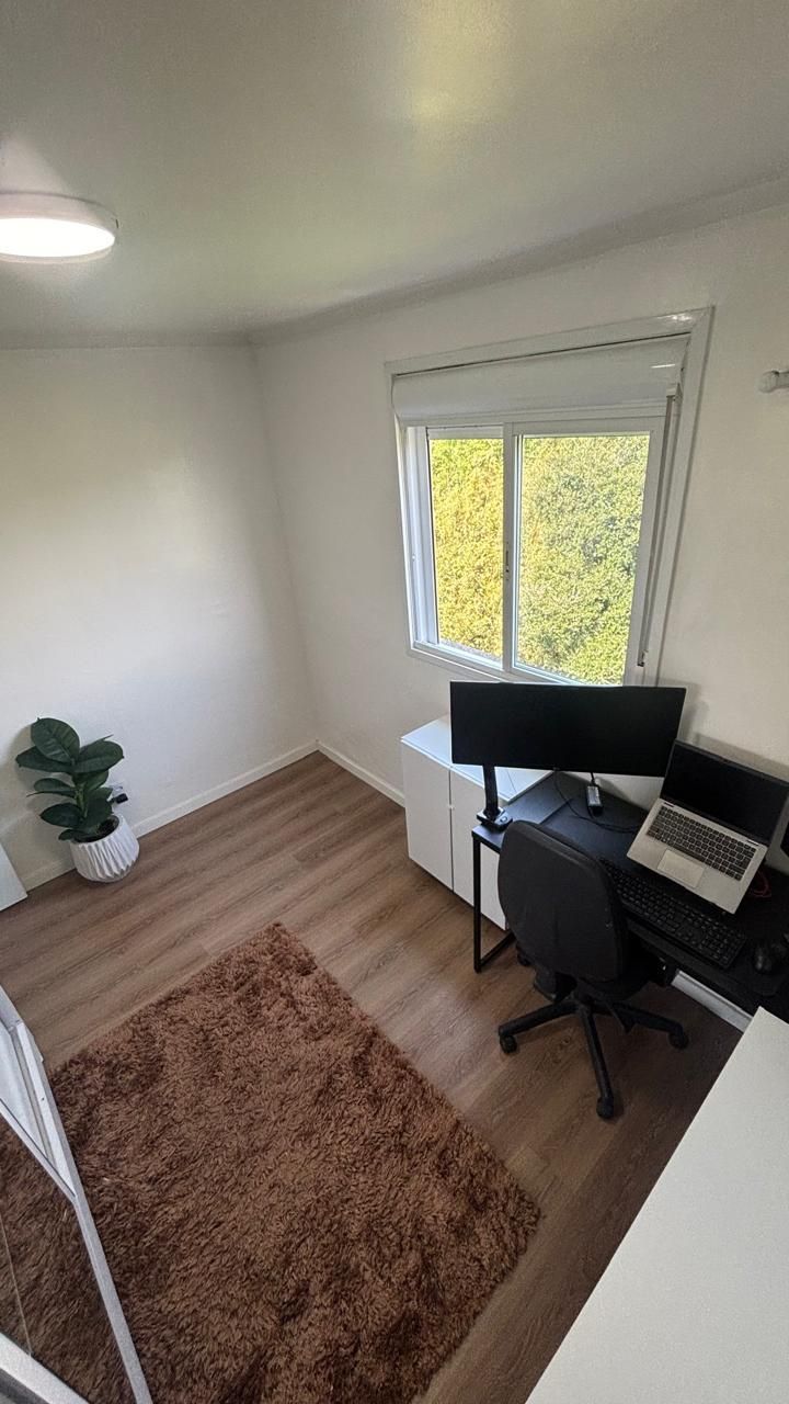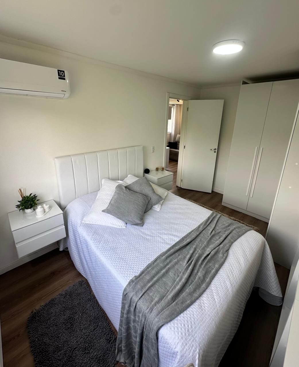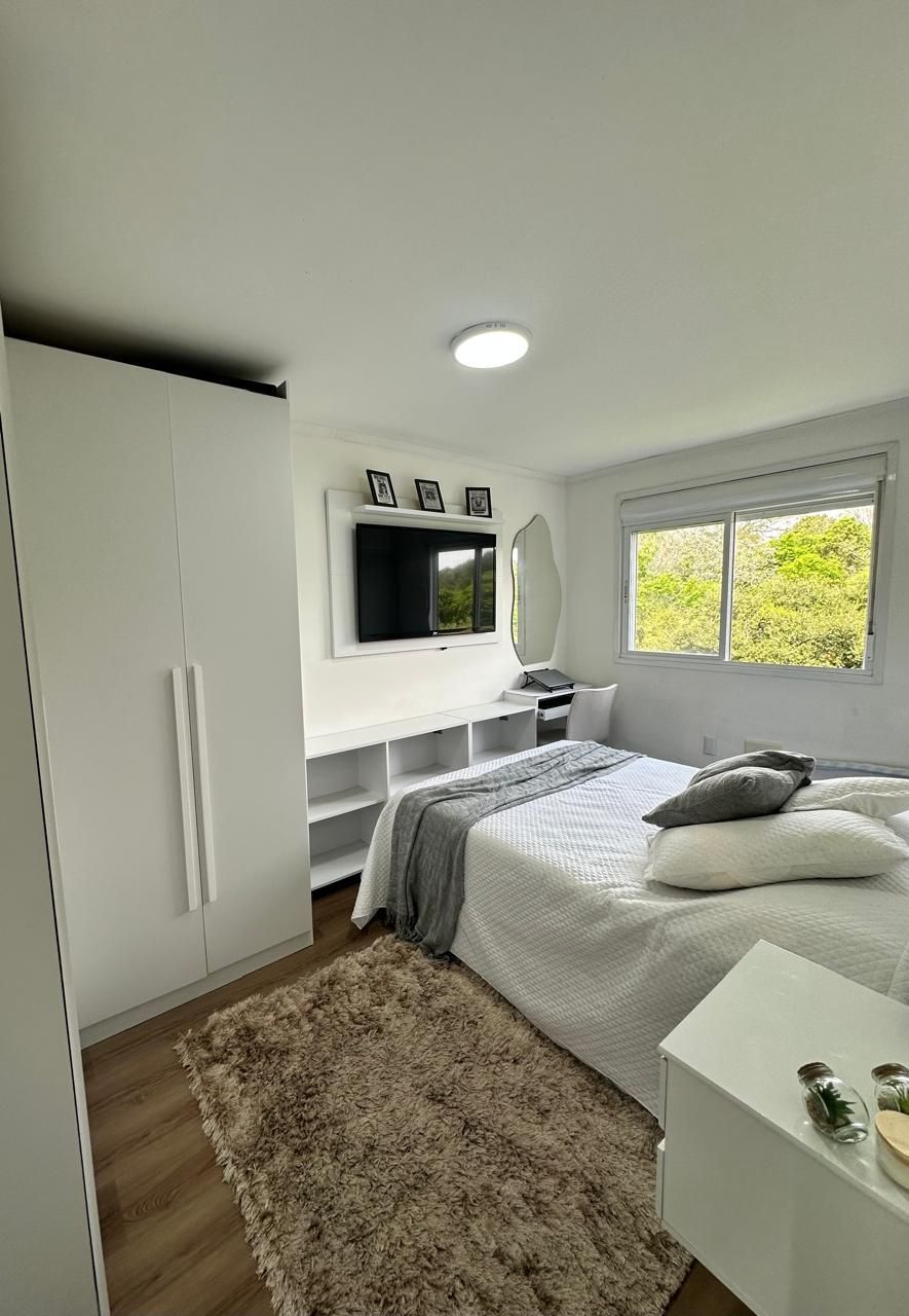 Sala com sofá, painel de TV com armários, mesa com cadeiras e armários planejados, Cozinha com bancada em pedra, armários aéreos e inferiores, cooktop e máquina lava e seca. Banheiro com box de vidro, bancada em pedra com armário e espelho. Quarto principal com guarda-roupa em L espaçoso, cama de casal com baú, cabeceira com criados-mudos, escrivaninha, painel para TV e ar-condicionado. Segundo quarto versátil, ideal como escritório ou home office, com mesa de trabalho, armários e guarda-roupa.