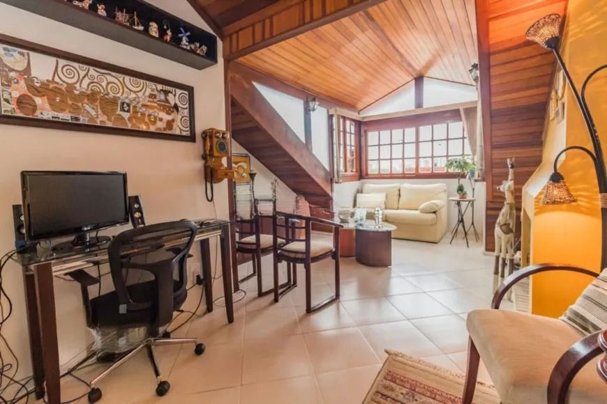 O sótão é um grande diferencial, oferecendo sala de estar, espaço para home office, lareira e ainda um charmoso mini terraço, perfeito para relaxar. A casa dispõe também de área de serviço, banheiro social e duas vagas de garagem.