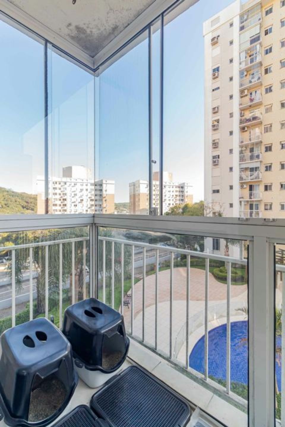Sala ampla para dois ou mais ambientes, apartamento em andar alto, bem ventilado e iluminado, com janelas amplas e sacada. Imóvel totalmente mobiliado, com armários embutidos, ar-condicionado e pronto para morar.