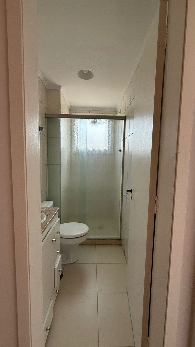 Banheiro auxiliar, todo em cerâmica, com box de vidro, armários sob medida e janela voltada para o exterior, garantindo ventilação natural.