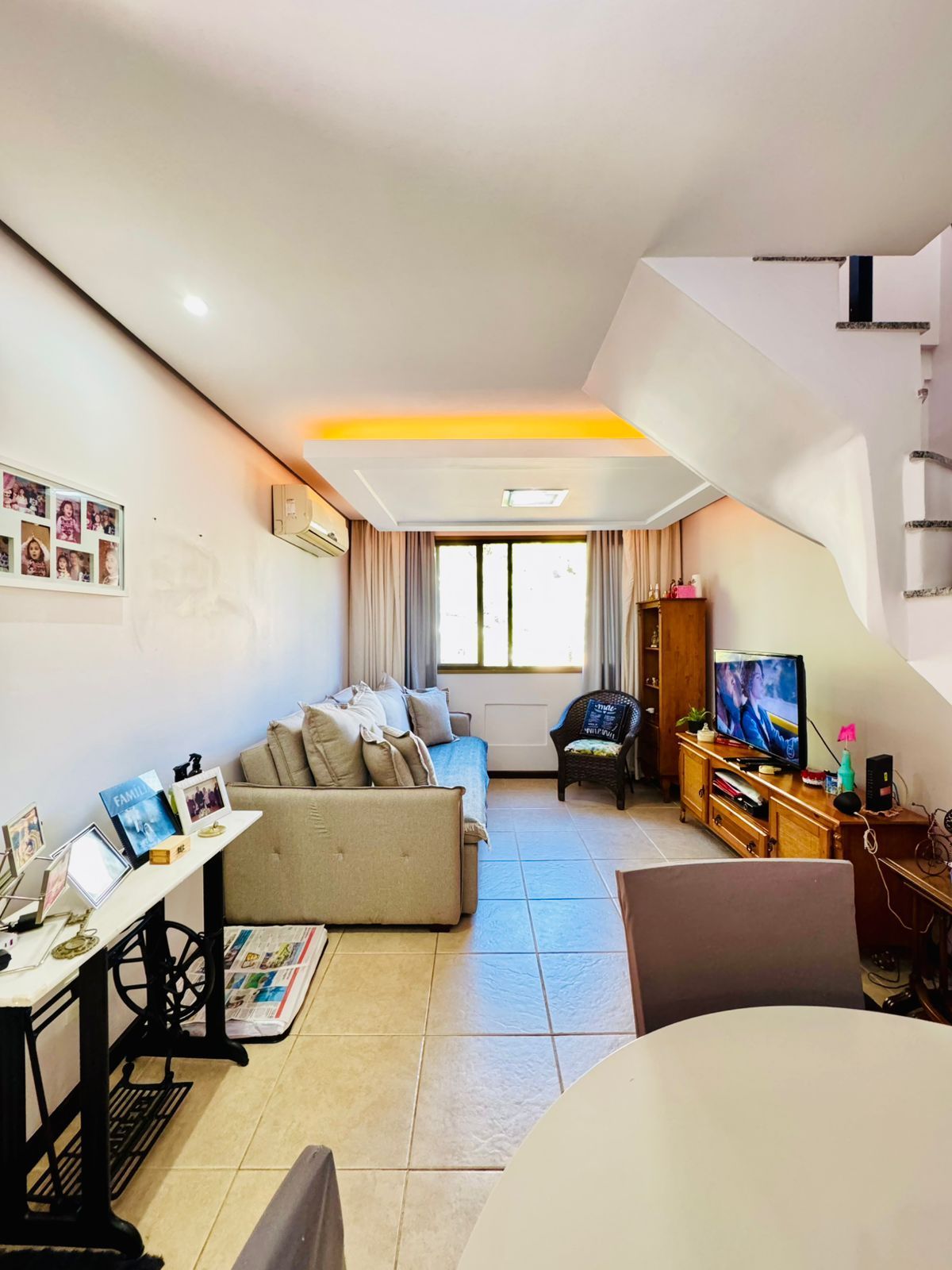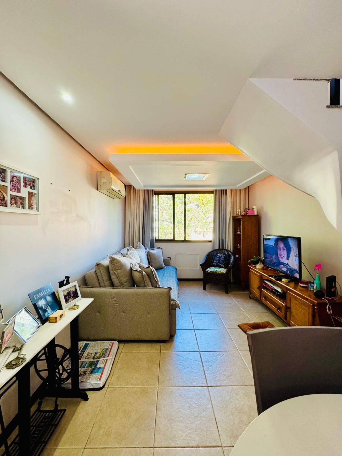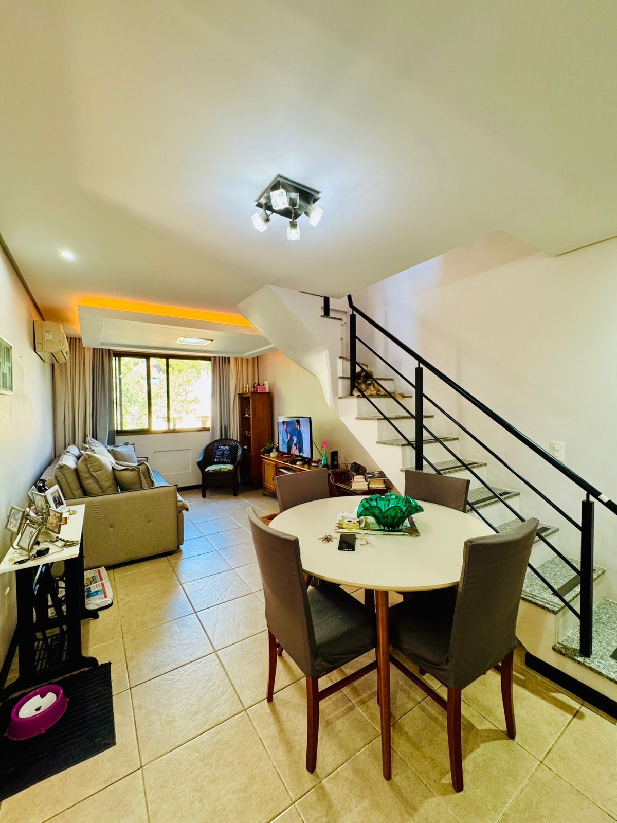 O primeiro pavimento conta com living amplo para dois ambientes, cozinha americana integrada, área de serviço separada, banheiro social e dois dormitórios, sendo uma suíte.