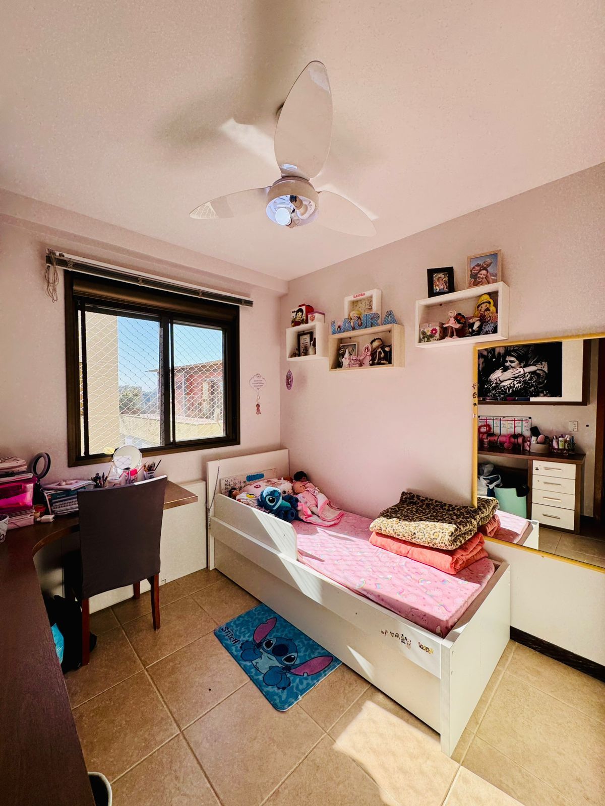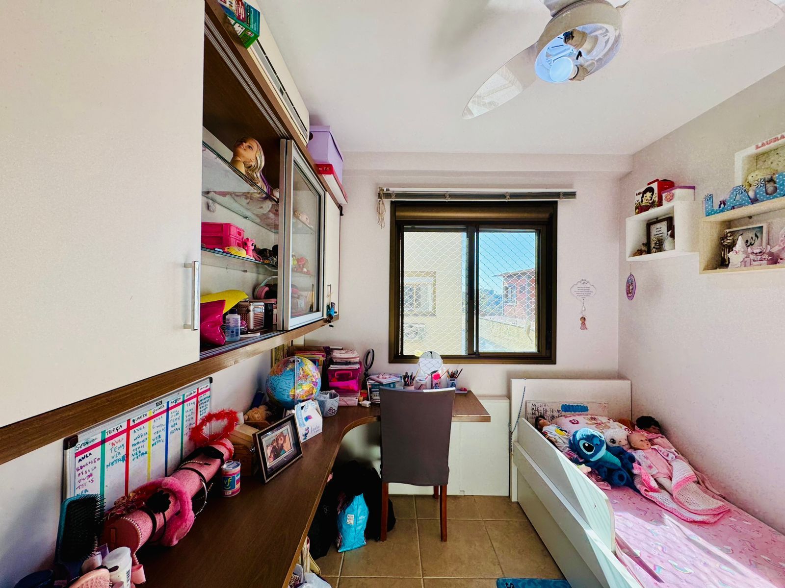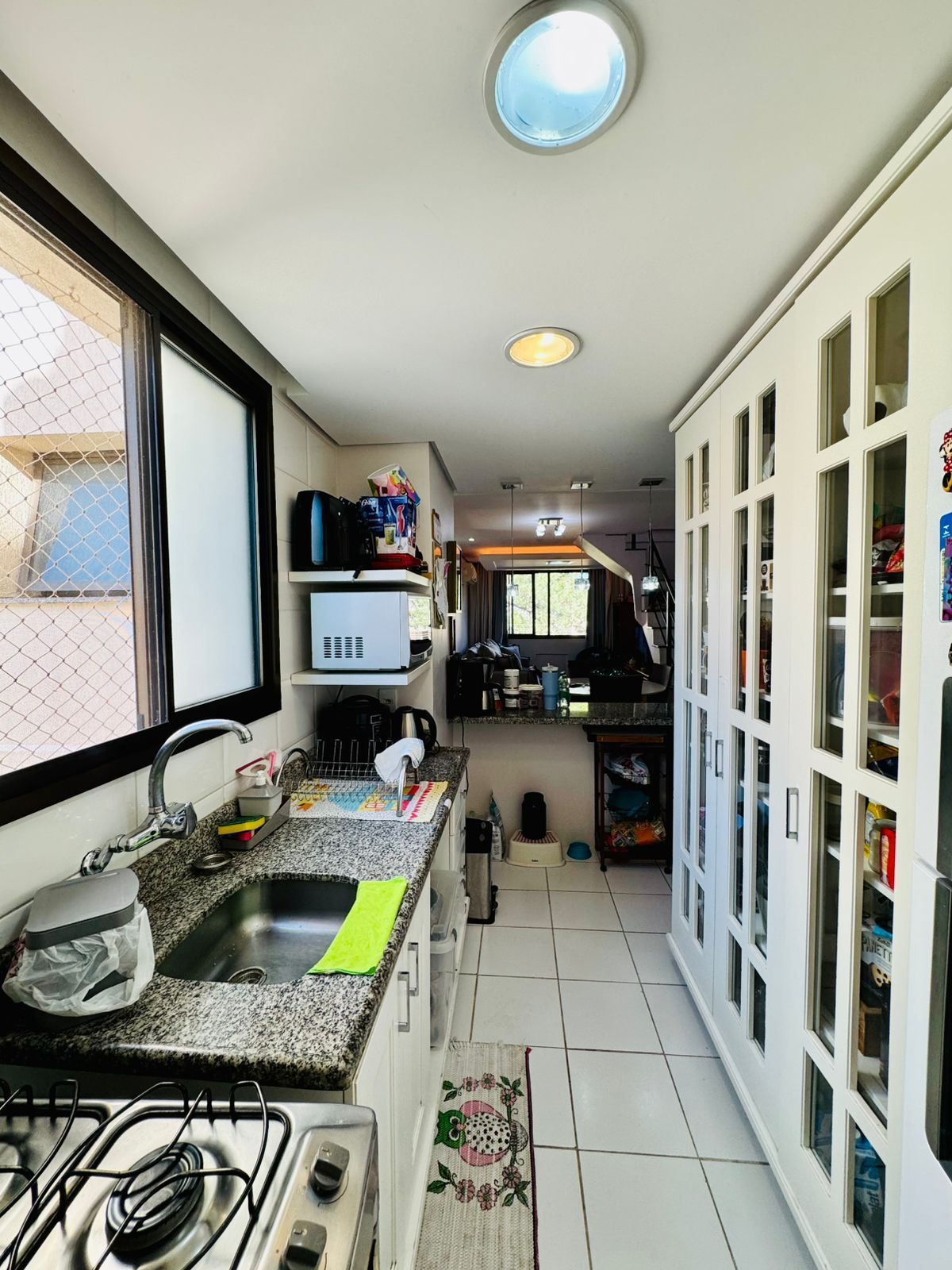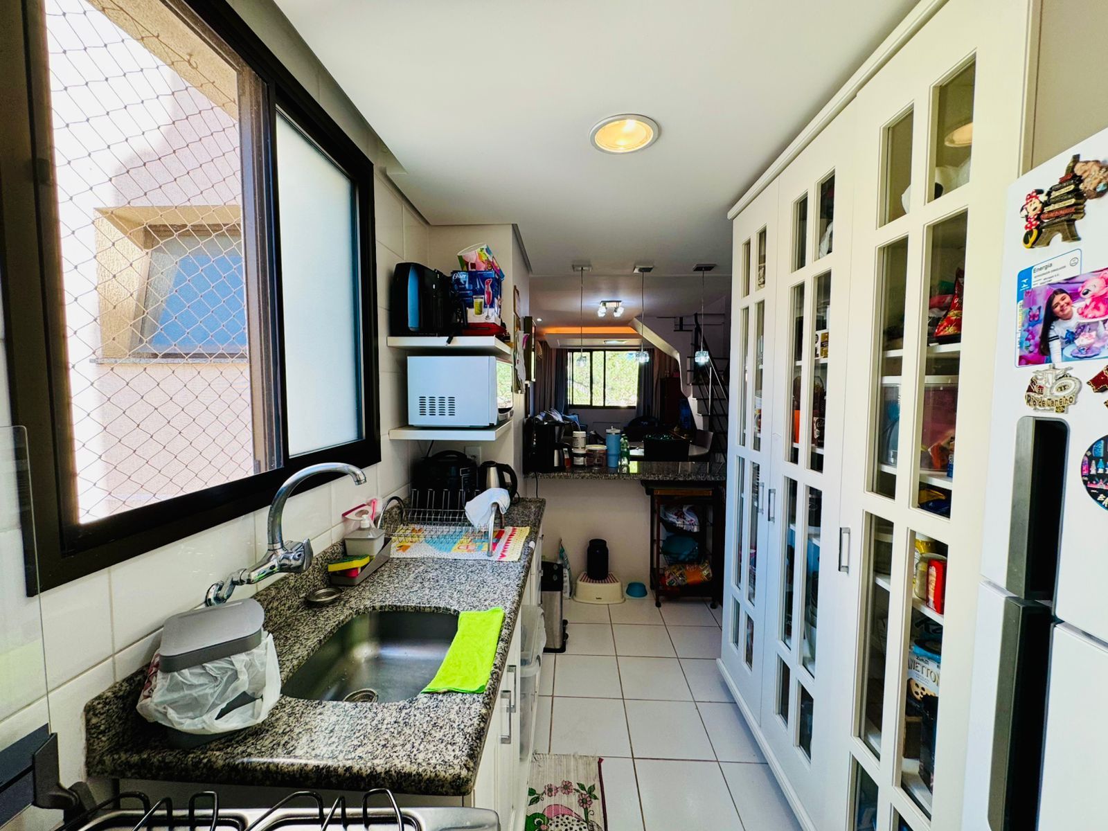 O primeiro pavimento conta com living amplo para dois ambientes, cozinha americana integrada, área de serviço separada, banheiro social e dois dormitórios, sendo uma suíte.