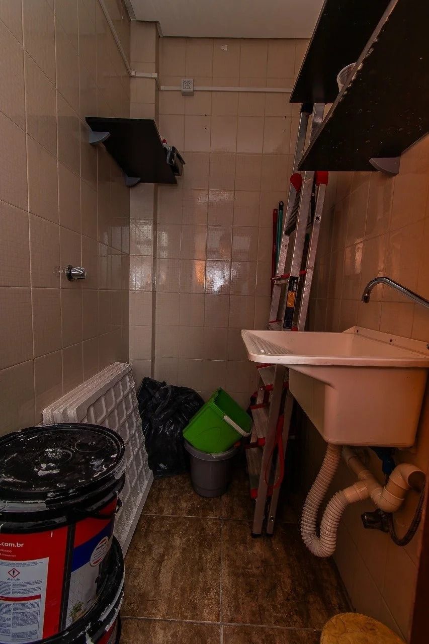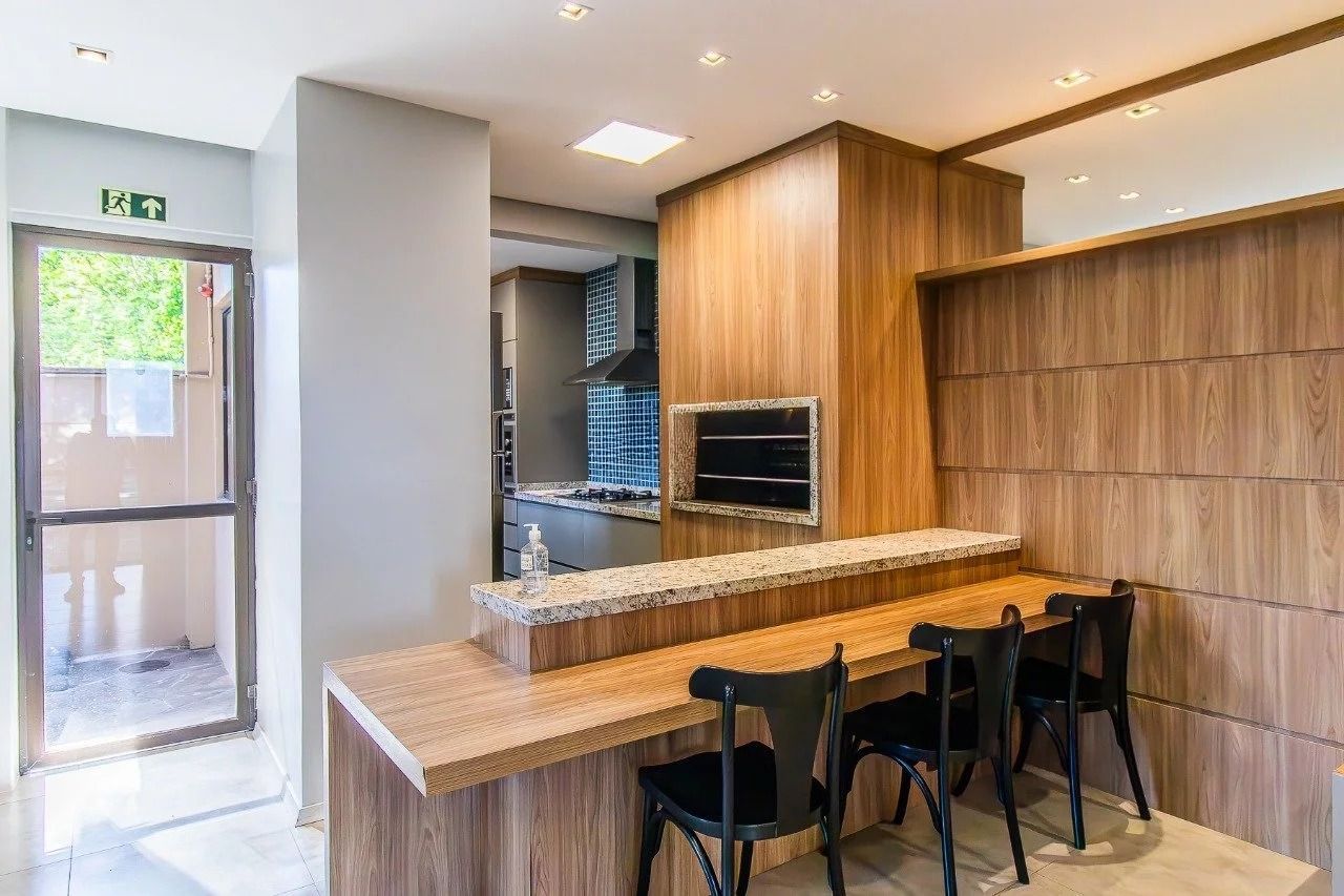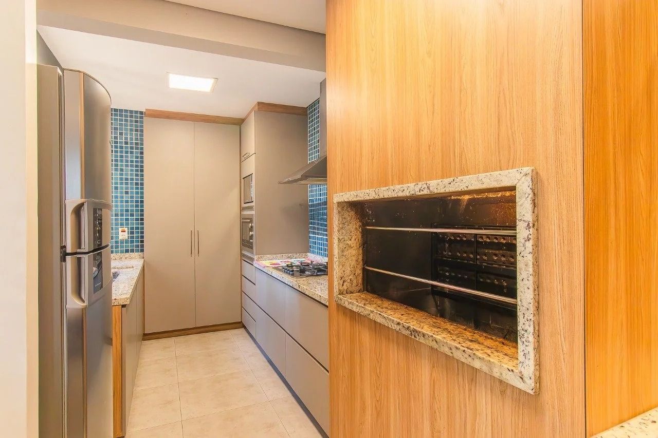 Cozinha com móveis planejados. O antigo espaço destinado à cozinha e à área de serviço foi transformado em dois dormitórios, que podem facilmente retornar à configuração original de cozinha com área de serviço ou ser adaptados para uma terceira suíte, aproveitando o banheiro de serviço existente no ambiente.