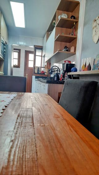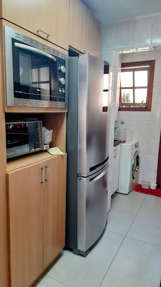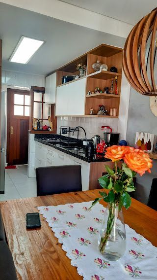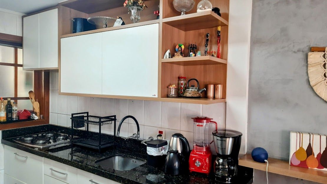 A cozinha está toda equipada e conta com armários, oferecendo praticidade e organização.