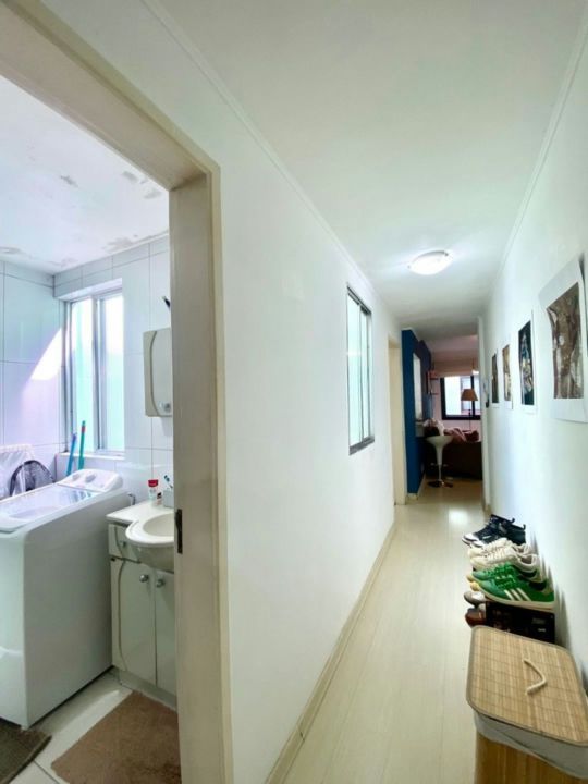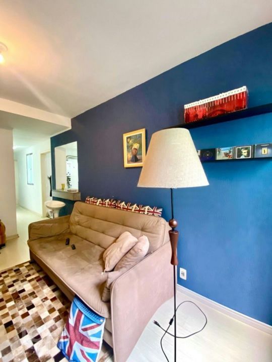 A sala é ampla e bem iluminada, com cortinas sob medida já instaladas. O edifício oferece elevador e um salão de festas no terraço equipado com churrasqueira.