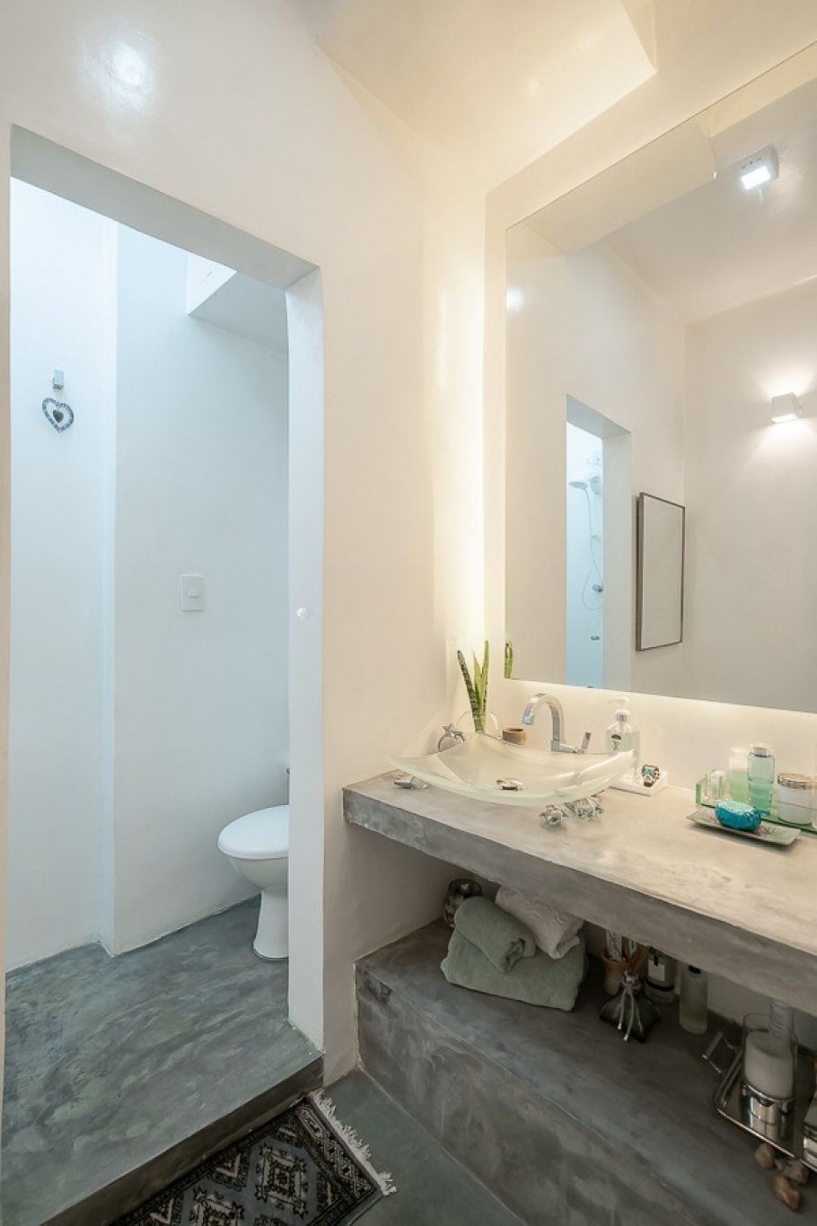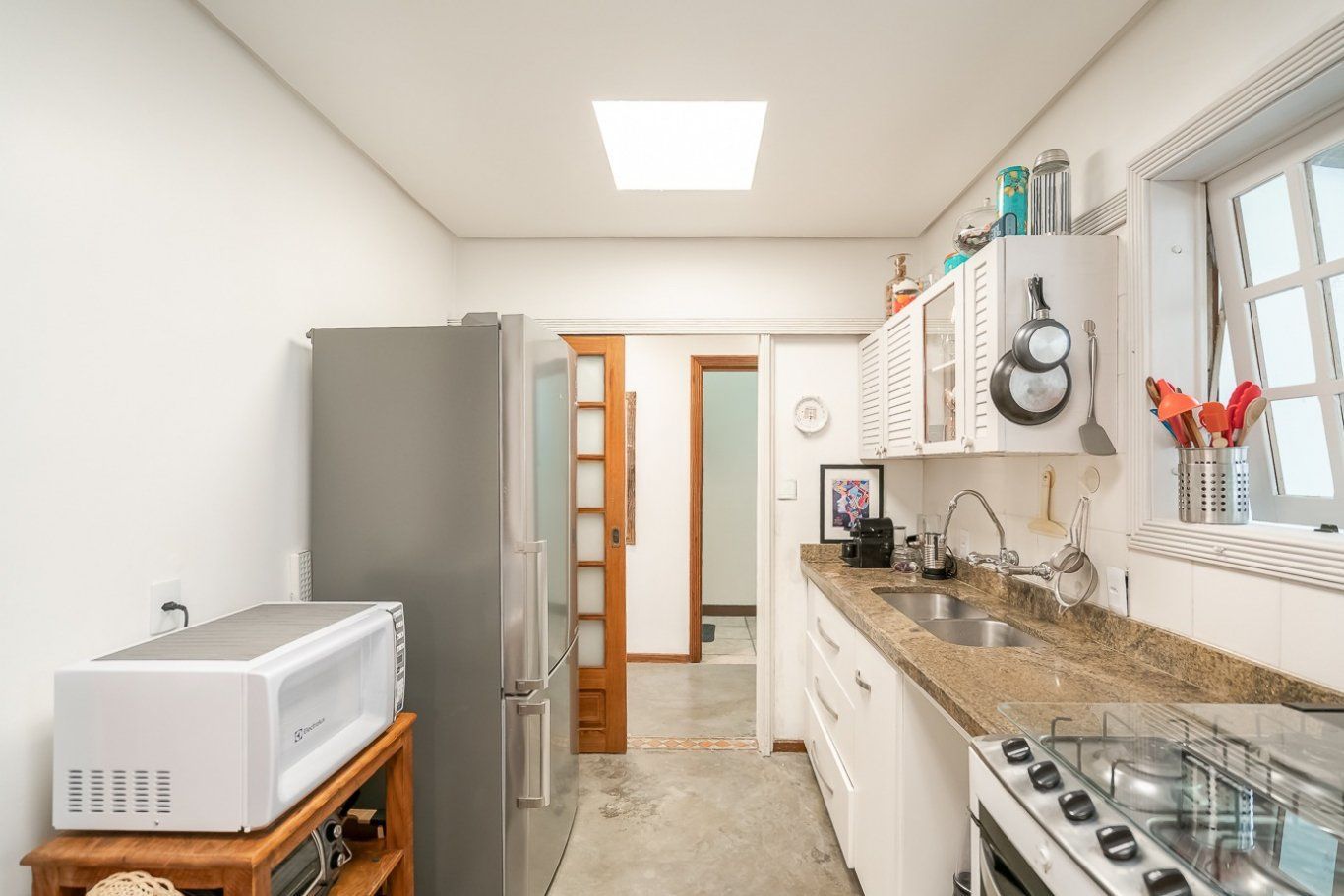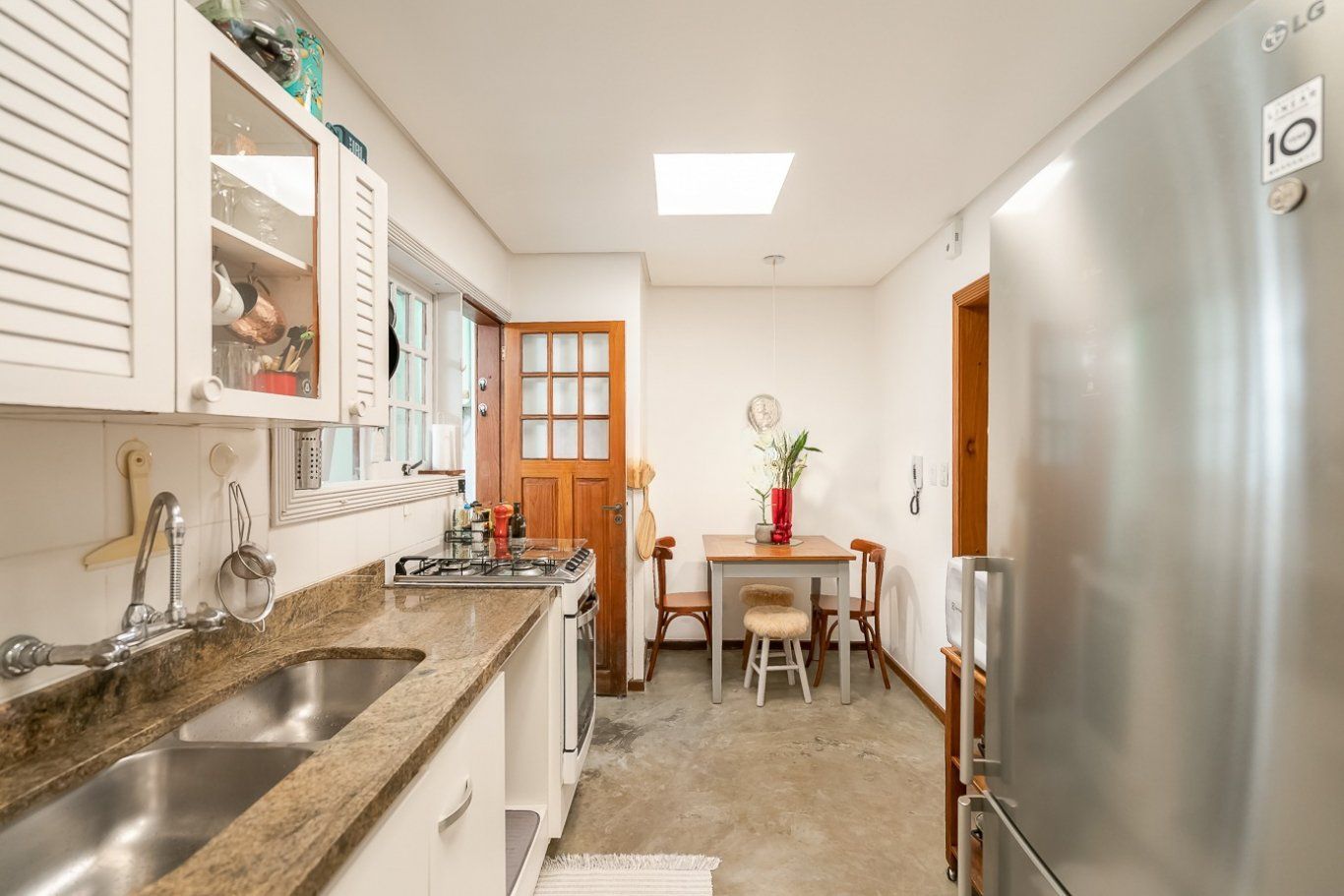 Cozinha espaçosa com móveis planejados, mesa de refeições e piso em cimento queimado.