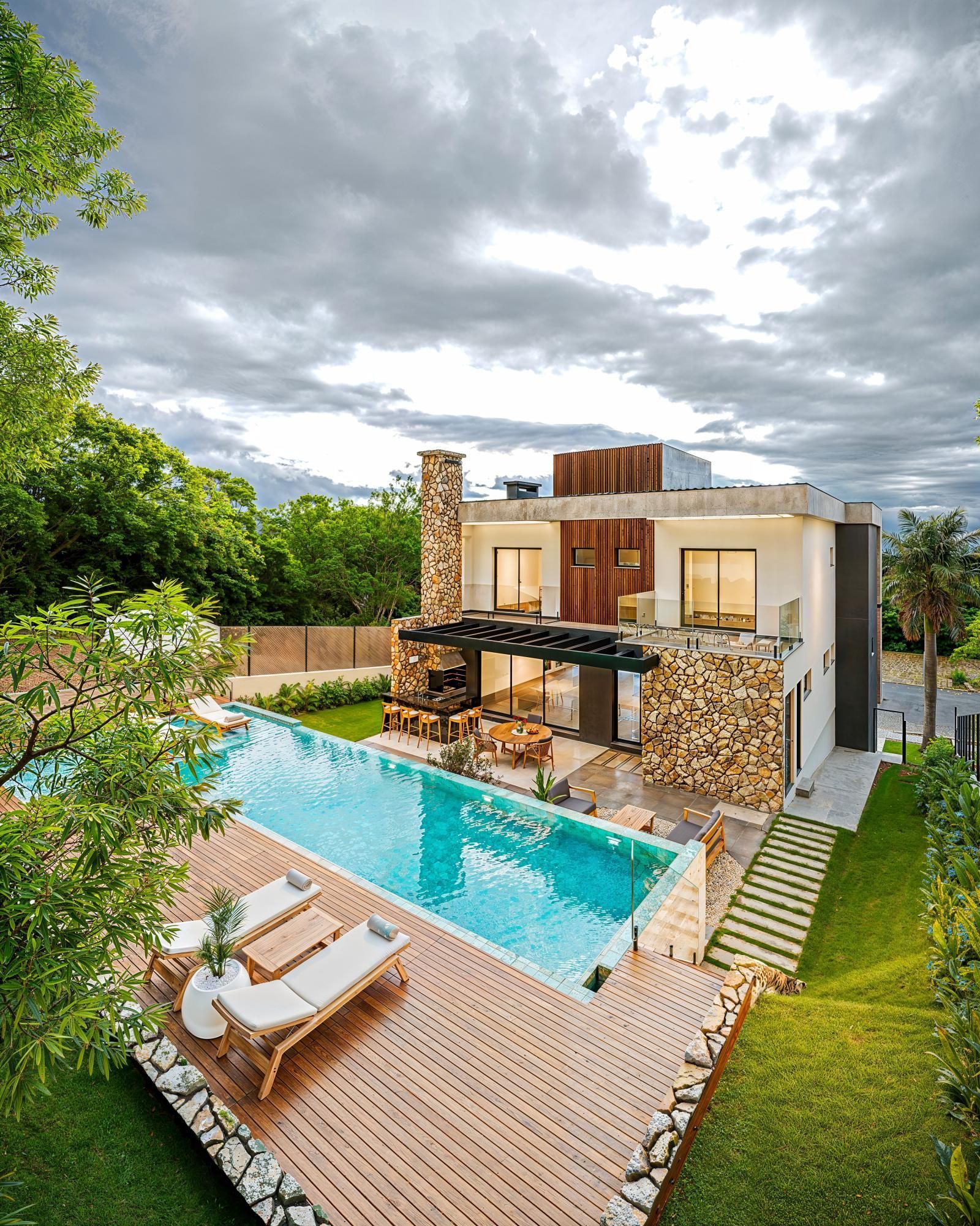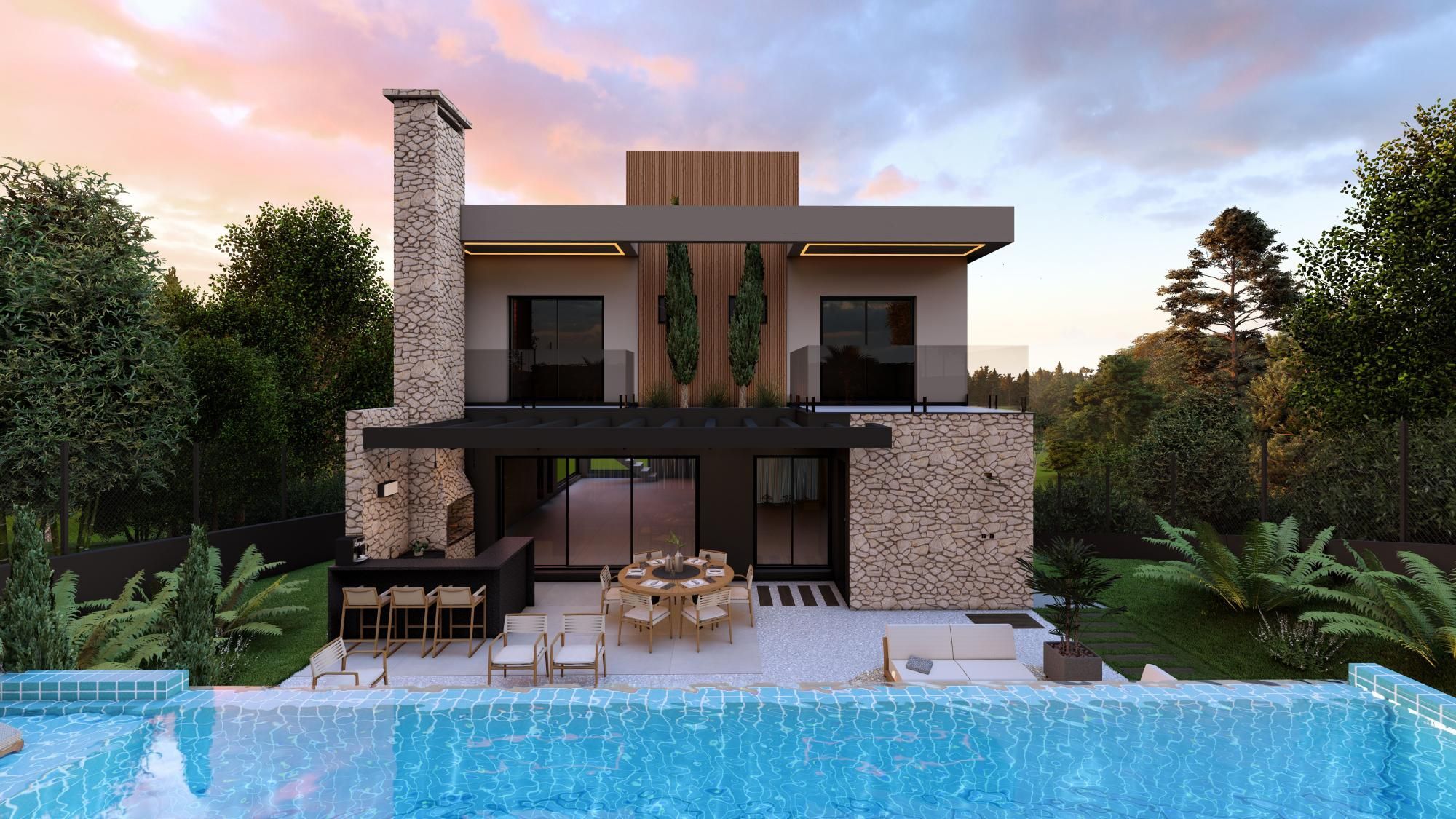Esta casa no Alphaville oferece 298,32m² privativos com projeto pensado para quem busca praticidade e bem-estar. O térreo integra living com lareira, cozinha, espaço gourmet interno lavabo, home office e um amplo espaço gourmet externo, ambos com churrasqueira, conectado ao pátio com piscina com mais de 40m² com borda infinita e prainha — ideal para receber amigos e aproveitar o dia.