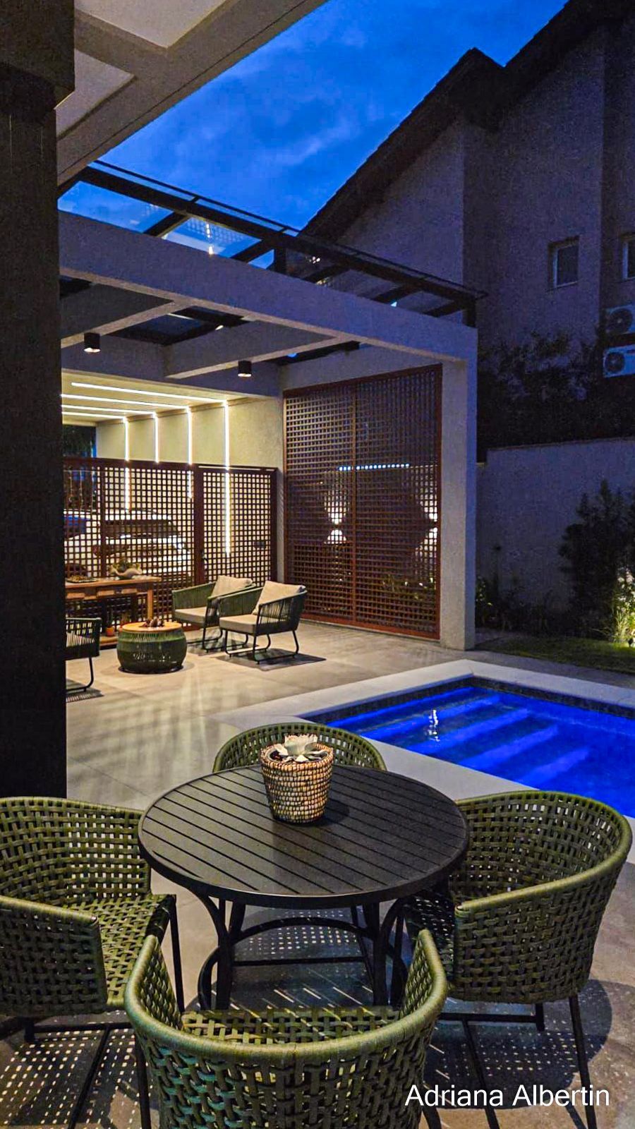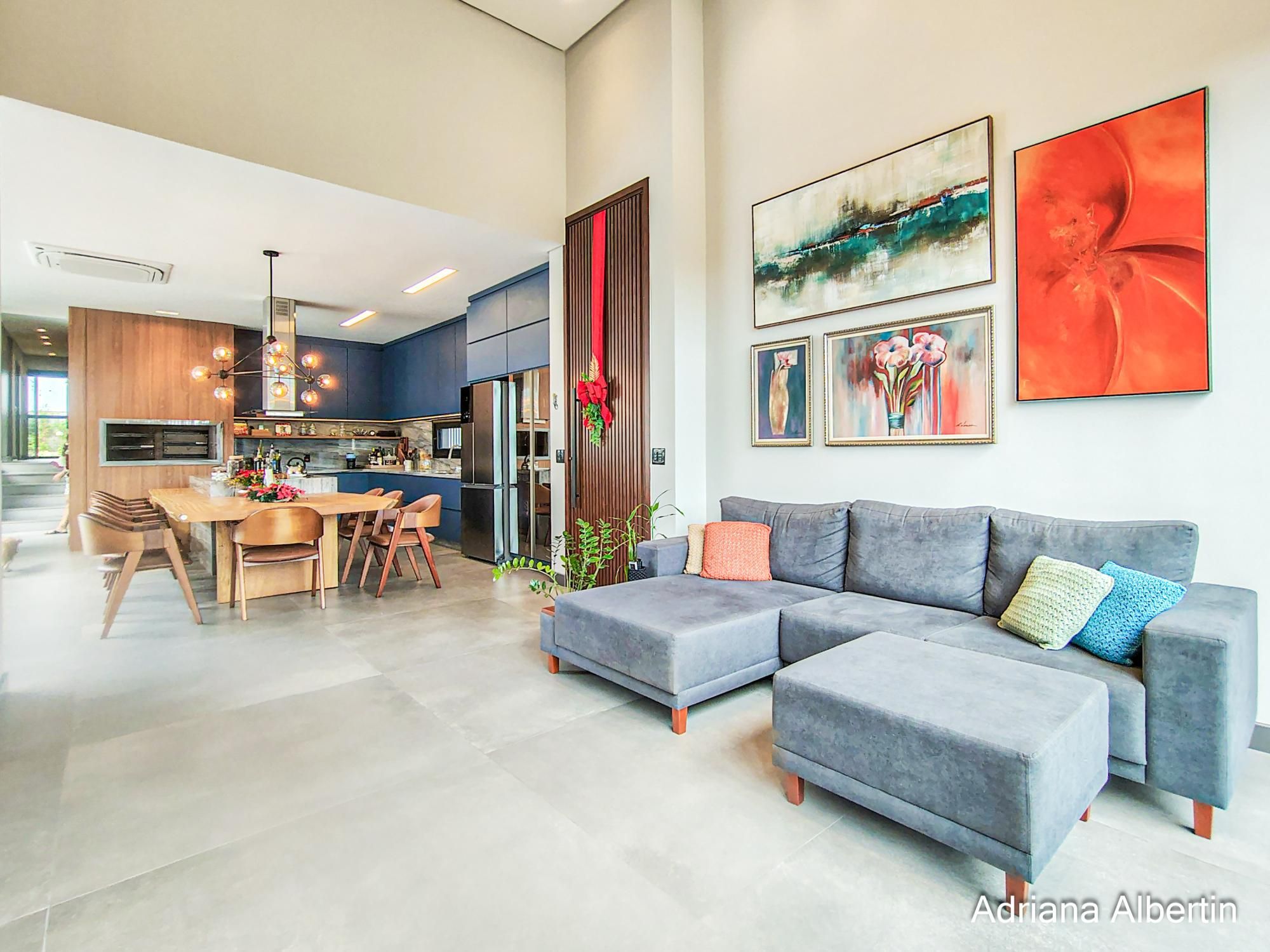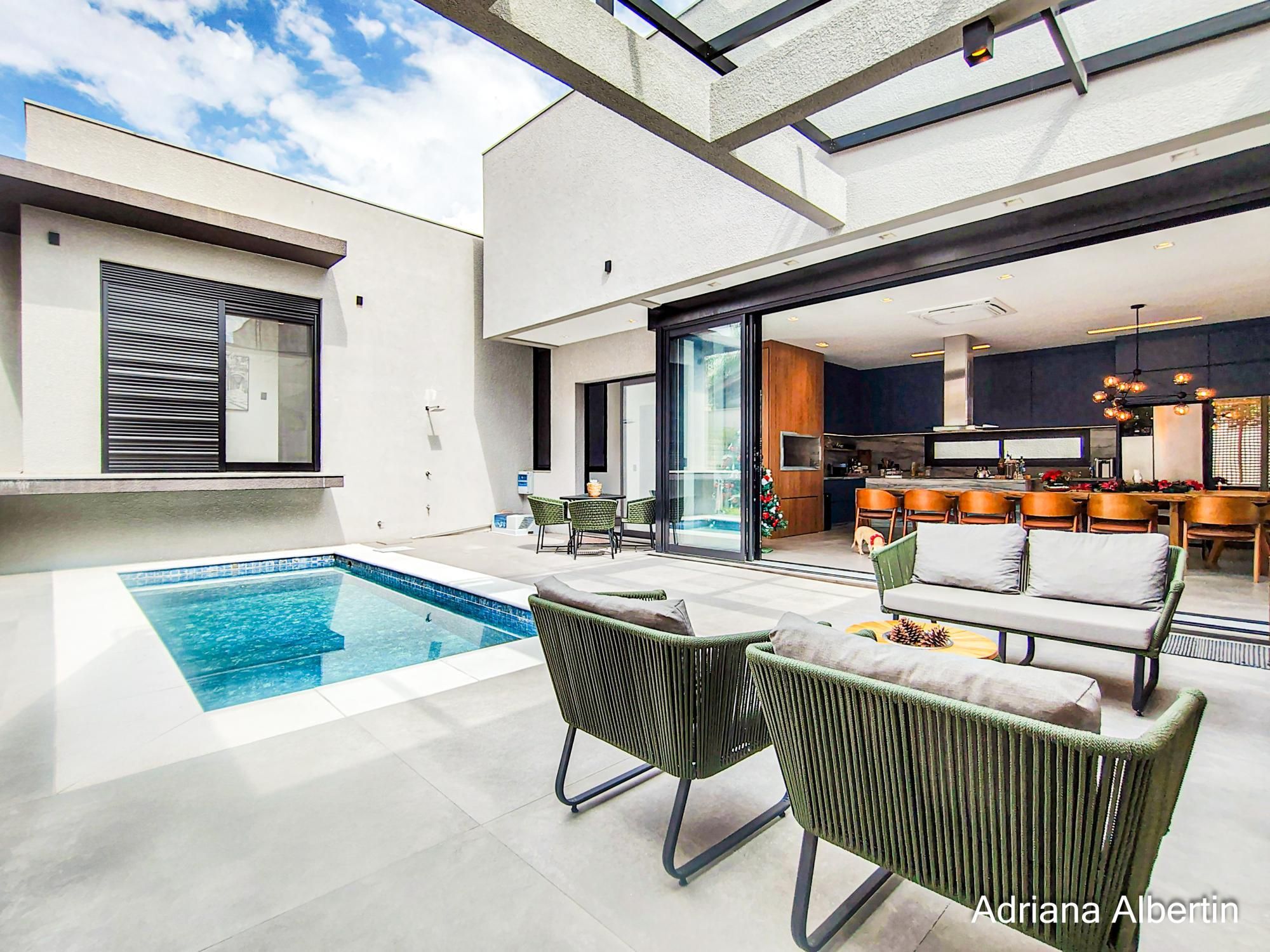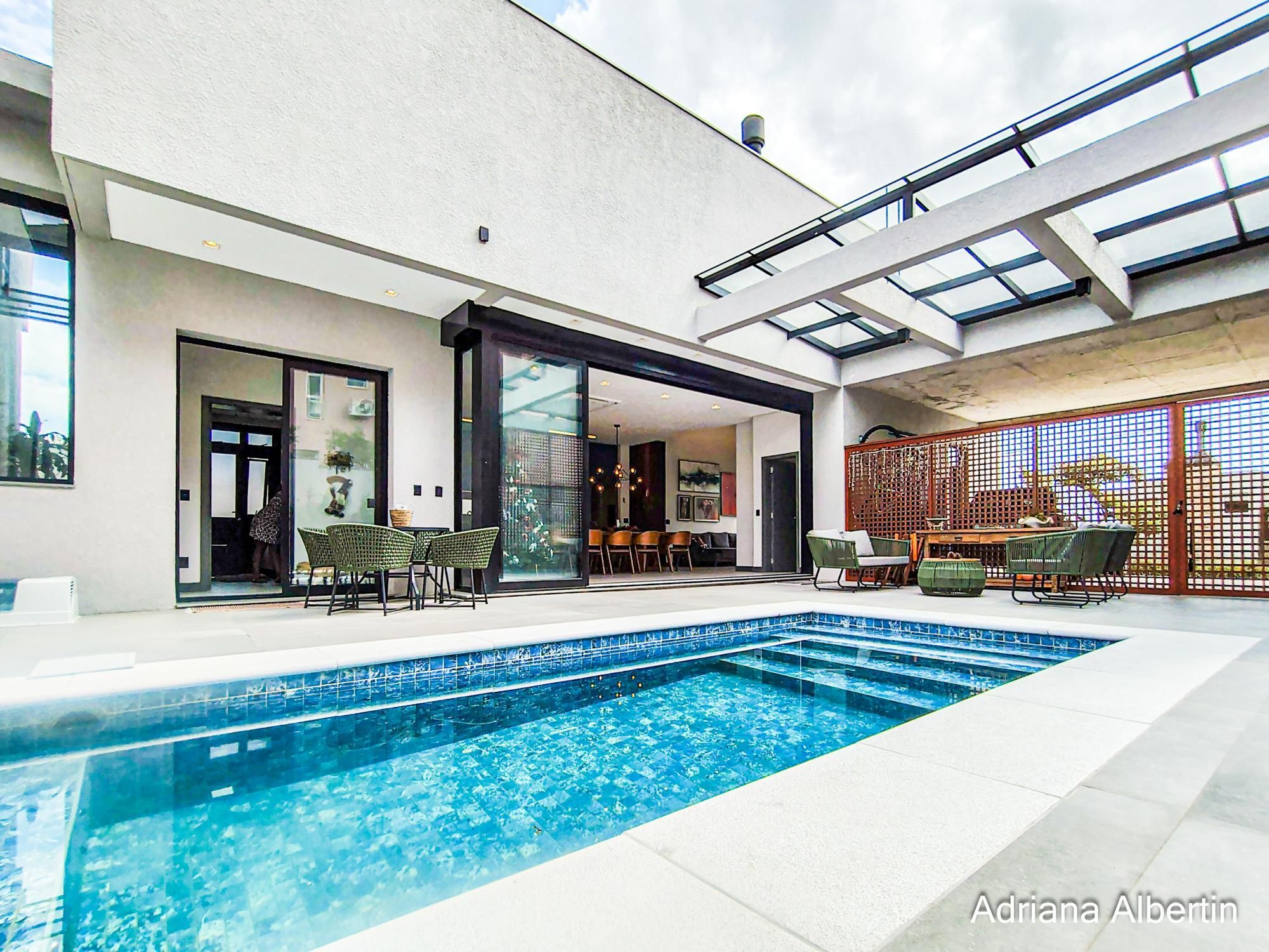 Casa térrea com arquitetura contemporânea e planta bem resolvida, valorizando integração, funcionalidade e conforto. O living com pé-direito alto e lareira conecta-se de forma fluida à cozinha, à área com churrasqueira e o pátio com piscina aquecida, criando um ambiente agradável tanto para o cotidiano quanto para momentos de convivência.