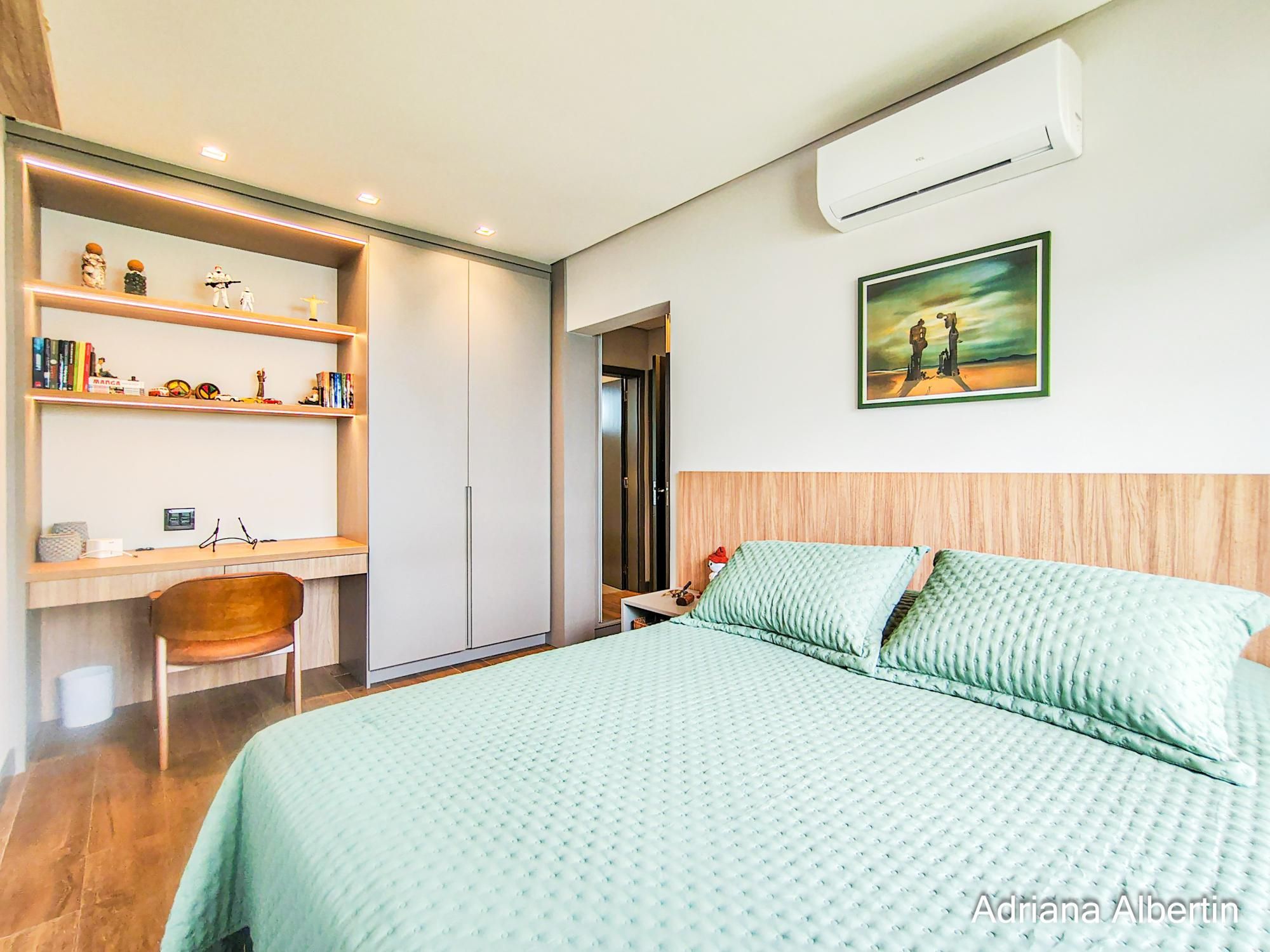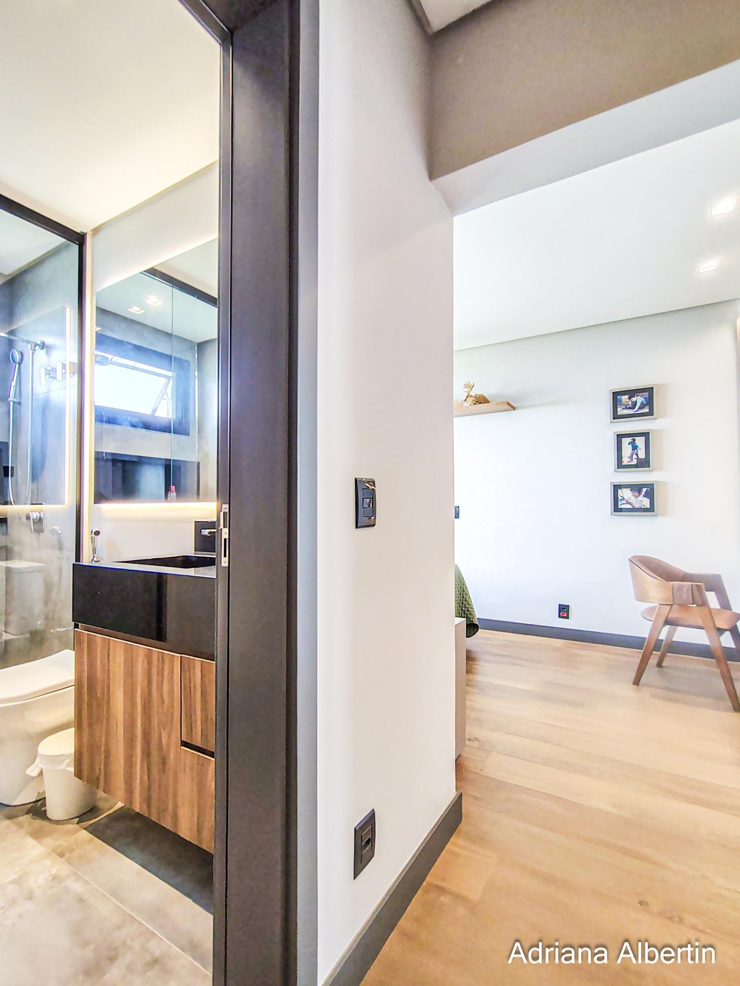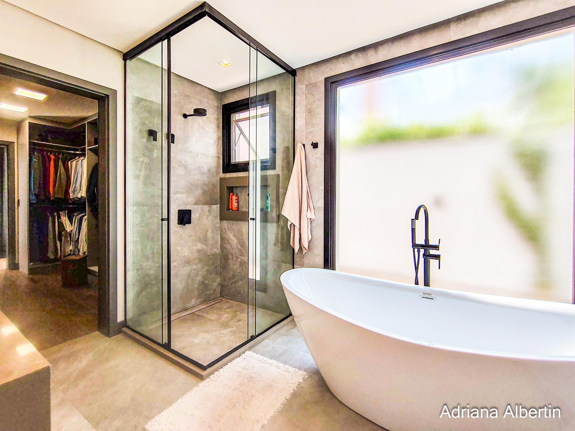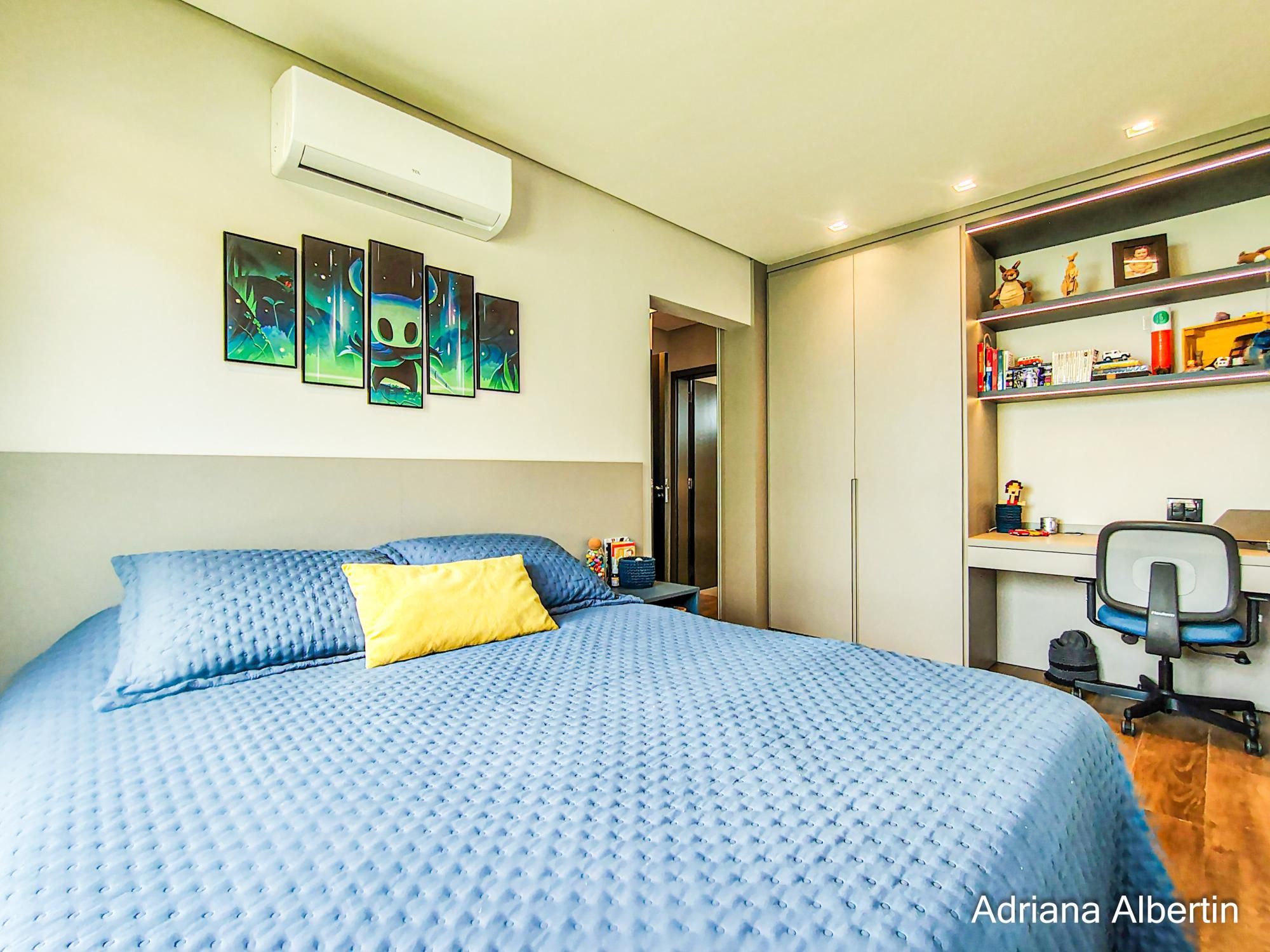 São 3 suítes, com destaque para a suíte máster, que conta com closet, banheira de imersão e amplo janelão com vidro jateado, garantindo luminosidade natural com privacidade. Há ainda um espaço multiuso, ideal para escritório ou quarto dormitório.