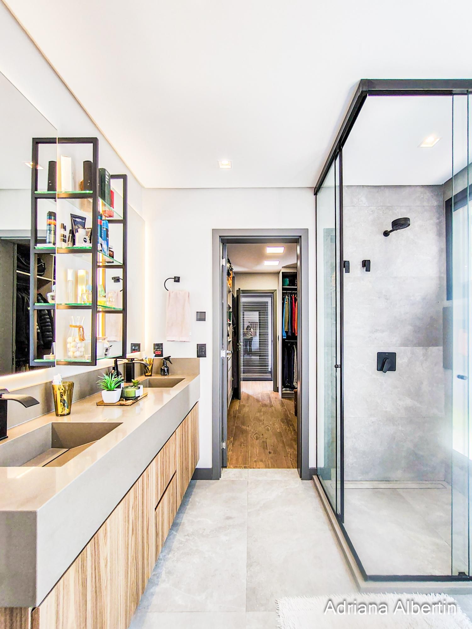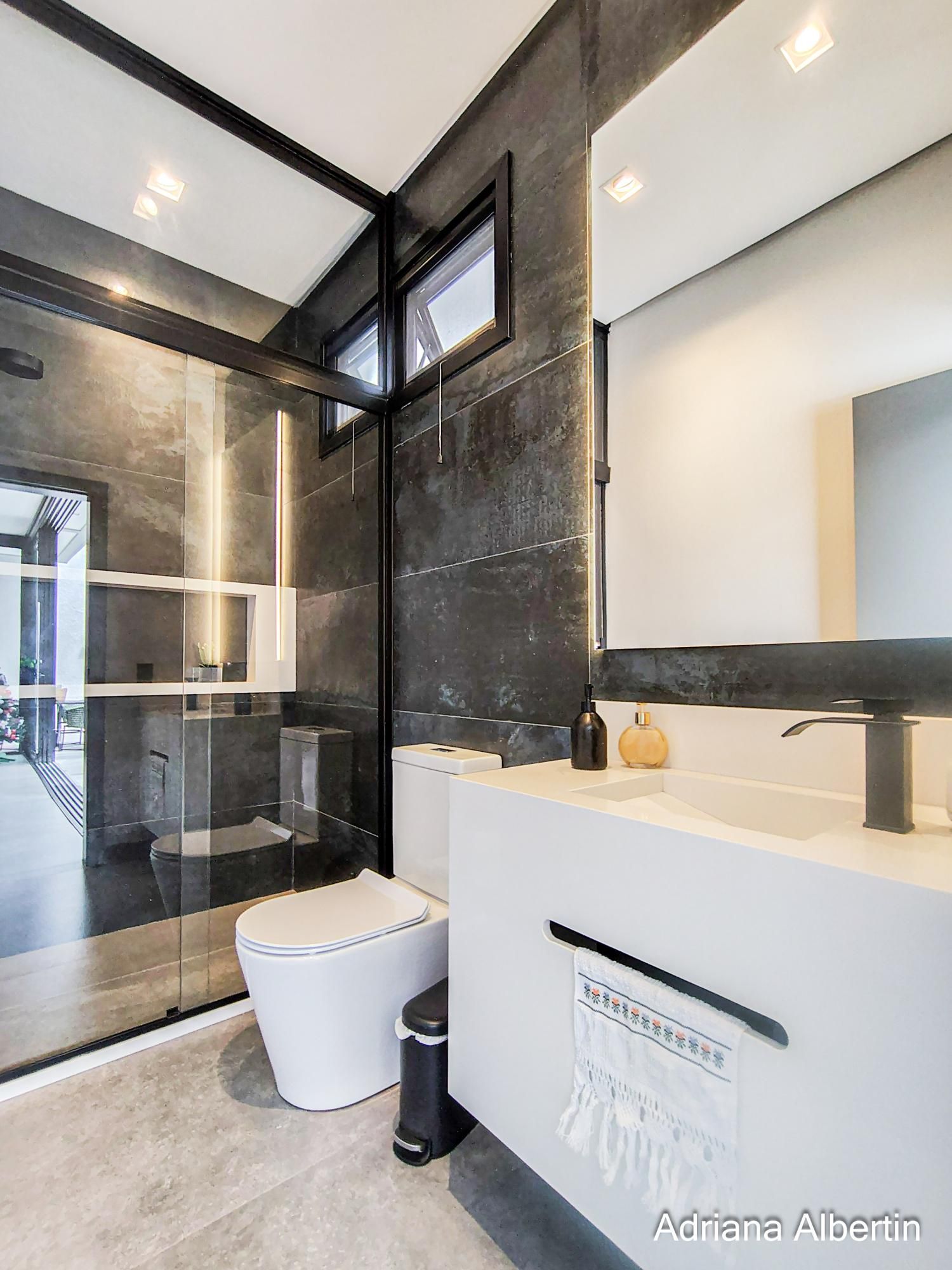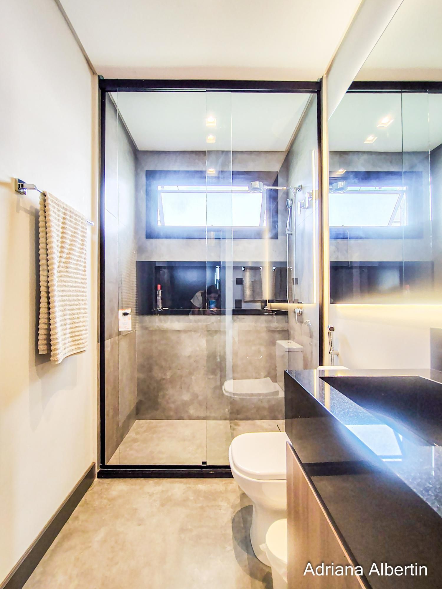 Os acabamentos reforçam a proposta do imóvel: porcelanato nas áreas sociais, piso vinílico na área íntima, piso aquecido nos banheiros da área íntima, persianas automatizadas, esquadrias em alumínio preto, telas anti-insetos e brises em alumínio com acabamento amadeirado na fachada.