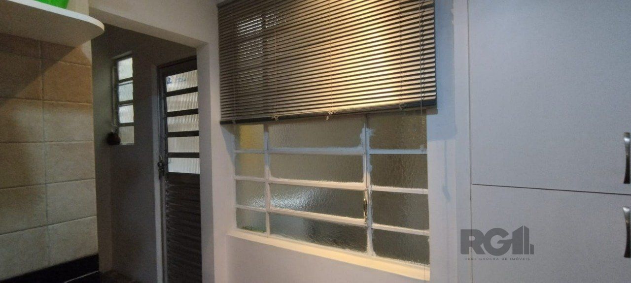 Cozinha americana planejada, com balcão de granito e janela com persiana. Área de serviço separada e espaçosa, tipo pátio.