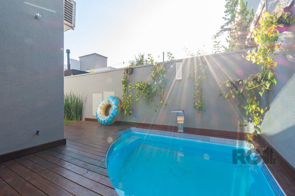 São 3 dormitórios, uma suíte, banheiro social, sala com dois ambientes, cozinha montada e com churrasqueira, pátio com piscina e duas vagas.