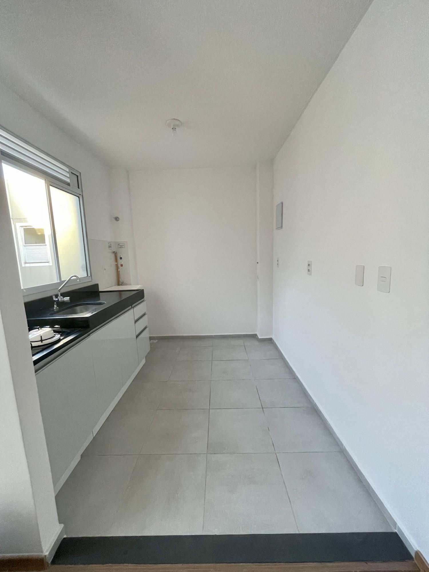 Cozinha, sala e banheiro com pisos porcelanato.