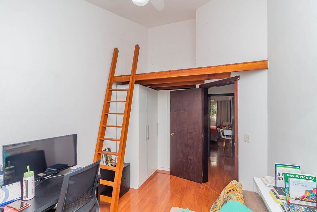 3 dormitórios, sendo 1 suíte ampla com closet e sacada, 1 dormitório/escritório com mezanino e sacada, e 1 quarto de hóspedes. Banheiro social completo.