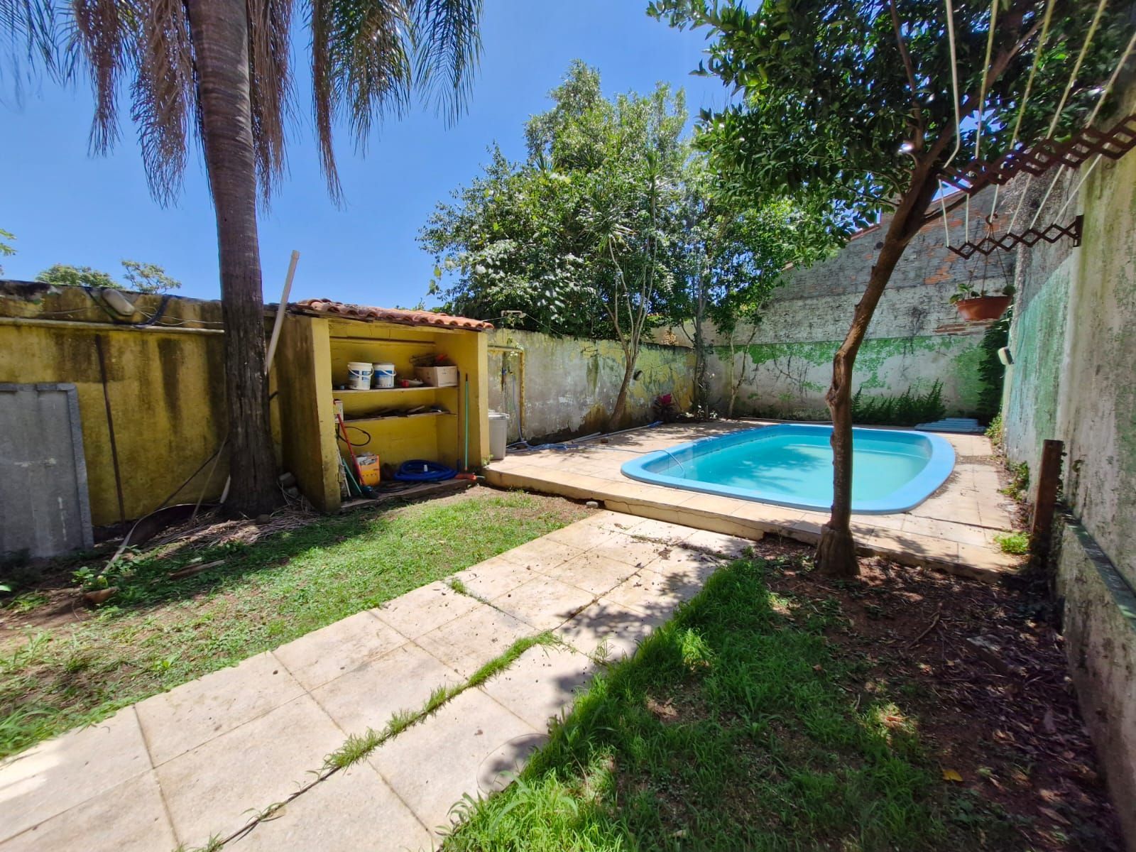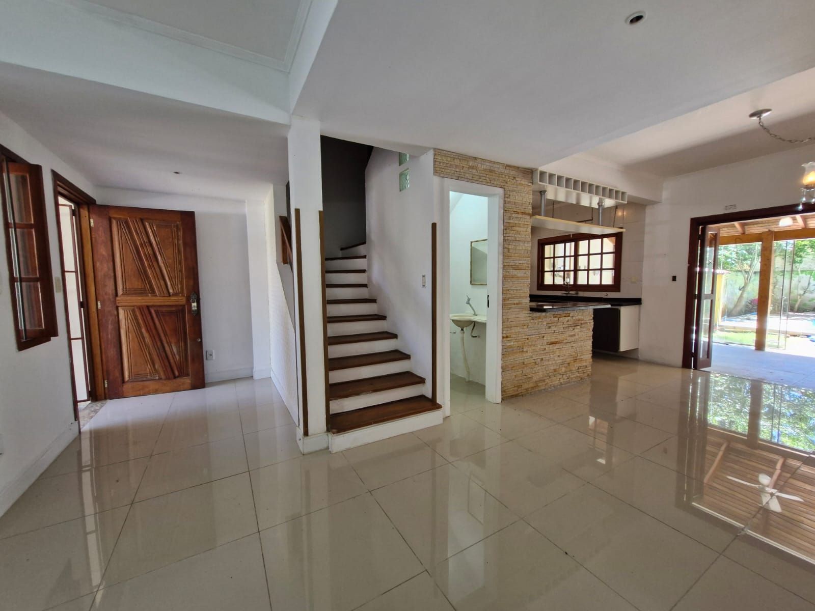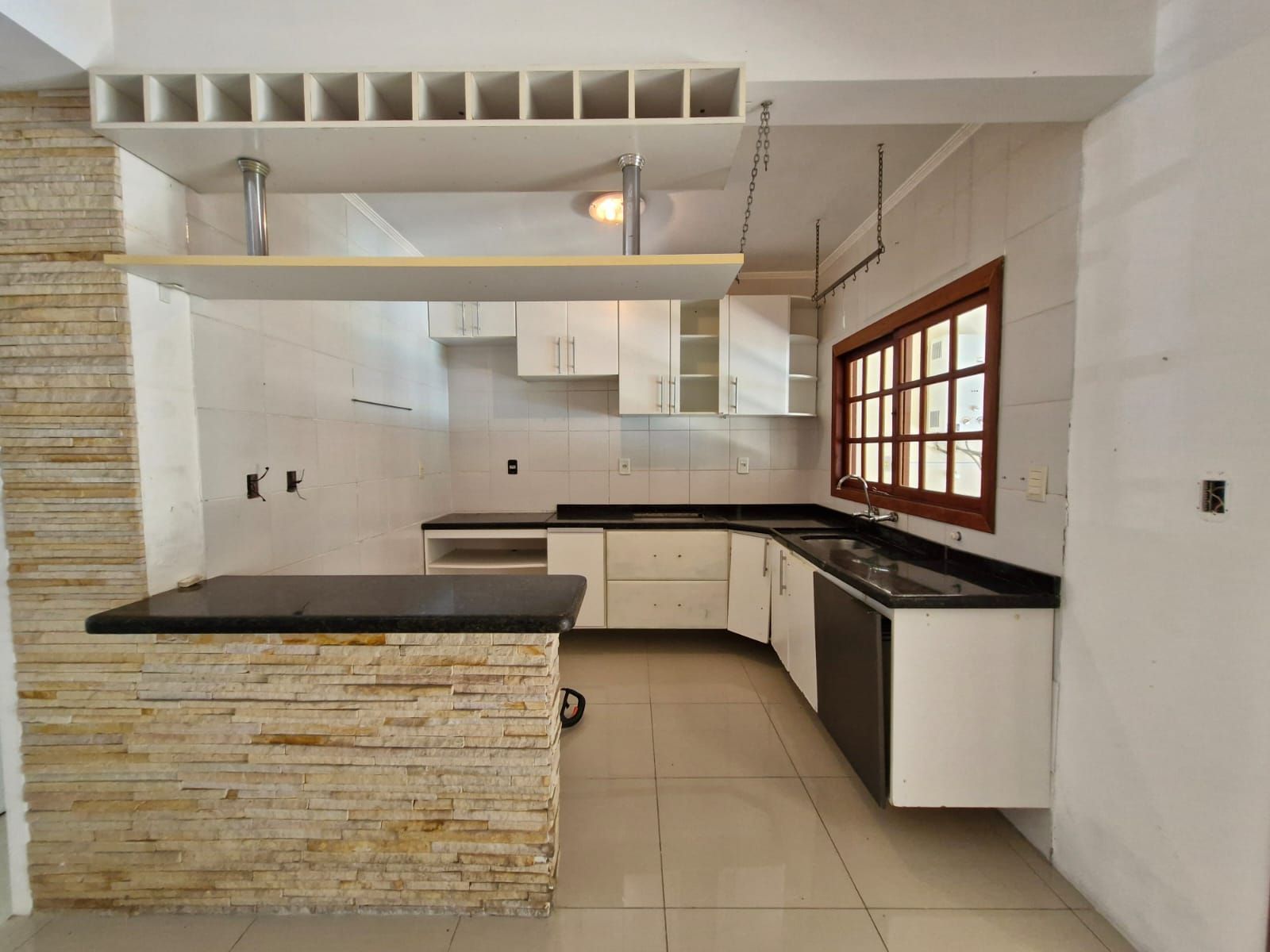 No térreo, conta com hall de entrada, living estendido, cozinha americana, 1 banheiro auxiliar, área fechada com vidros e churrasqueira. Possui pátio com piscina e vaga para 2 carros.