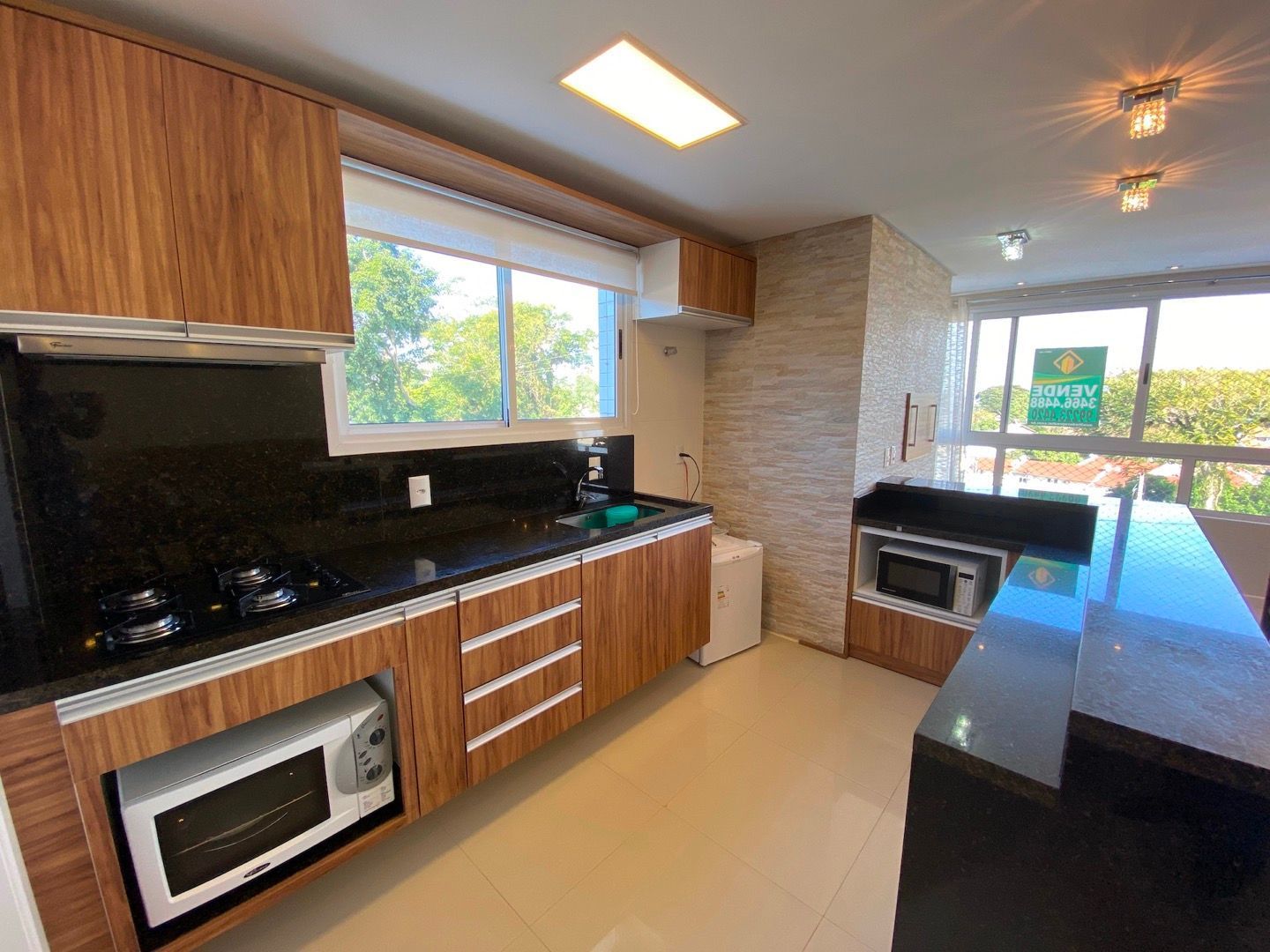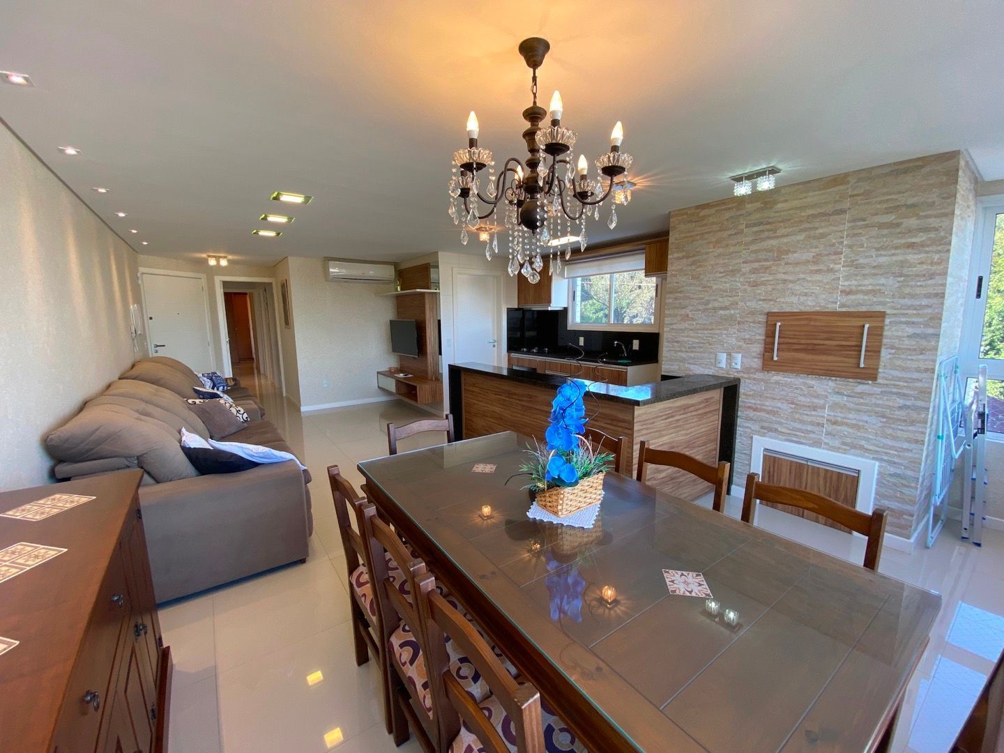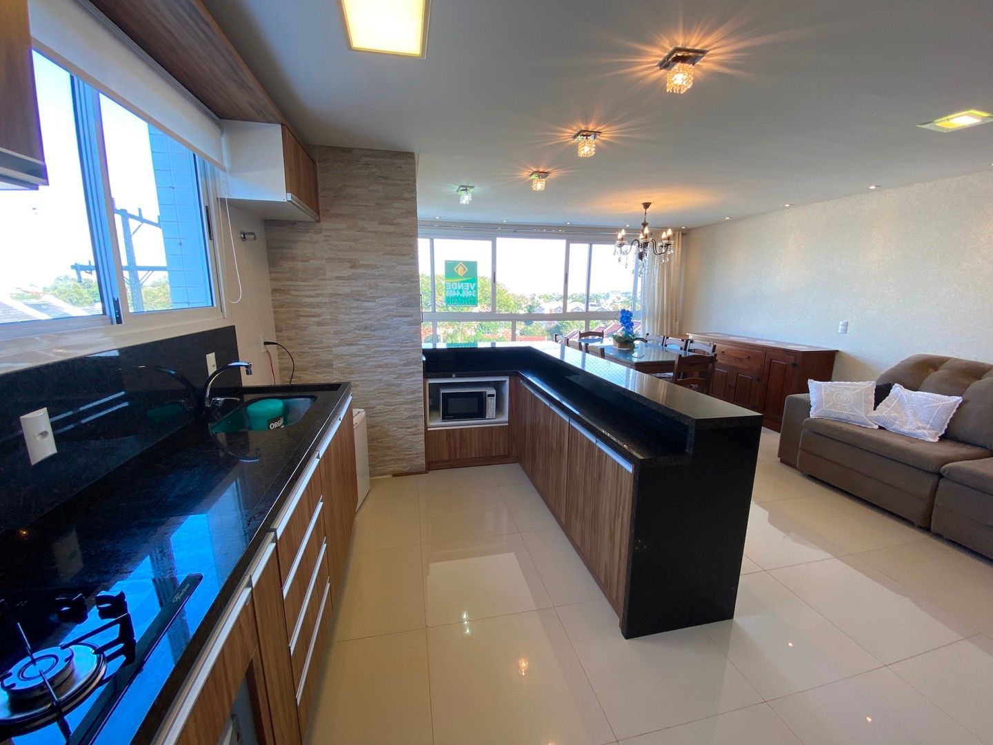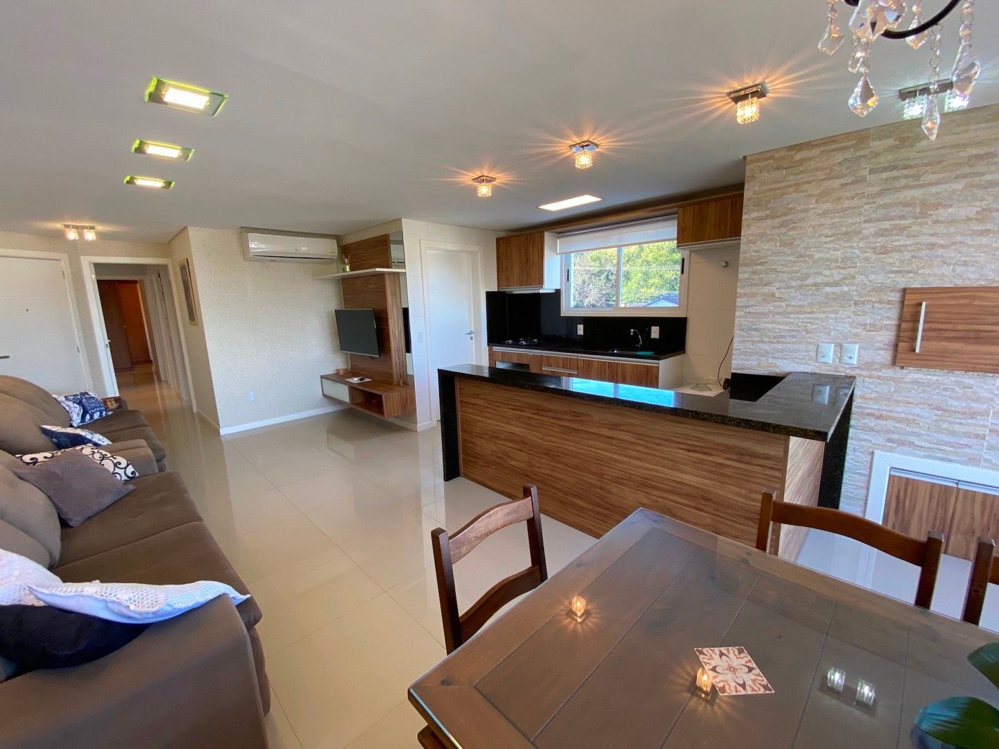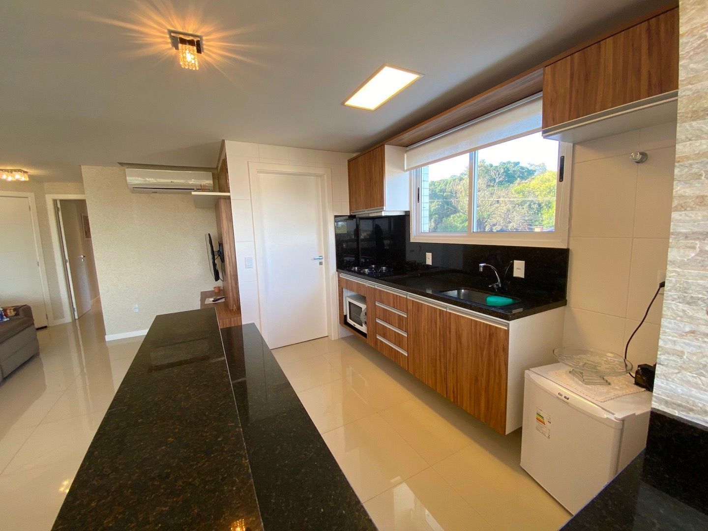 Amplo living para dois ambientes, integrado à cozinha americana com churrasqueira;