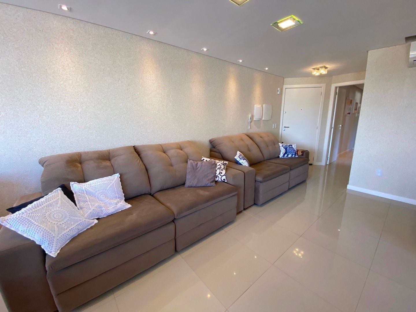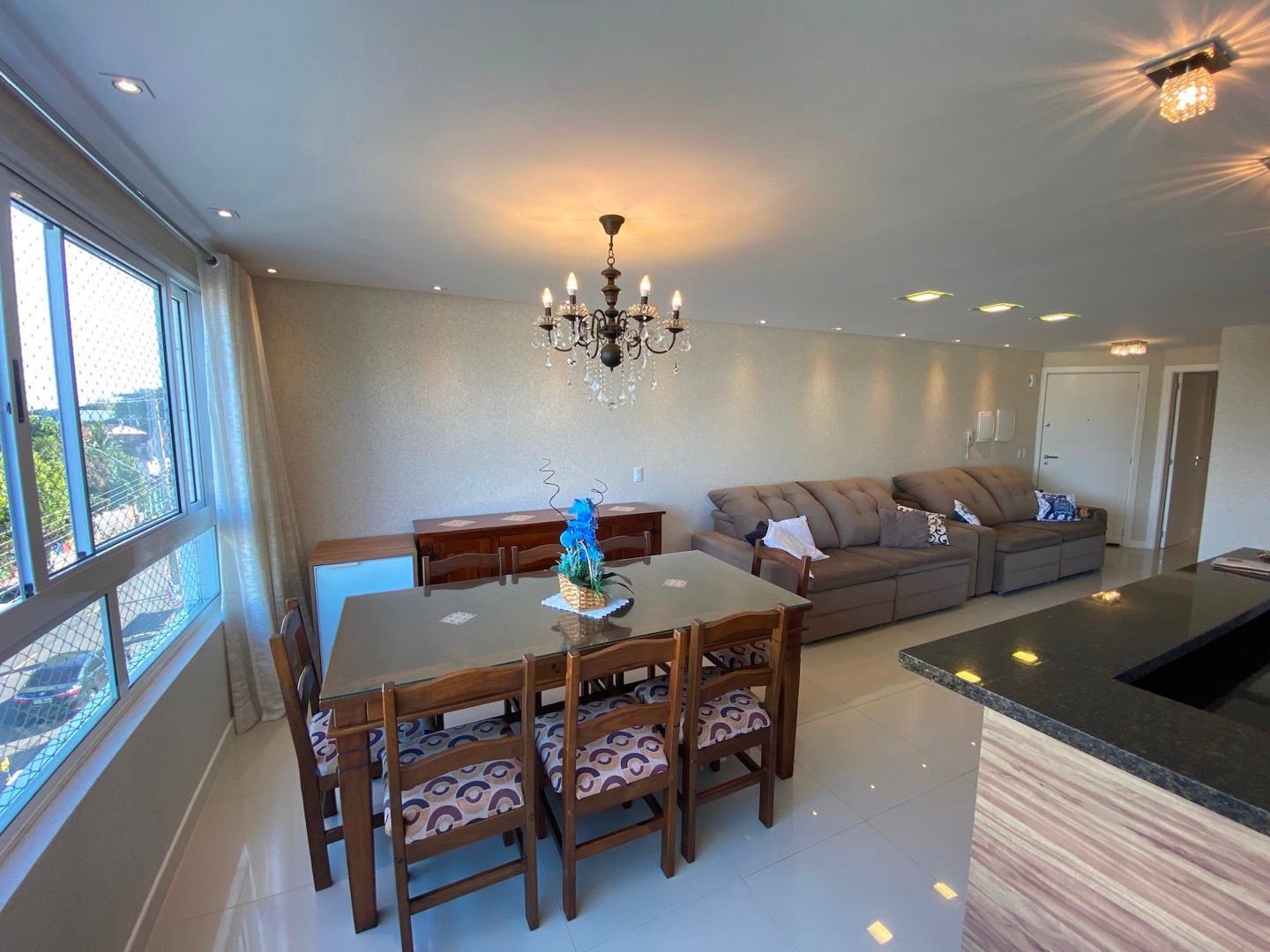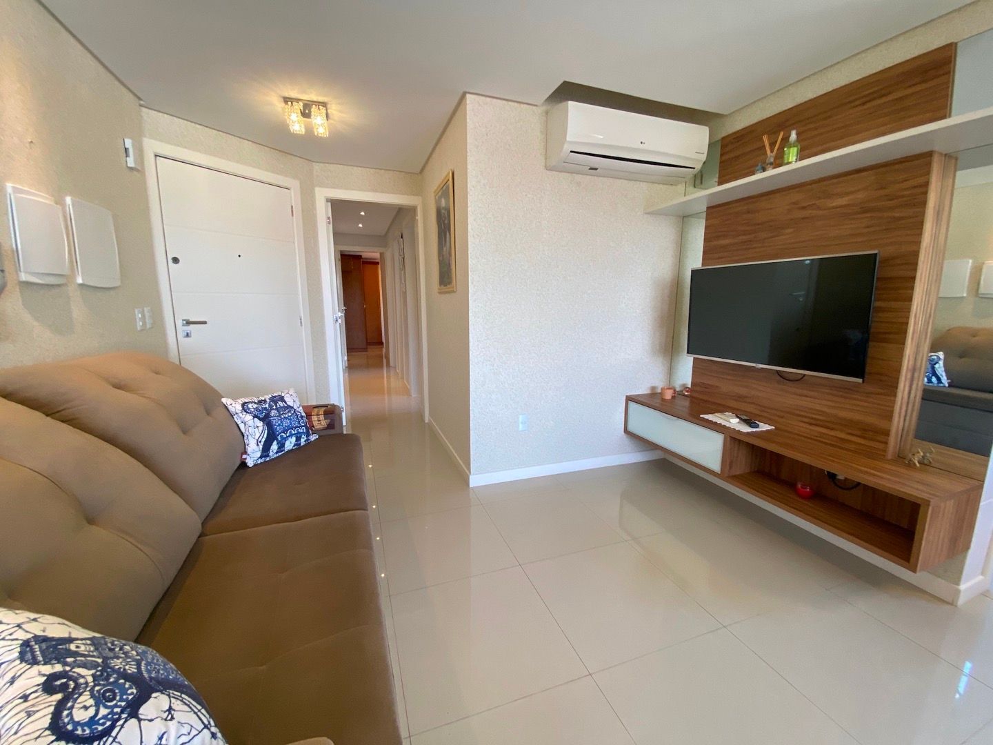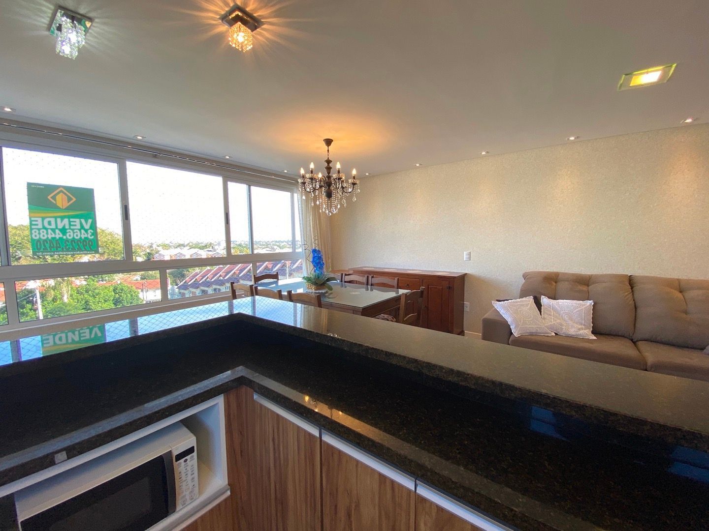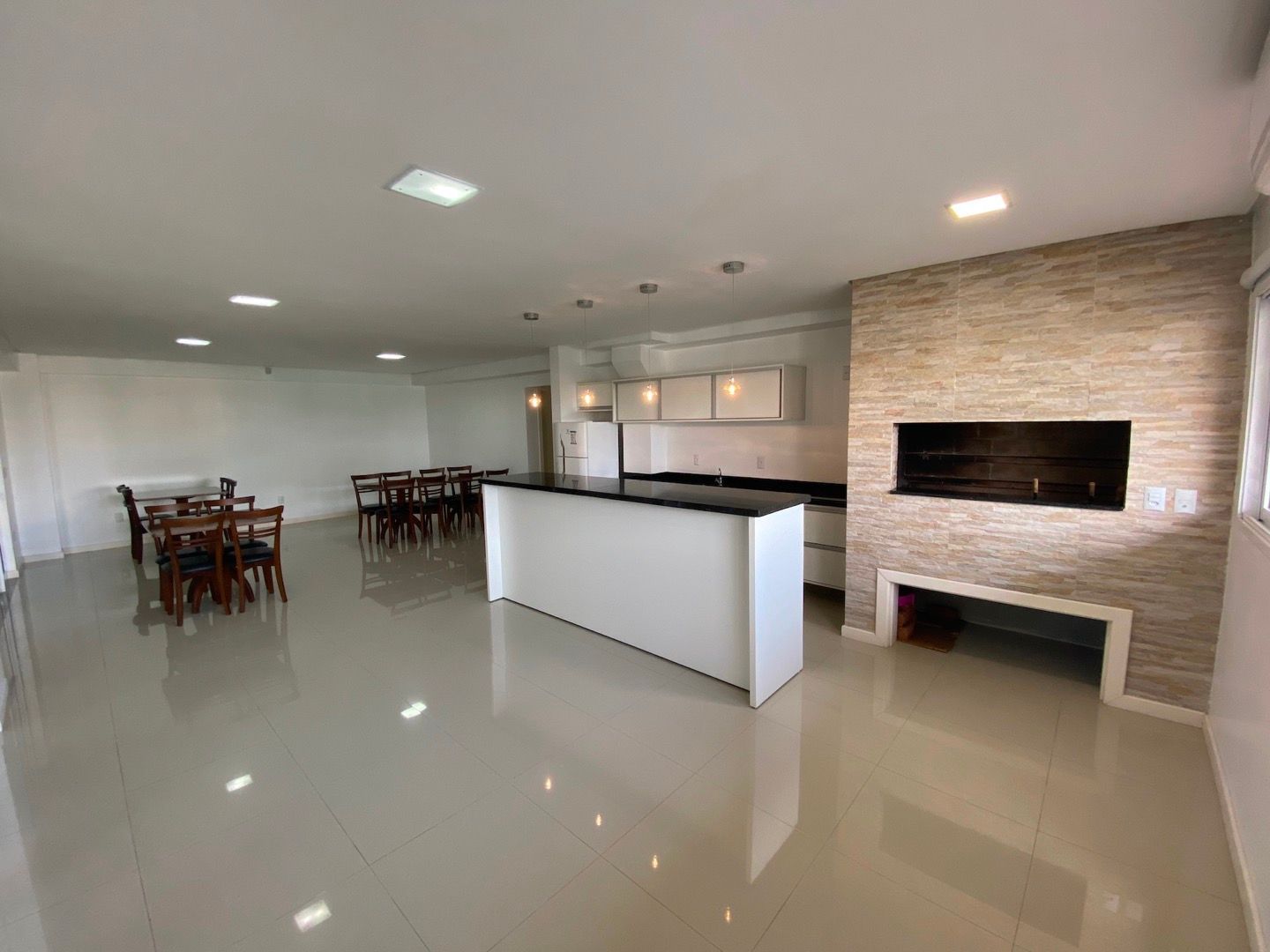 Amplo living para dois ambientes, integrado à cozinha americana com churrasqueira;