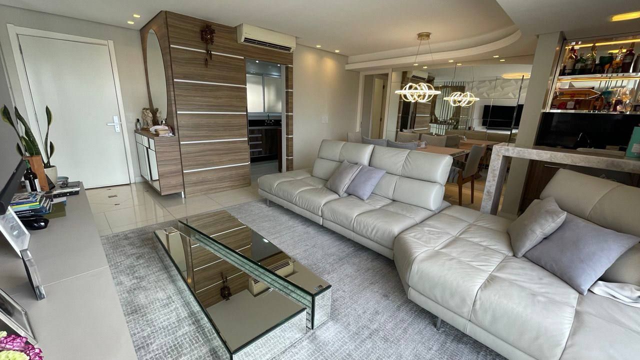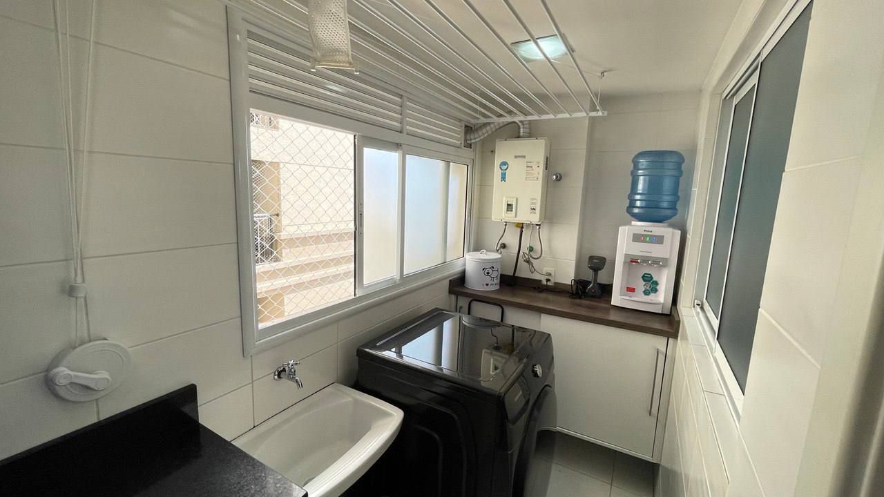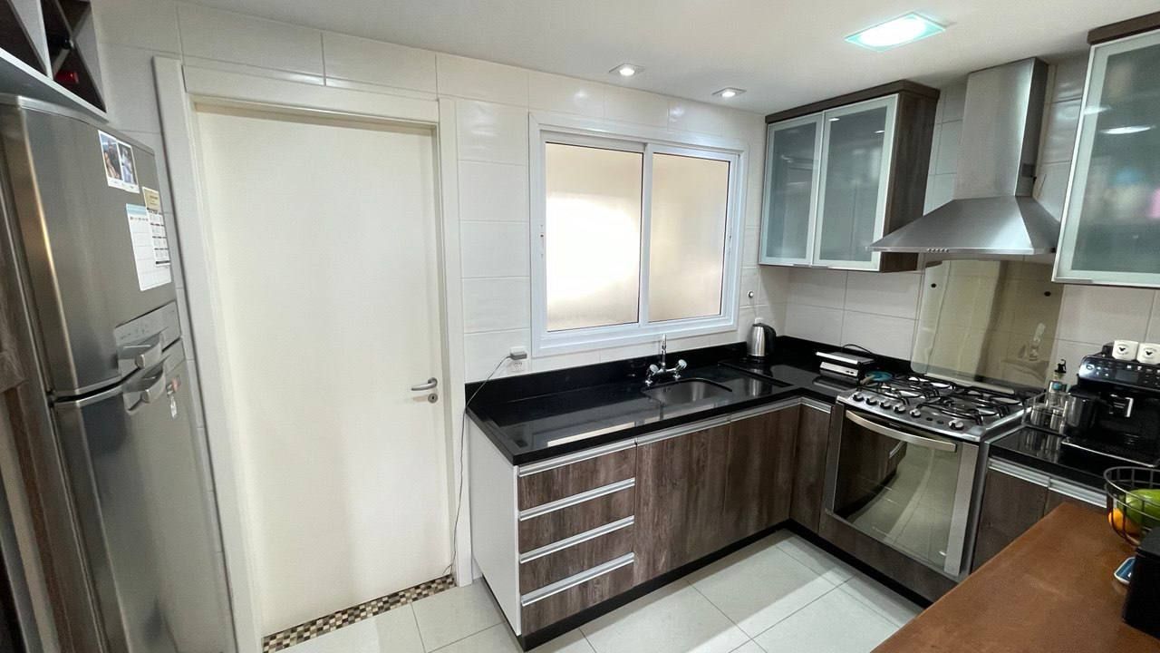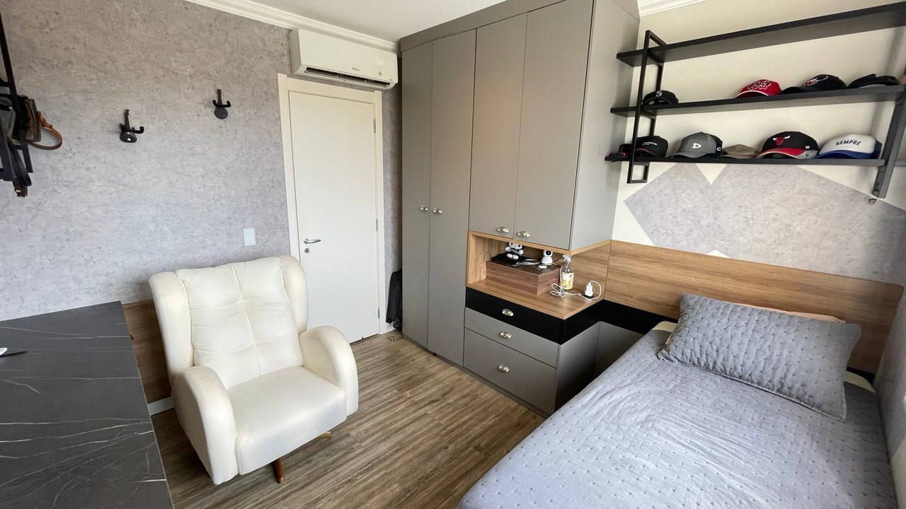 Além disso, o apartamento conta com uma cozinha americana, área de serviço, estar social, varanda gourmet, churrasqueira e ar condicionado, proporcionando um ambiente agradável e funcional. Com móveis planejados, luminárias e janelas grandes, a iluminação e a organização do espaço são garantidas.