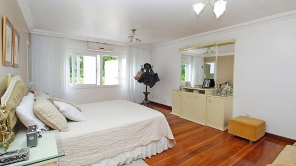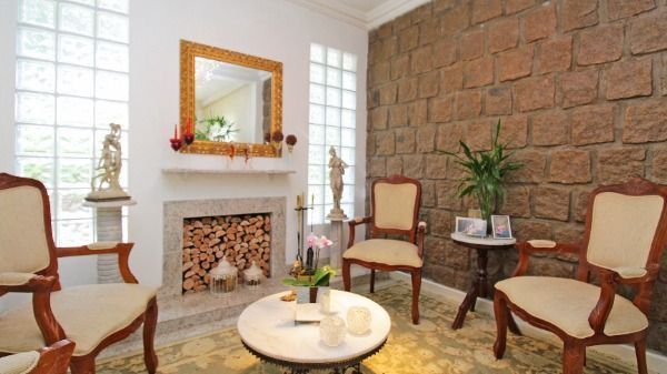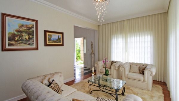 Distribuída em dois pavimentos, no térreo um amplo hall com pé direito duplo, duas salas de estar, uma delas com lareira, sala de jantar, lavabo, copa cozinha, sala de TV com lareira, suíte completa e lavanderia.
