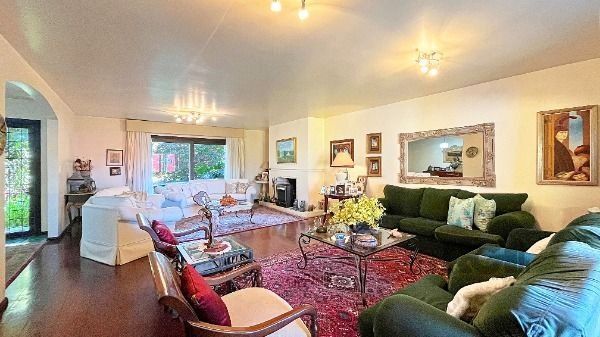 Pavimento superior: Amplo living para 02 ambientes com lareira, piso em tabuão/cerâmico e avarandado externo.