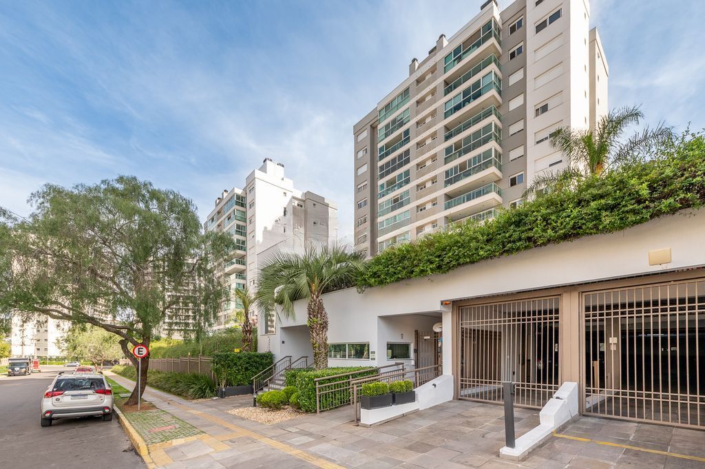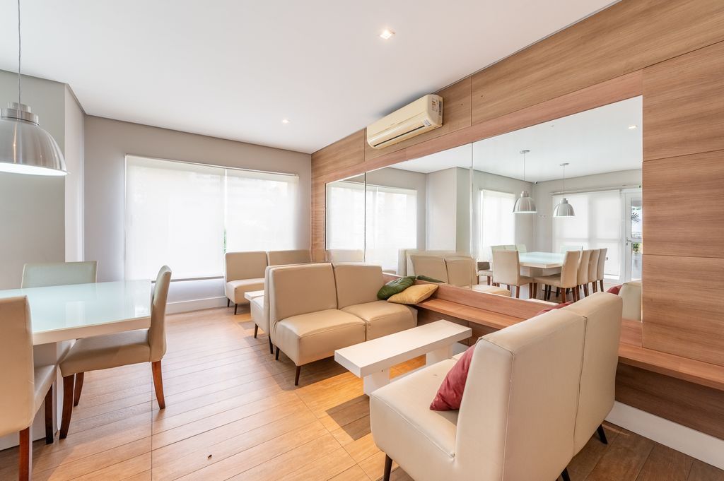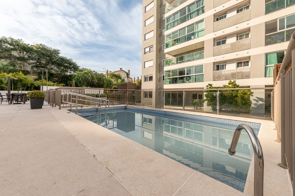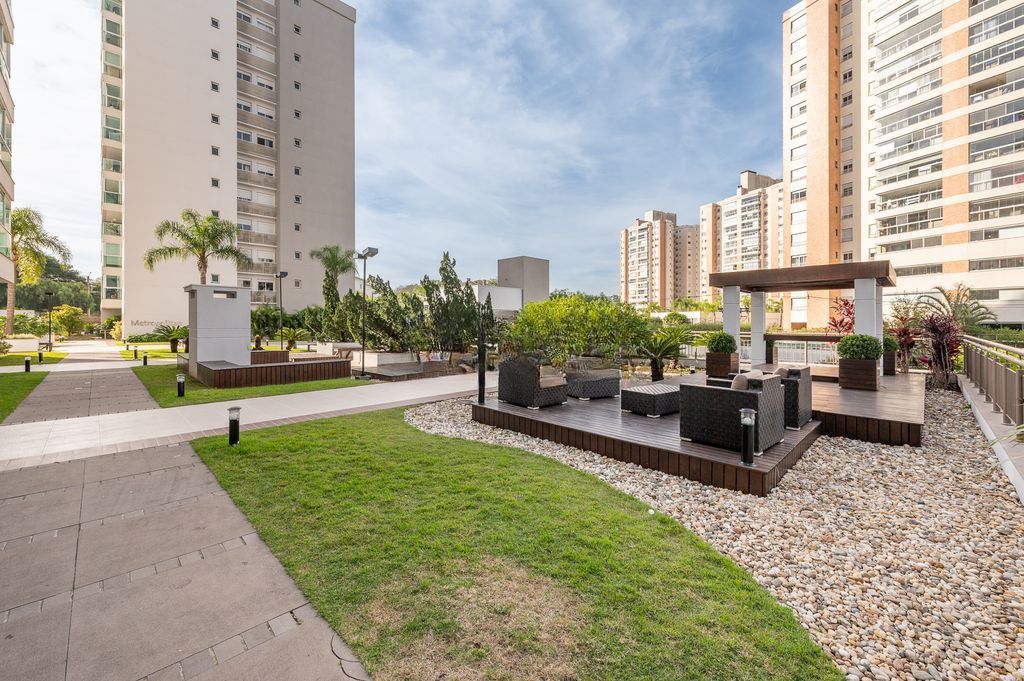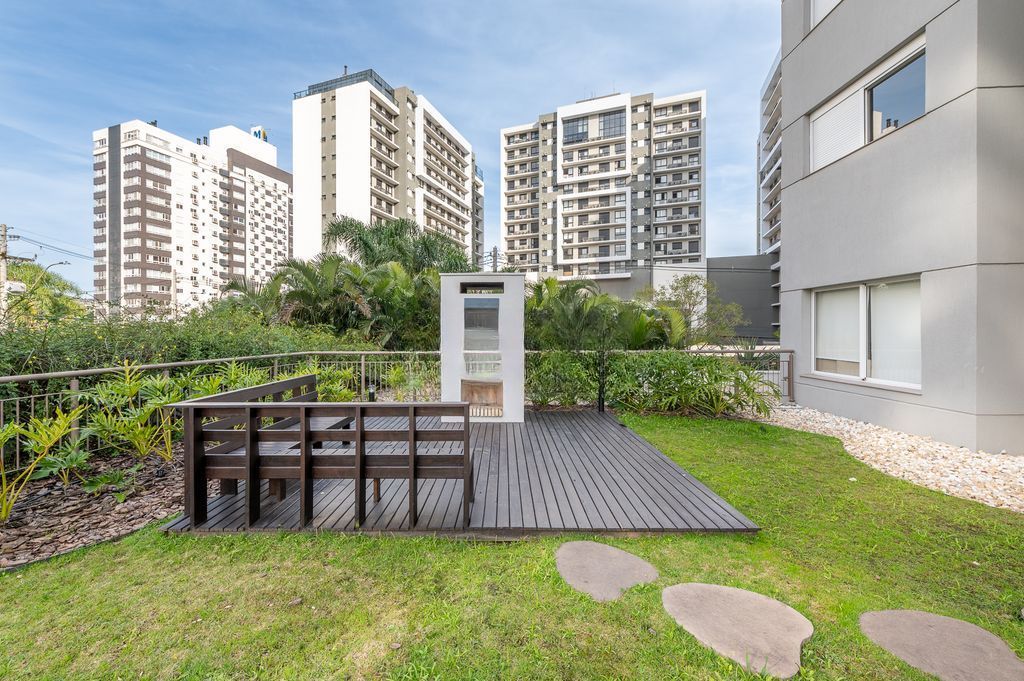 Apartamento garden com 3 dormitórios amplos, sendo 2 suítes. Living com lareira, churrasqueira com espaço gourmet, sala de jantar, cozinha americana com balcão em mármore, área de serviço separada e um depósito privativo. Um generoso espaço garden externo que recebe sol e ventilação o dia todo.