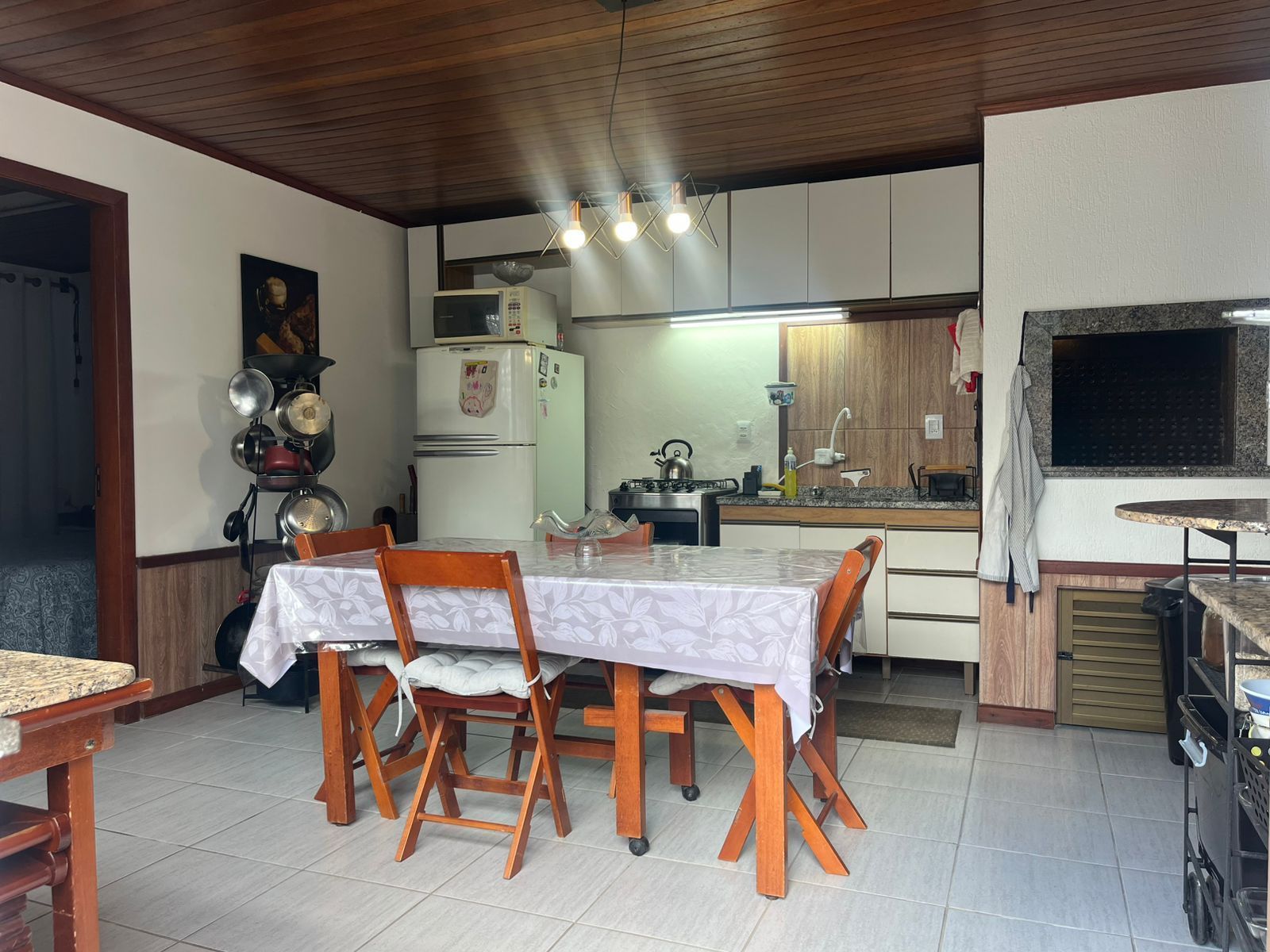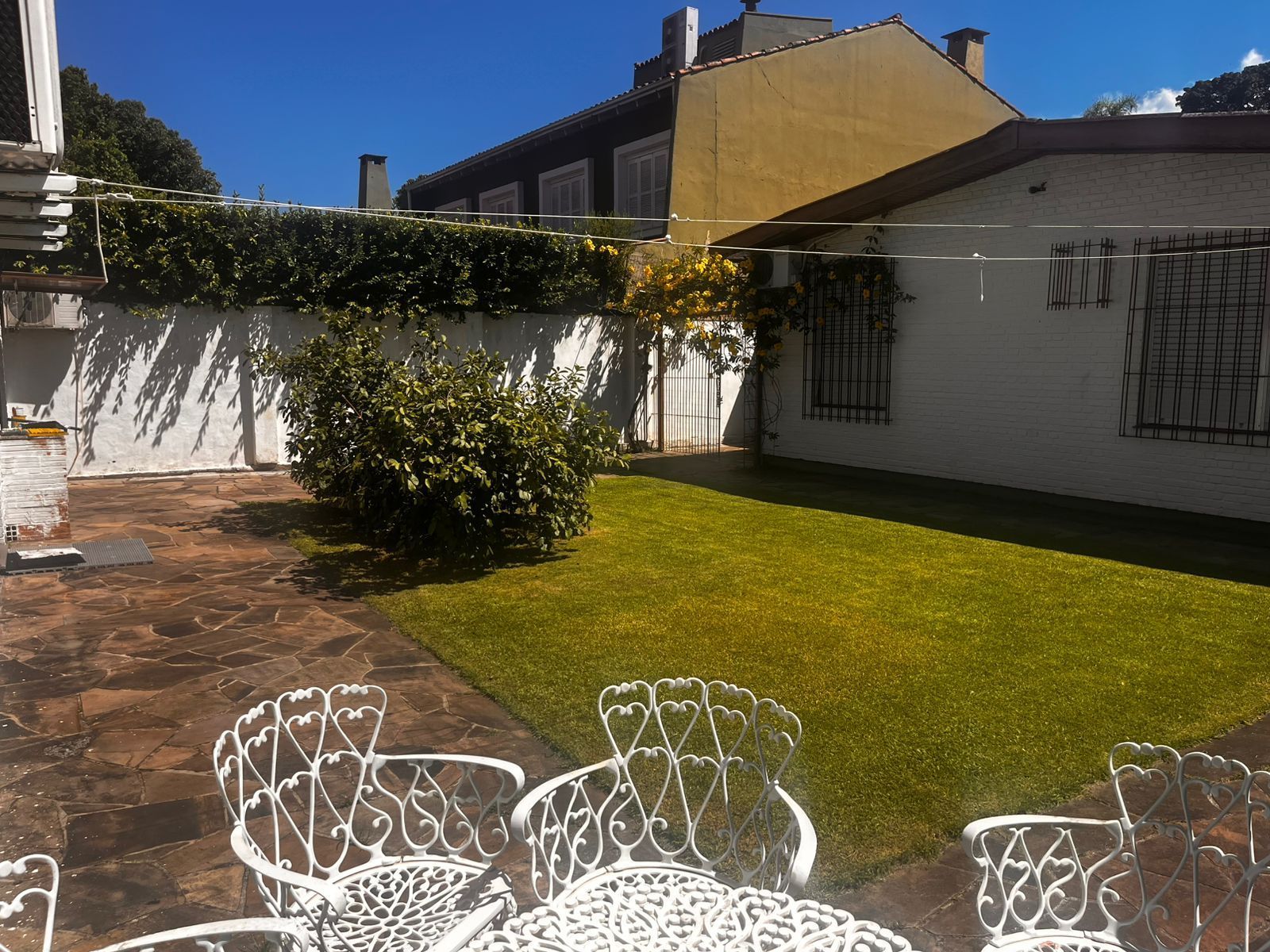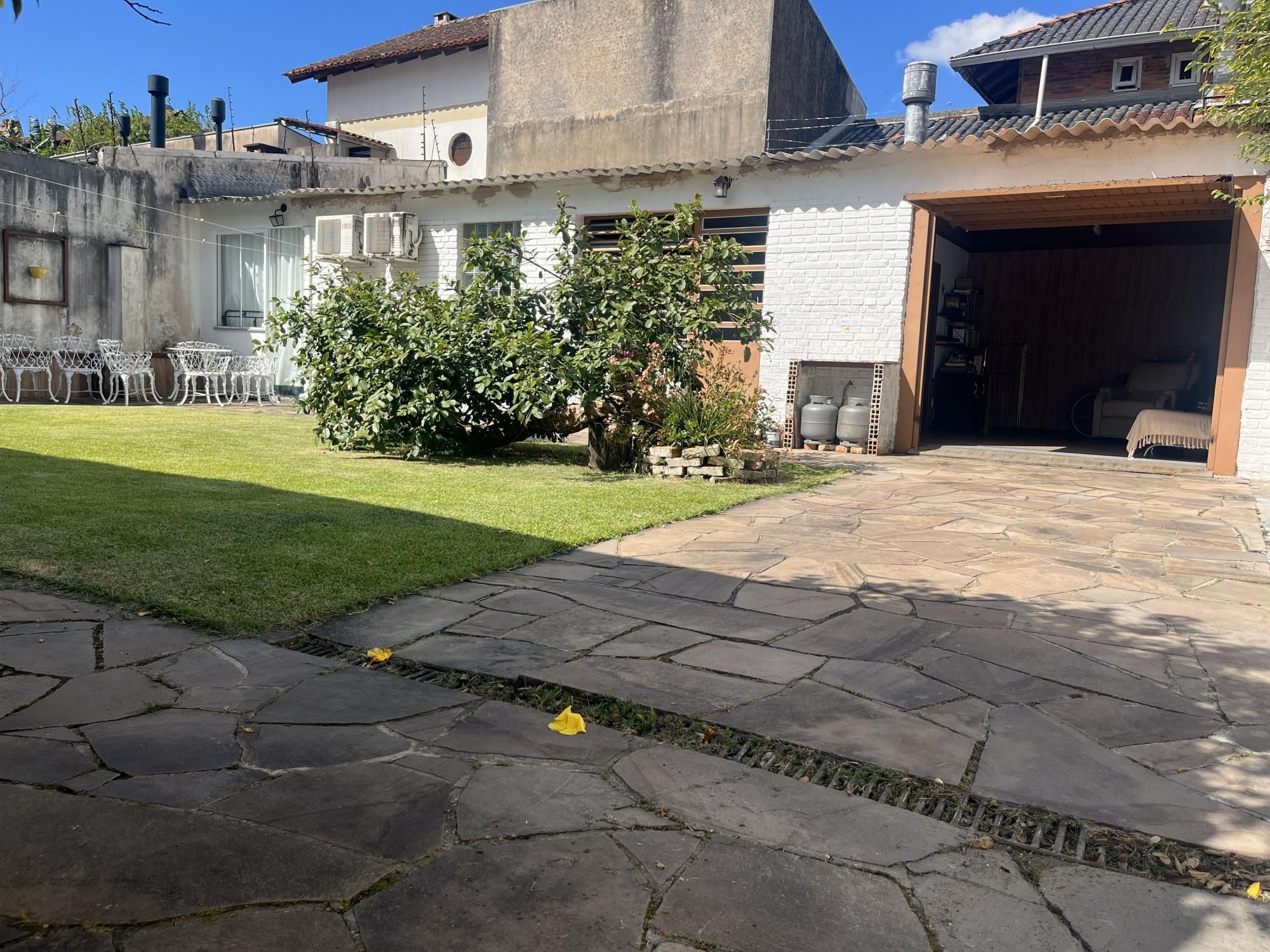 Nos fundos, o pátio arborizado oferece uma área social independente, ideal para lazer e convivência, composta por espaço com churrasqueira, 1 dormitório com ar-condicionado e banheiro completo.