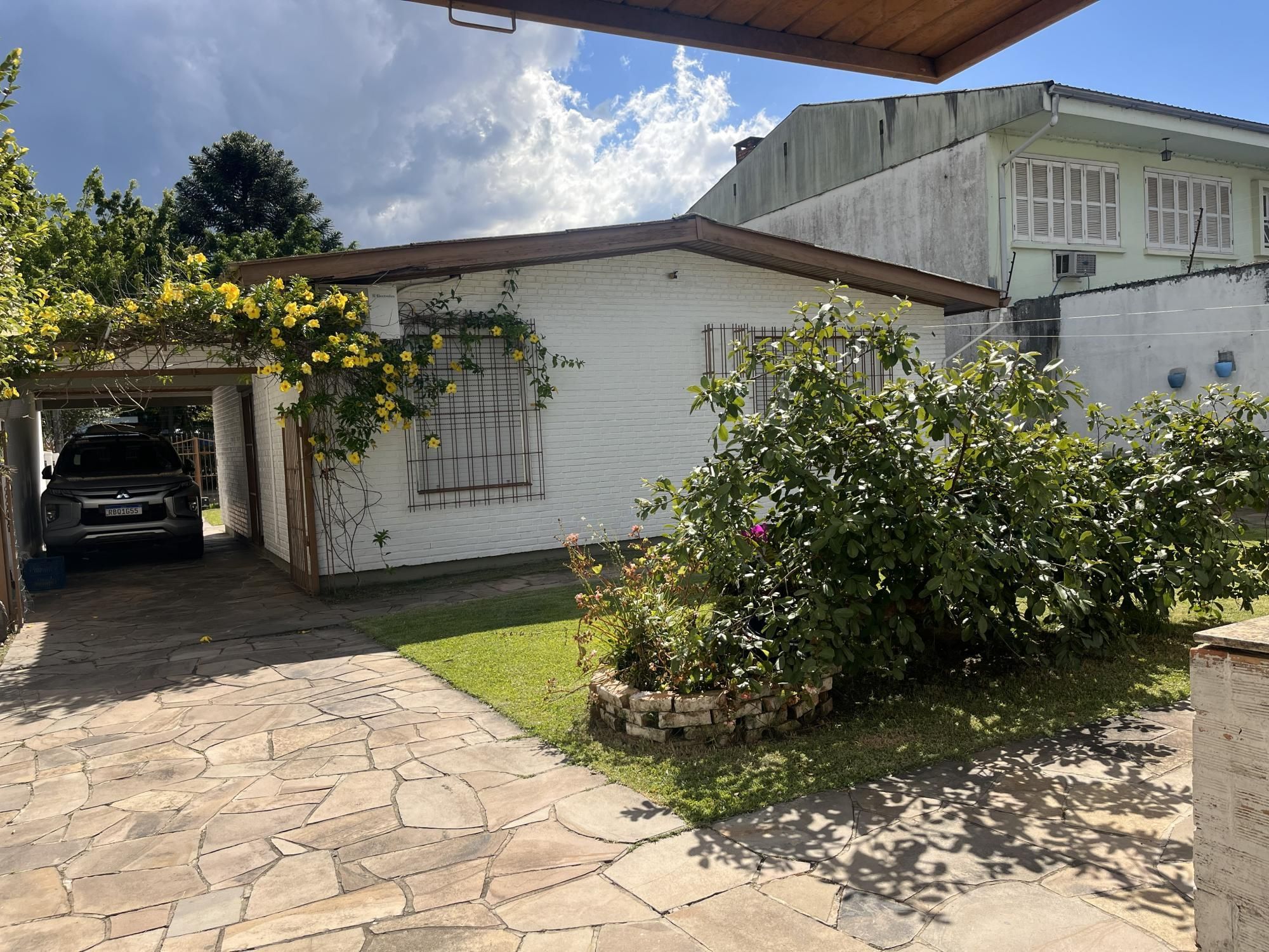 Casa térrea em terreno totalmente plano, com jardim. O imóvel principal conta com 2 dormitórios, banheiro social, sala de estar e jantar integradas com espera para lareira, cozinha e área de serviço, além de 3 vagas de garagem.