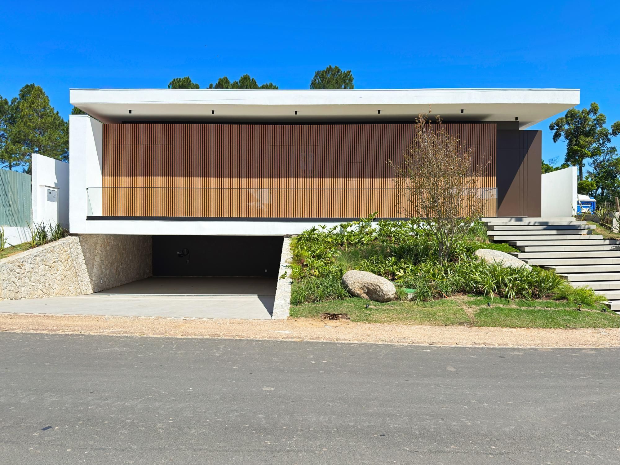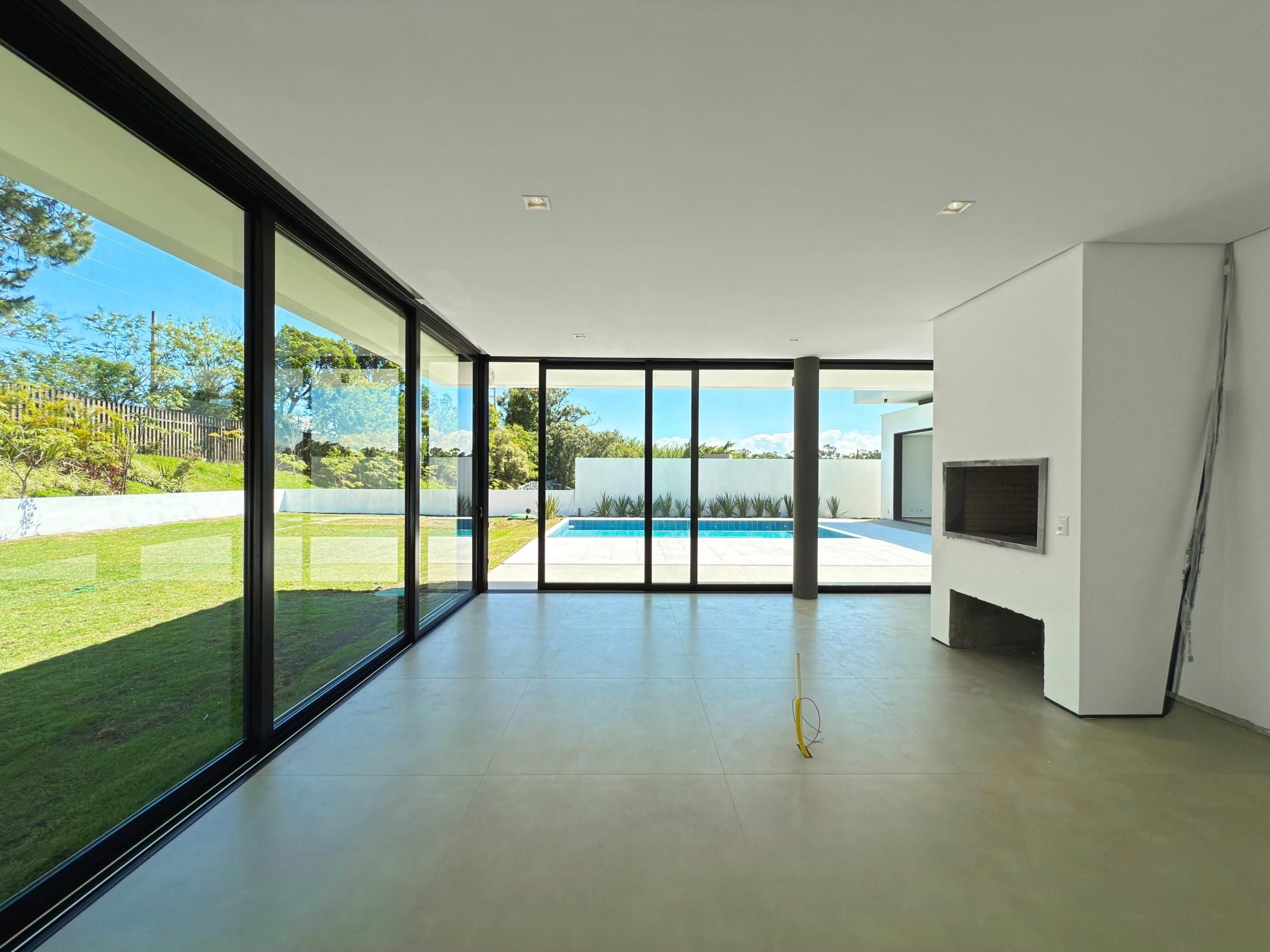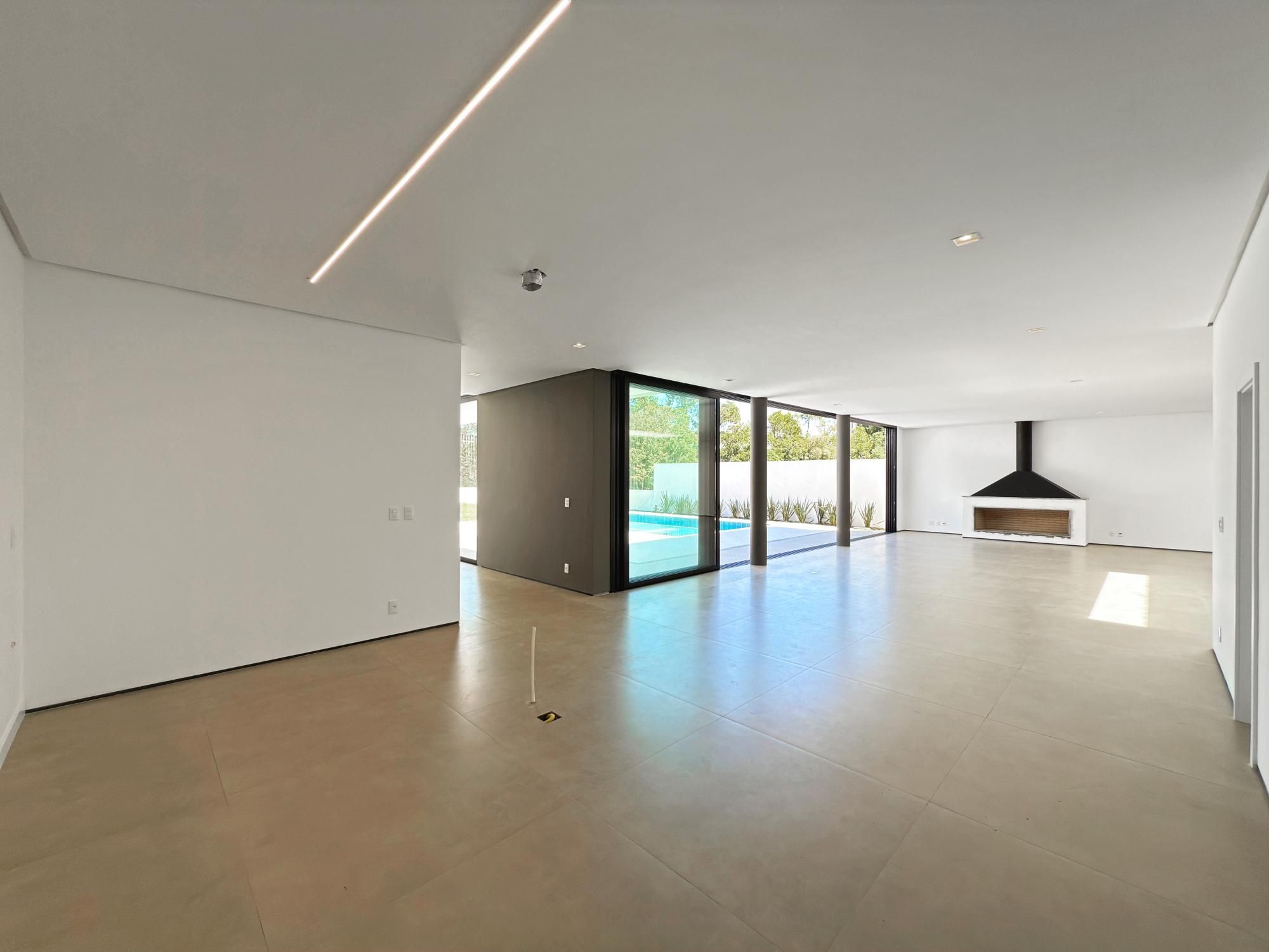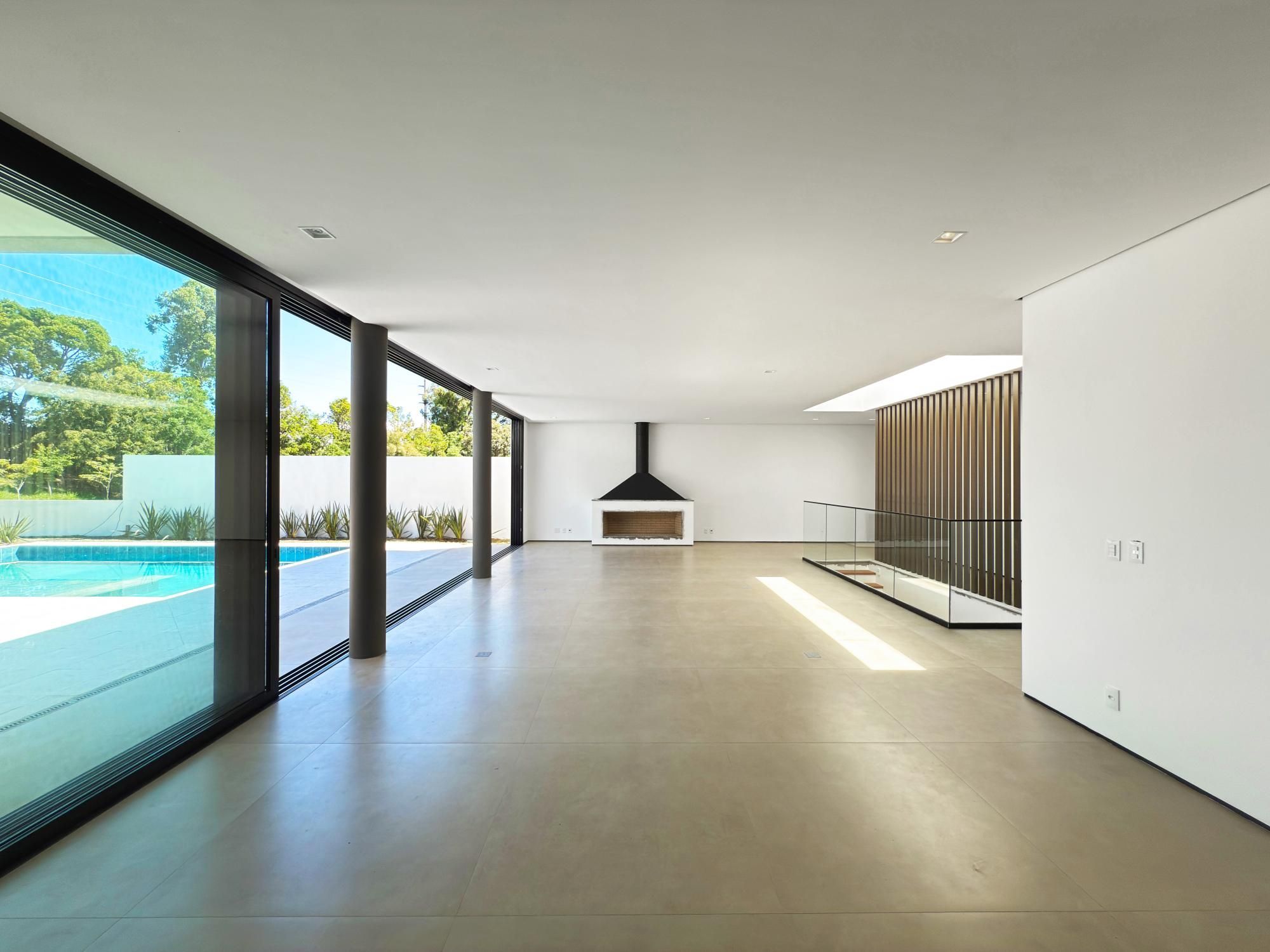 carregador de carro elétrico, e uma ?Men?s Cave?, um espaço de 16m2 destinado ao universo masculino, podendo ser um ambiente para apreciação dos seus automóveis preferidos, ou uma sala de jogos, sala de ferramentas, adega ou charutaria. O acesso à casa no pavimento superior se dá pela escada com claraboia ou pelo elevador. Na área íntima, são 4 suítes, sendo 3 voltadas para a fachada frontal da casa, todas com sacada. A suíte máster é de tirar o fôlego, com espaço para closet e espaço penteadeira. O banheiro da suíte máster conta com banheira de imersão, espaço para duas cubas e dois chuveiros. O amplo living conta com 100m2, com pé direito de 3 metros, espaço para 4 ambientes, inclusive adega vertical para 100 garrafas, integrado à cozinha em conceito aberto e com saída total por amplas aberturas para a área externa e de piscina, sendo esta entregue com aquecimento solar e prainha. O living se conecta ao ambiente gourmet, passando antes pela suíte de hóspedes e espaço para escritório, que também pode ser uma academia ou estúdio. O gourmet tem saída lateral para uma ampla varanda e área de piscina, assim como, saída para o fundo do terreno com acesso a área de lareira externa, propiciando o uso integrado destes ambientes em qualquer estação do ano.Na área externa, oferecemos como alternativa a construção de uma quadra