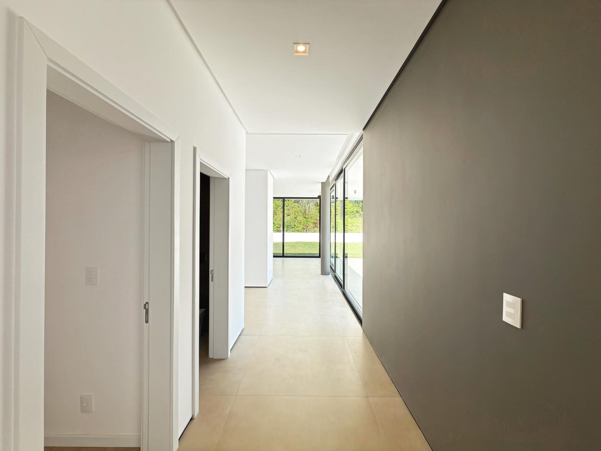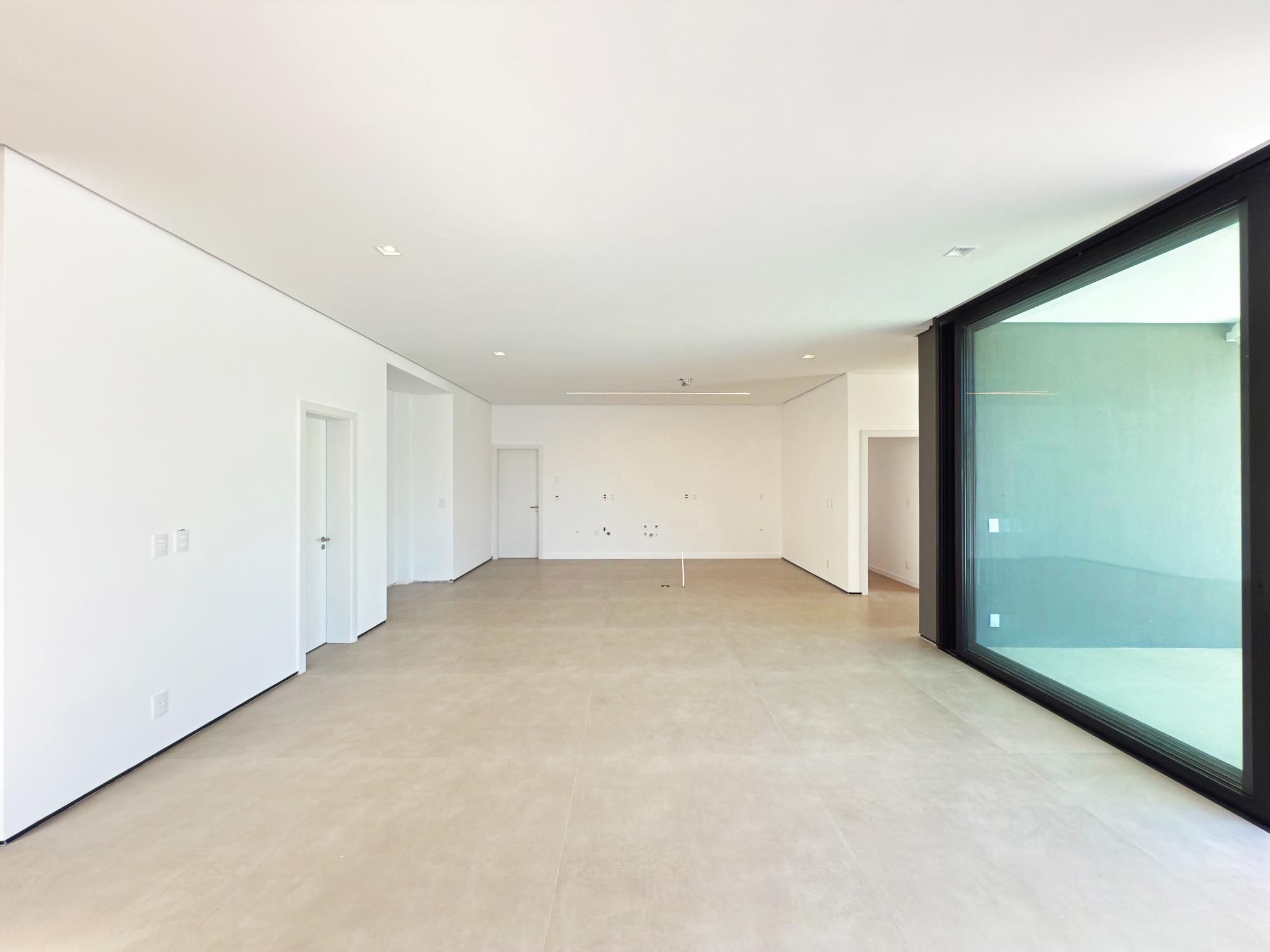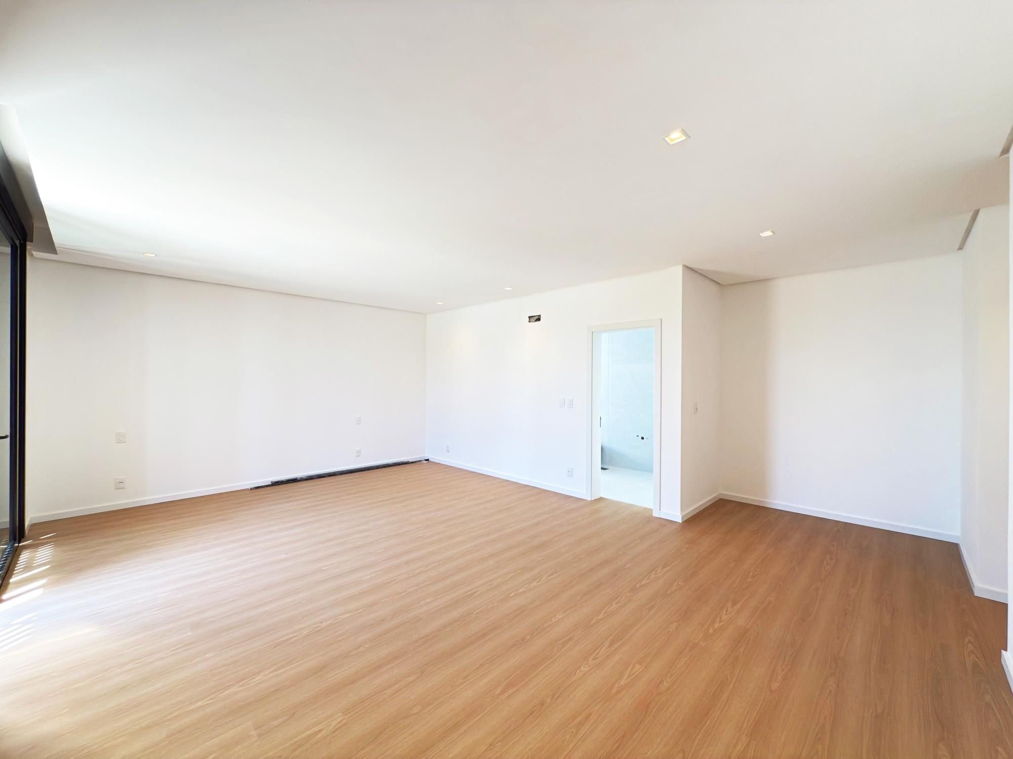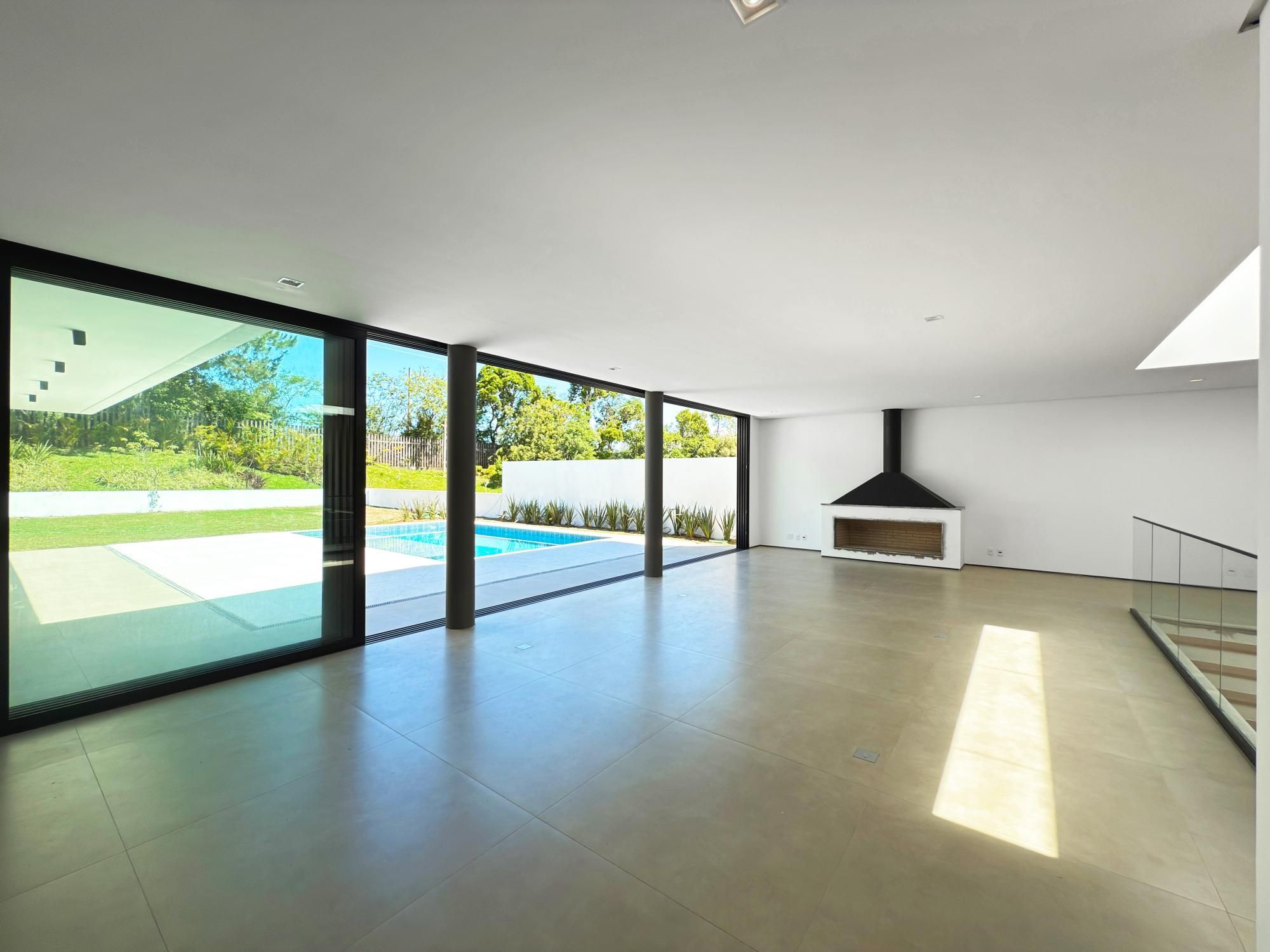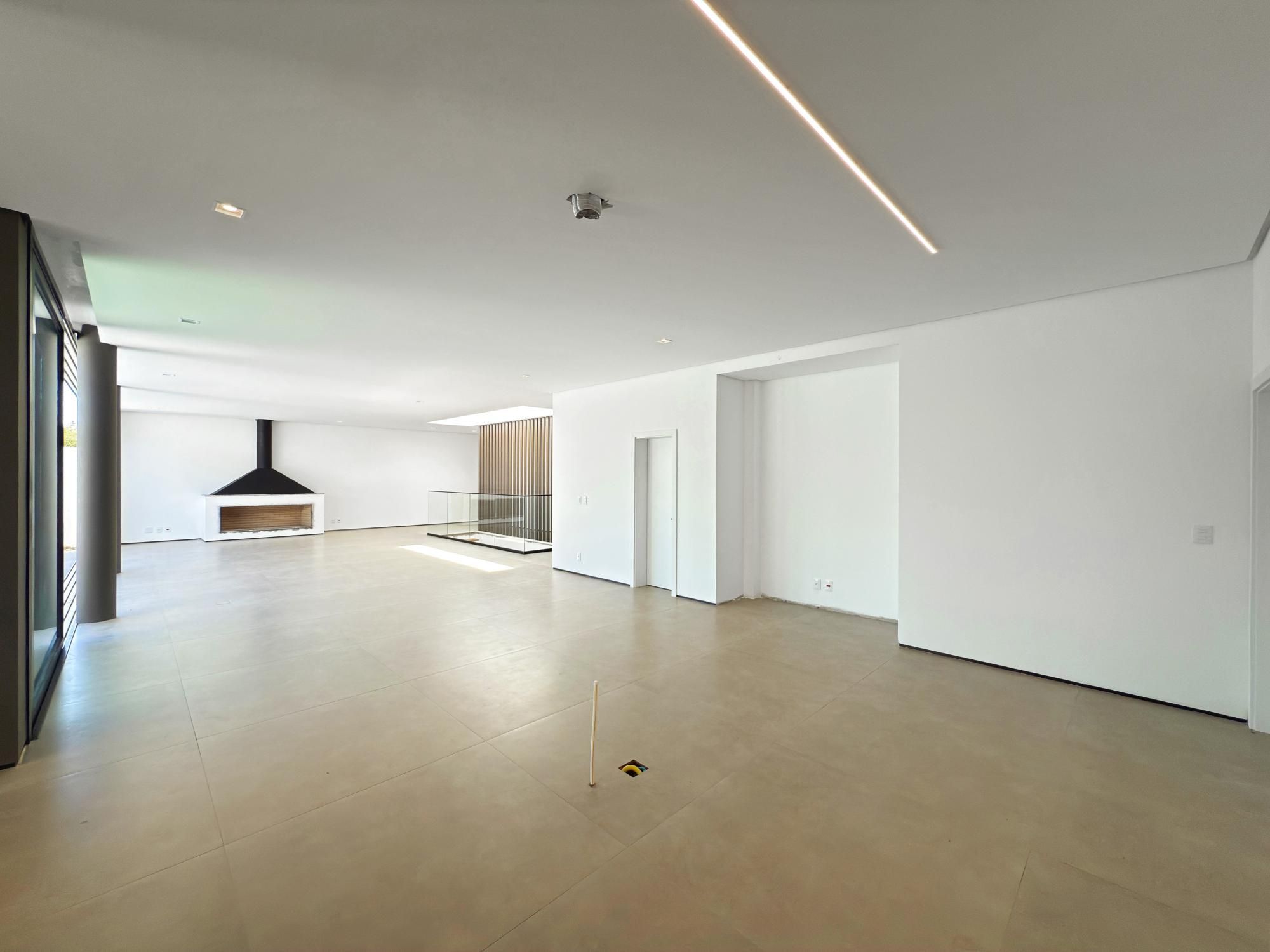 carregador de carro elétrico, e uma ?Men?s Cave?, um espaço de 16m2 destinado ao universo masculino, podendo ser um ambiente para apreciação dos seus automóveis preferidos, ou uma sala de jogos, sala de ferramentas, adega ou charutaria. O acesso à casa no pavimento superior se dá pela escada com claraboia ou pelo elevador. Na área íntima, são 4 suítes, sendo 3 voltadas para a fachada frontal da casa, todas com sacada. A suíte máster é de tirar o fôlego, com espaço para closet e espaço penteadeira. O banheiro da suíte máster conta com banheira de imersão, espaço para duas cubas e dois chuveiros. O amplo living conta com 100m2, com pé direito de 3 metros, espaço para 4 ambientes, inclusive adega vertical para 100 garrafas, integrado à cozinha em conceito aberto e com saída total por amplas aberturas para a área externa e de piscina, sendo esta entregue com aquecimento solar e prainha. O living se conecta ao ambiente gourmet, passando antes pela suíte de hóspedes e espaço para escritório, que também pode ser uma academia ou estúdio. O gourmet tem saída lateral para uma ampla varanda e área de piscina, assim como, saída para o fundo do terreno com acesso a área de lareira externa, propiciando o uso integrado destes ambientes em qualquer estação do ano.Na área externa, oferecemos como alternativa a construção de uma quadra