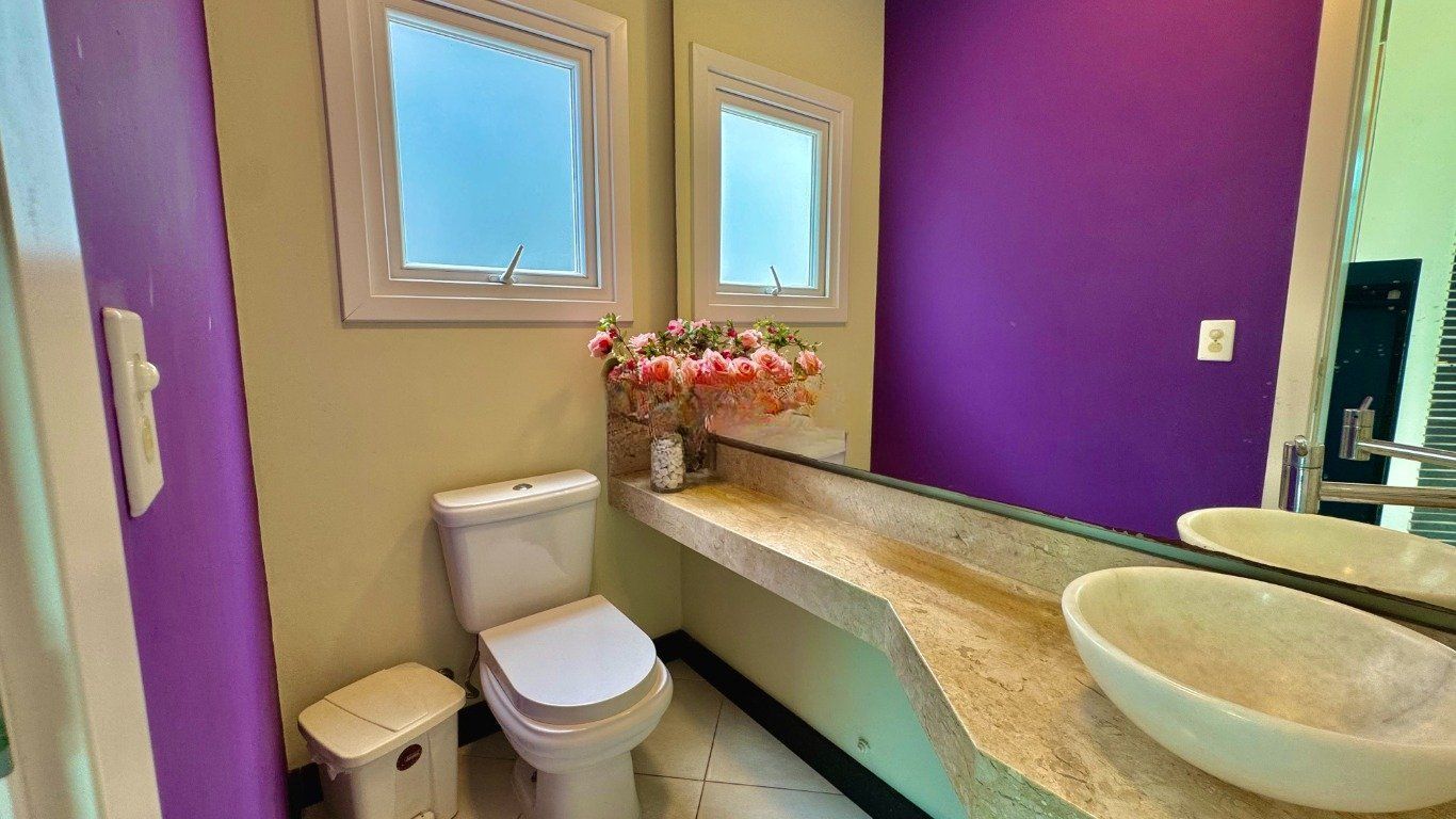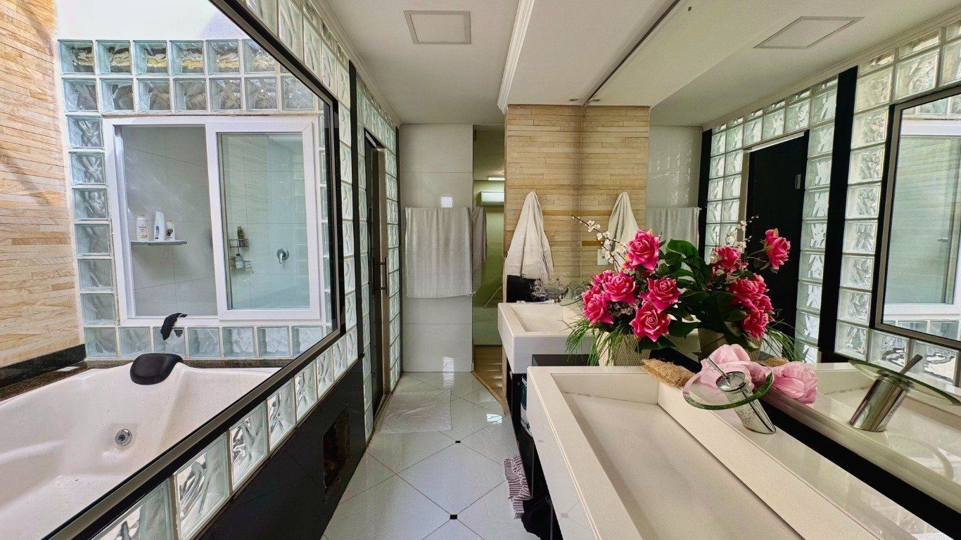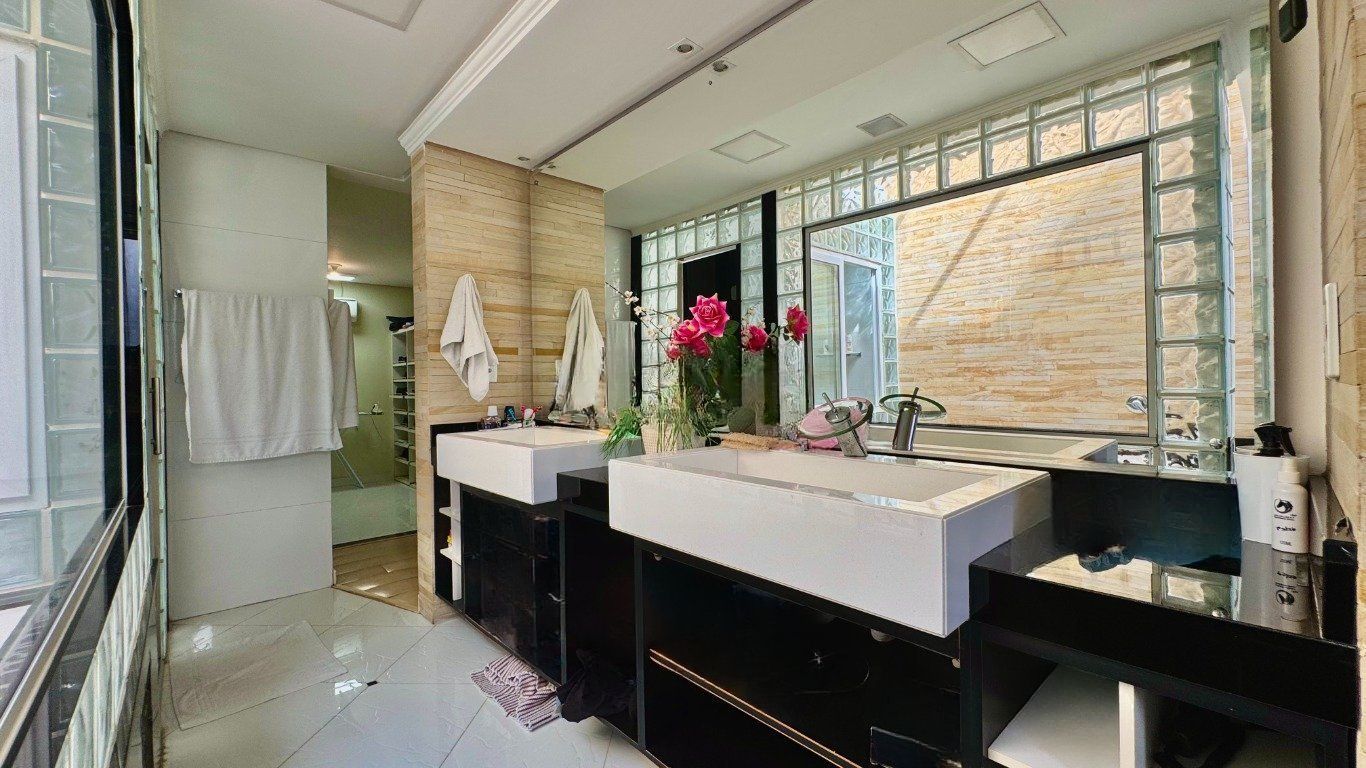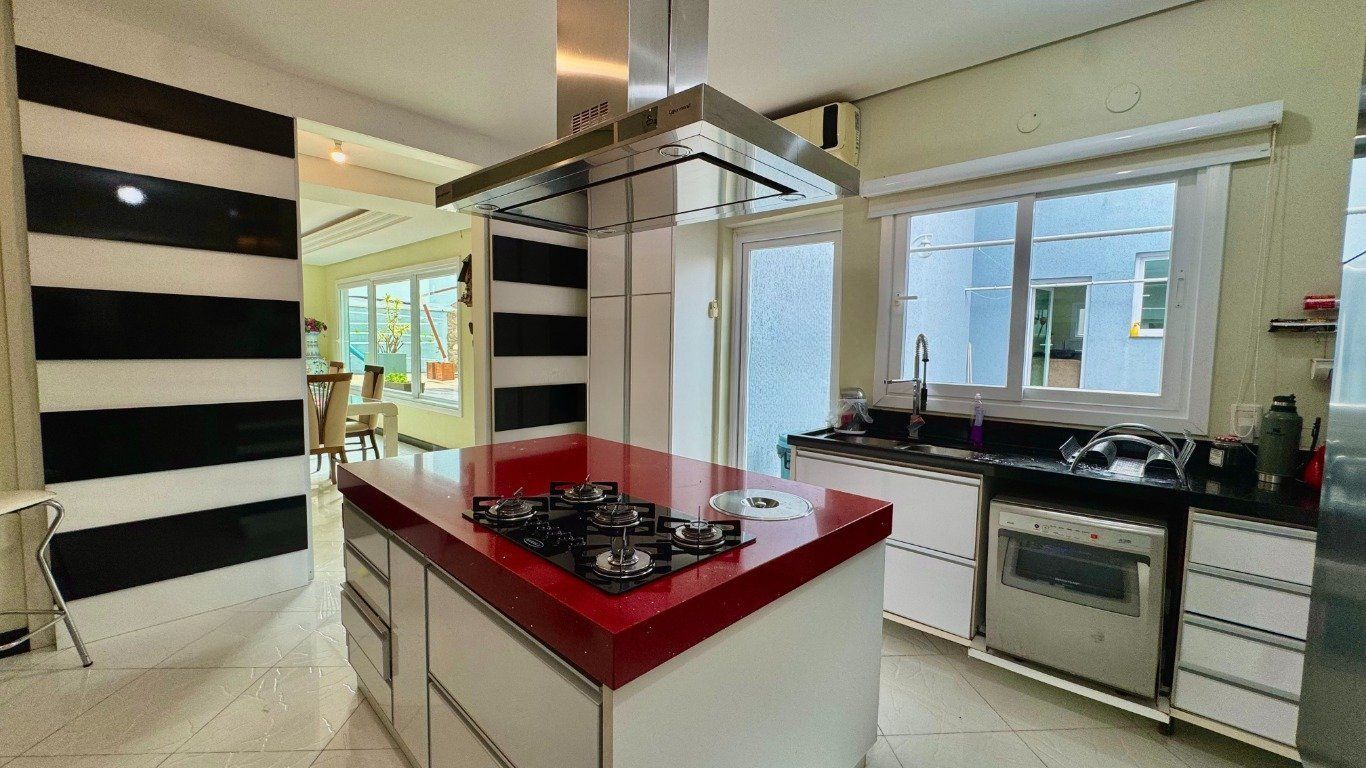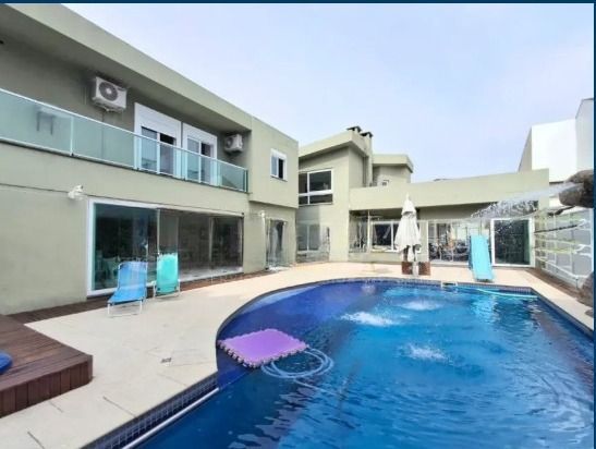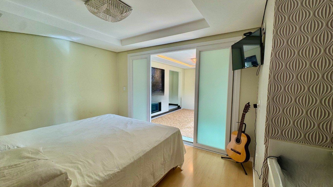 Ao entrar, você é recebido por um amplo living com dois ambientes, lareira e uma vista encantadora, além de sala de jantar, lavabo, área de serviço prática e bem distribuída, e uma cozinha mobiliada com ilha, funcional e moderna, que se conecta com a área externa, onde o destaque fica por conta do espaço de lazer privativo: piscina com cascata, banheira de hidromassagem, churrasqueira e um salão gourmet completo com parrilla, tudo isso com total privacidade.